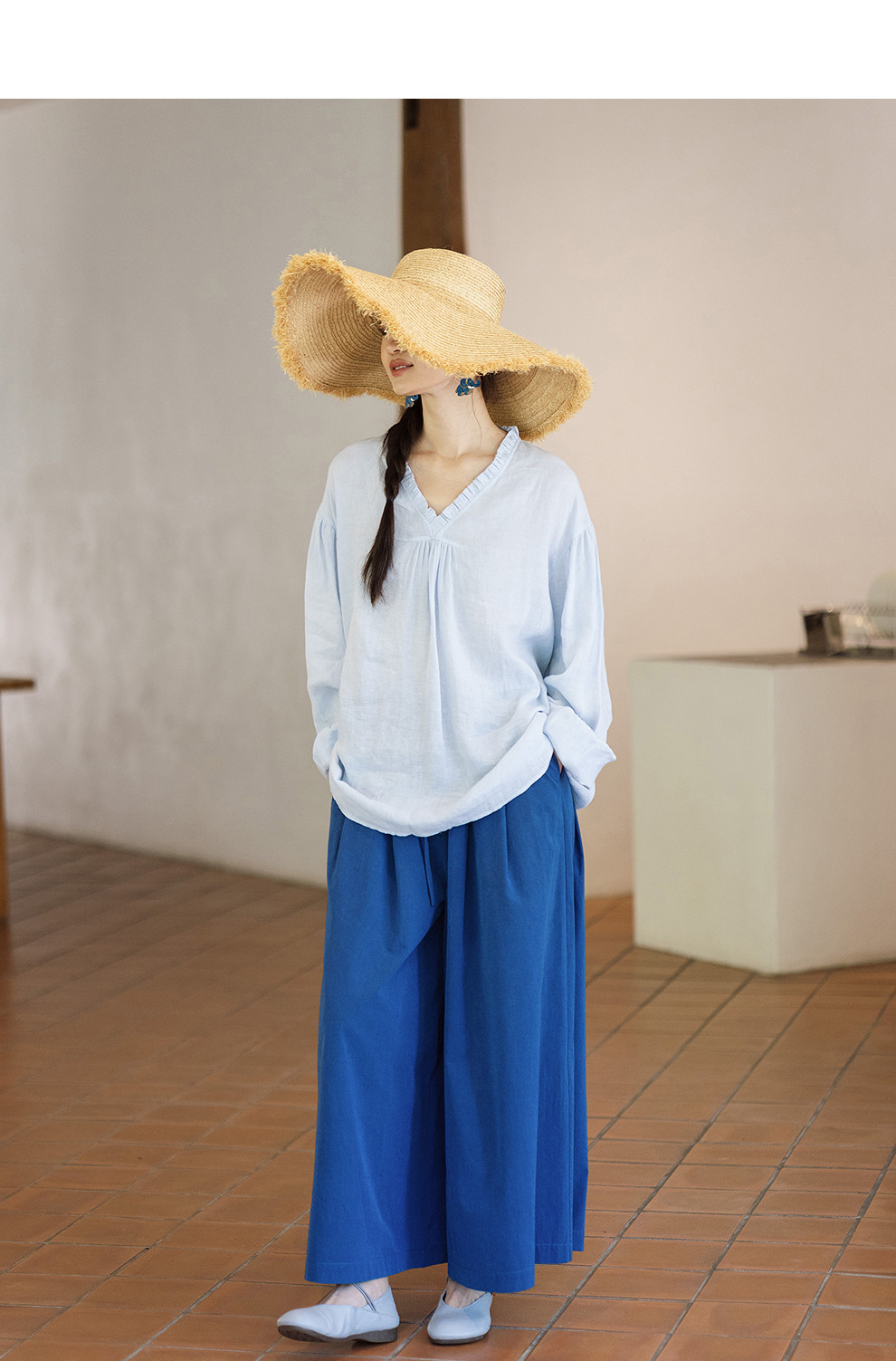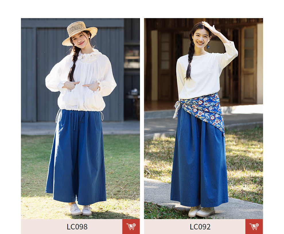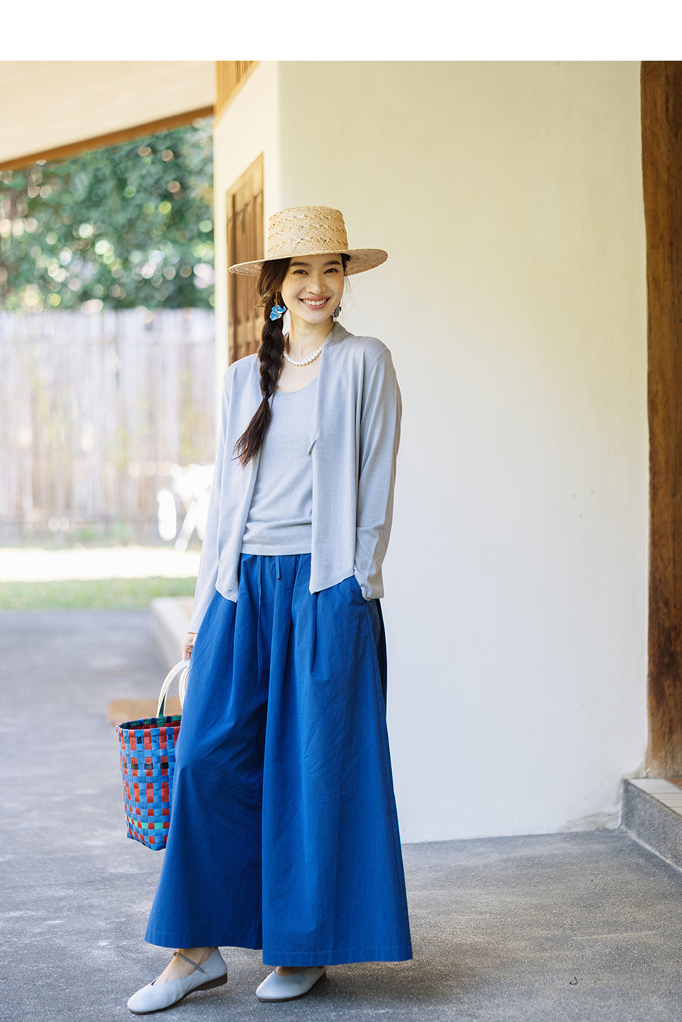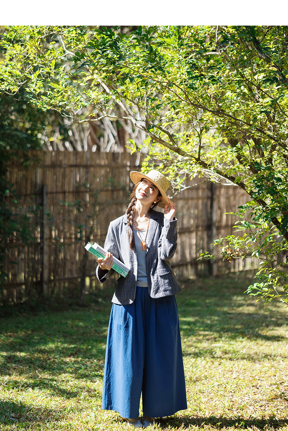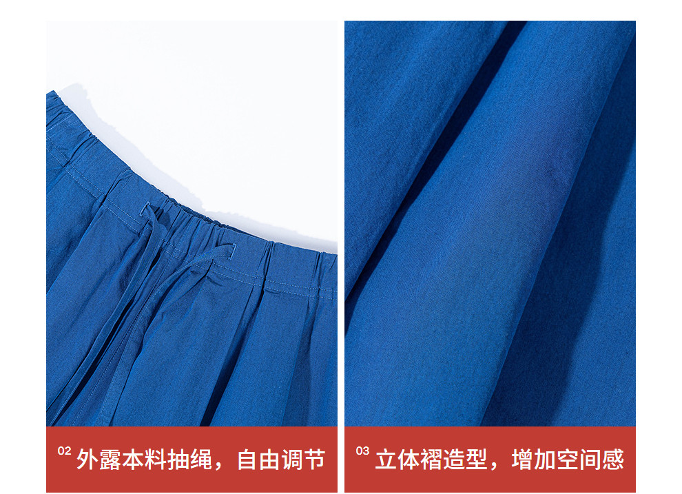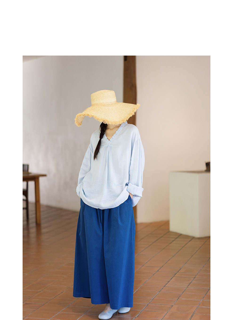 绽放113朵/蓝-艺术家*纯棉色织蓝宽松帅气阔腿裤全腰松紧百搭长裤