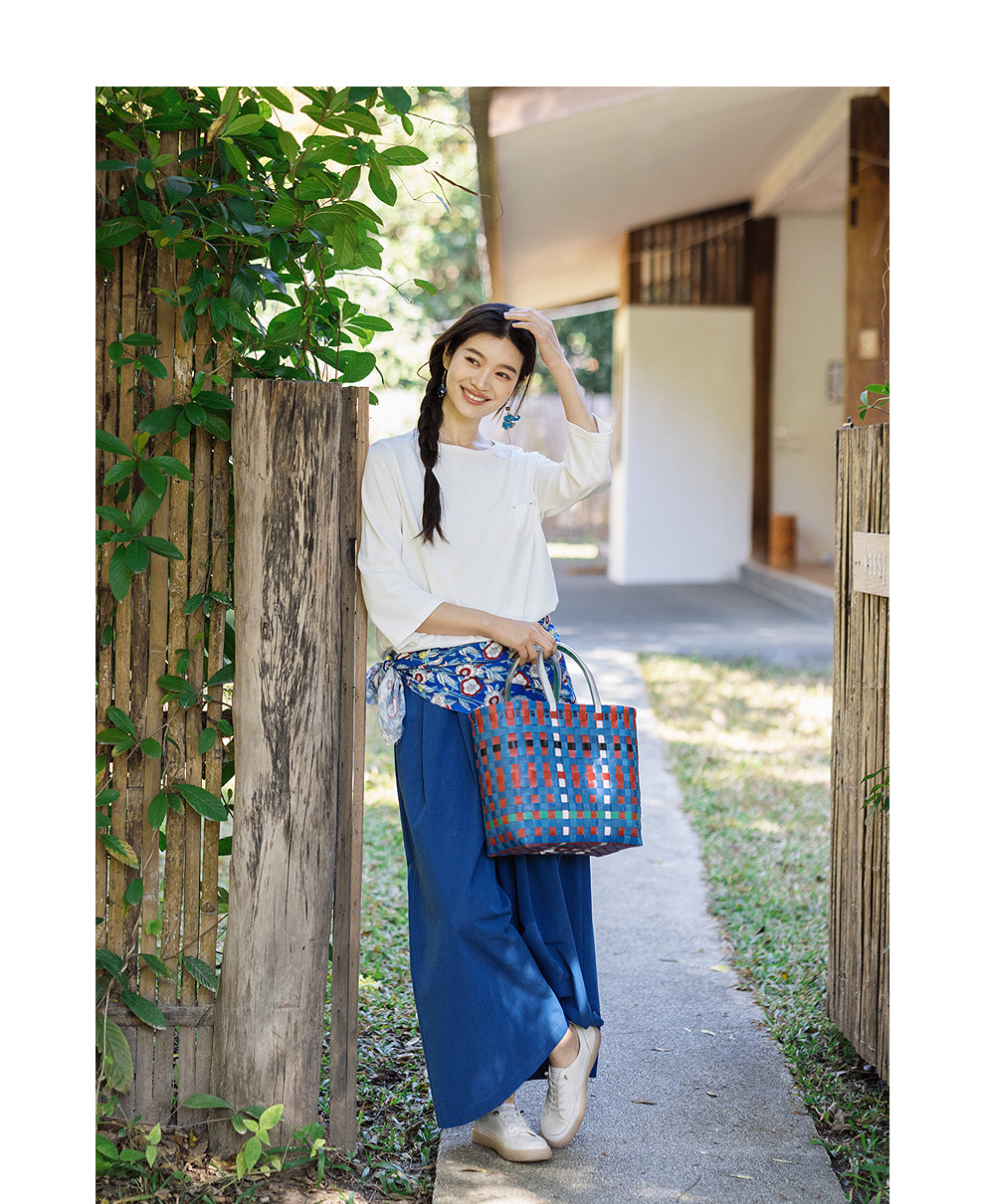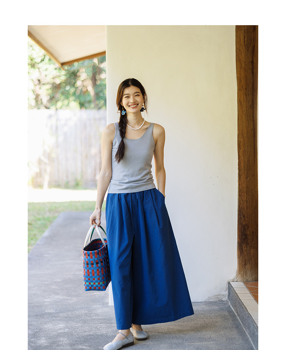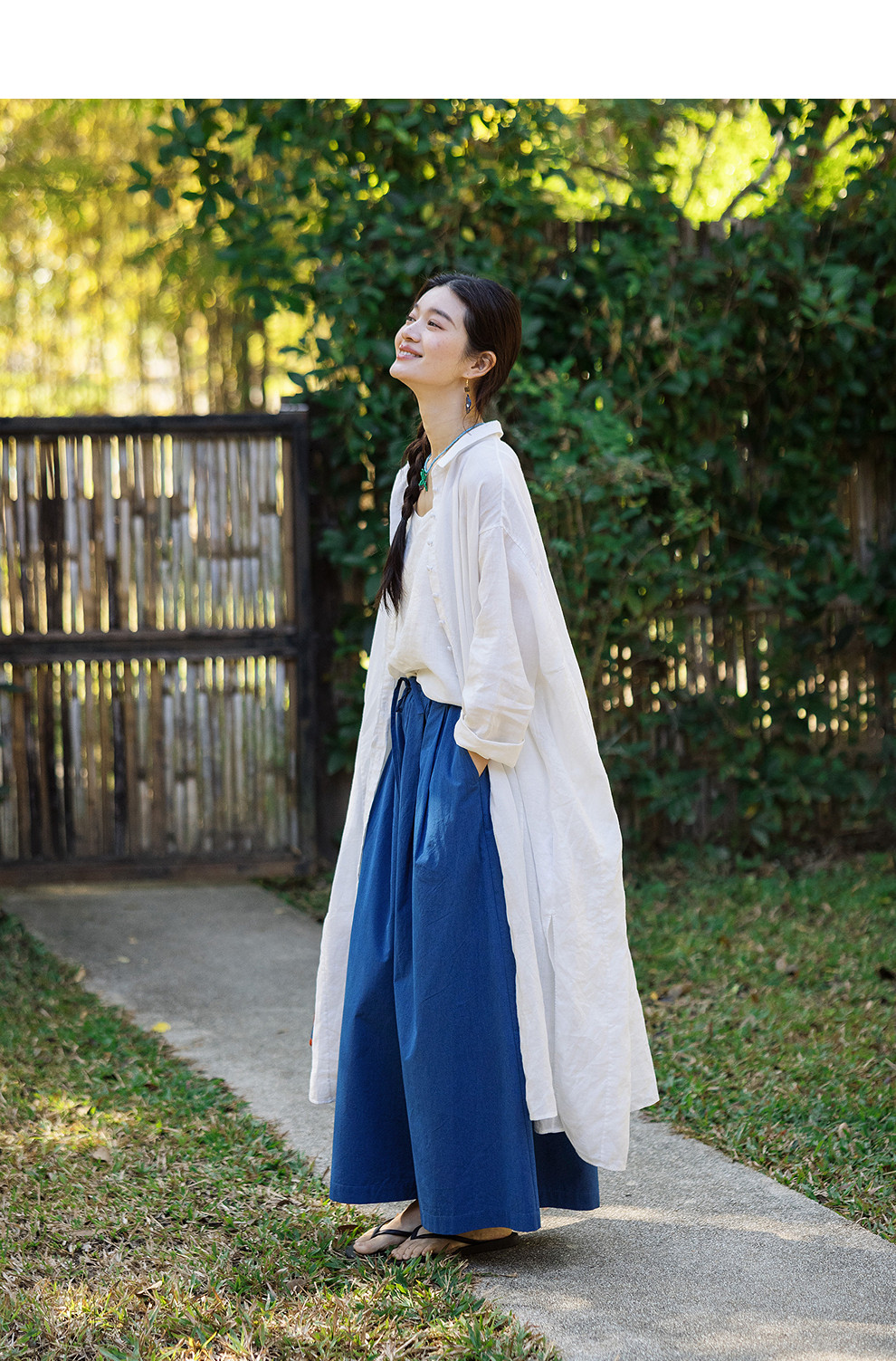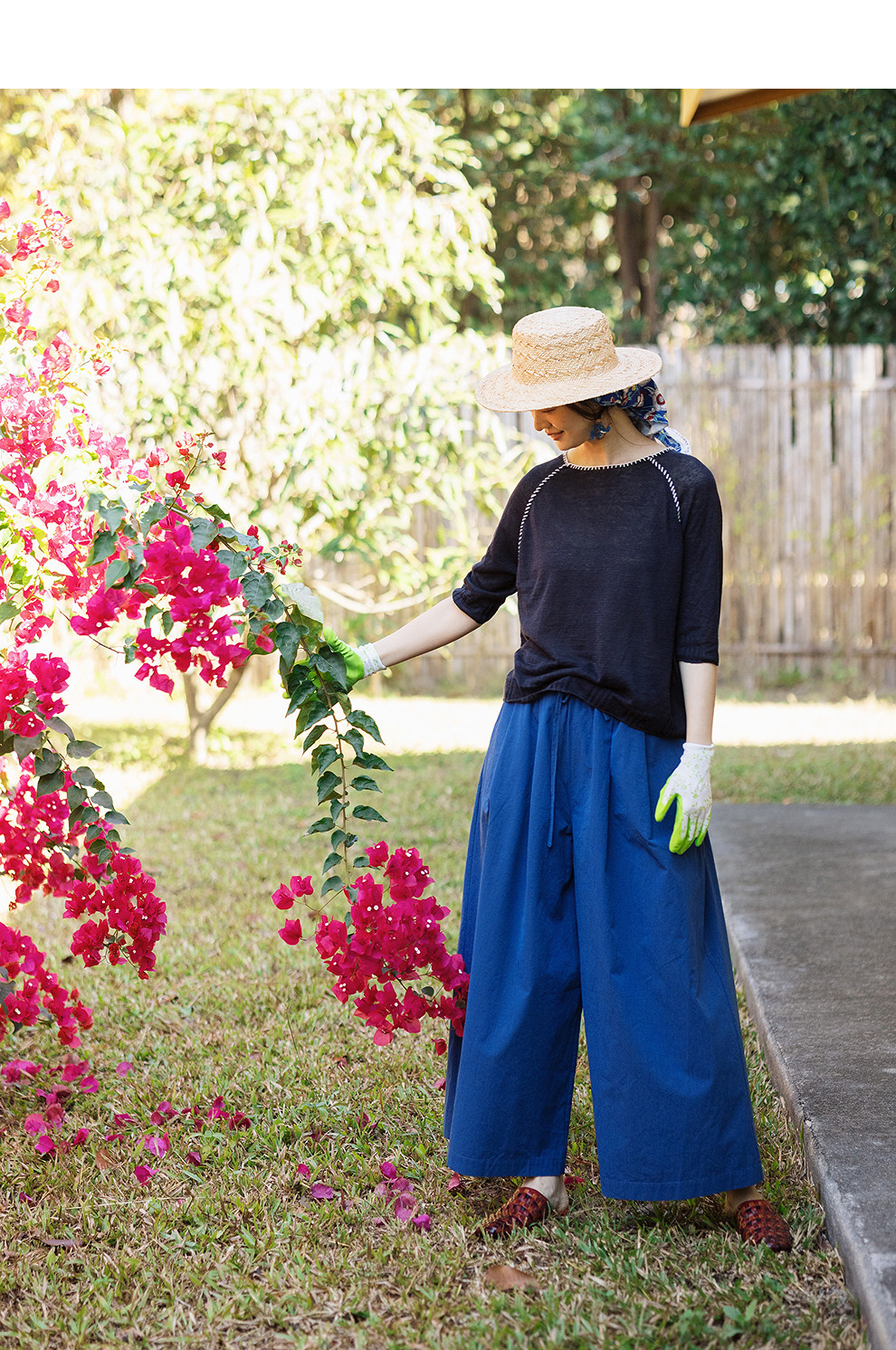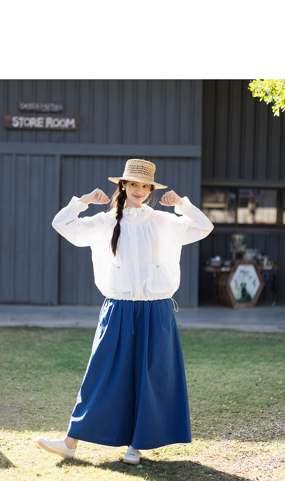 绽放113朵/蓝-艺术家*纯棉色织蓝宽松帅气阔腿裤全腰松紧百搭长裤
