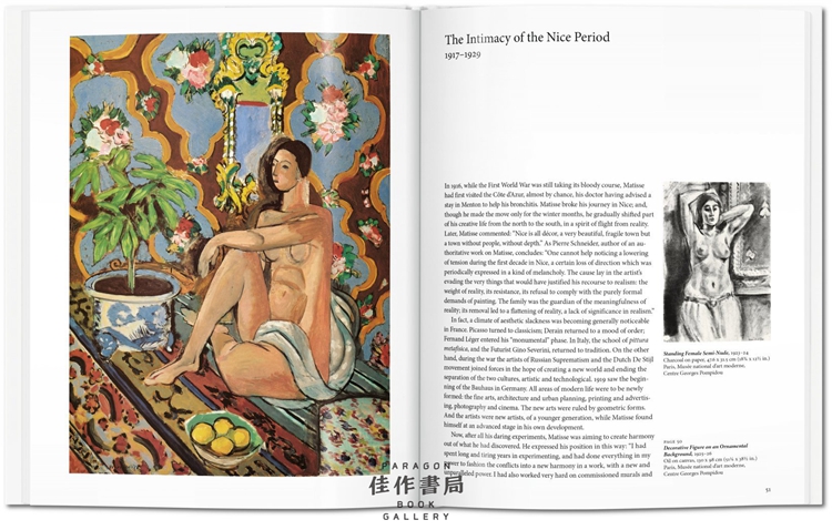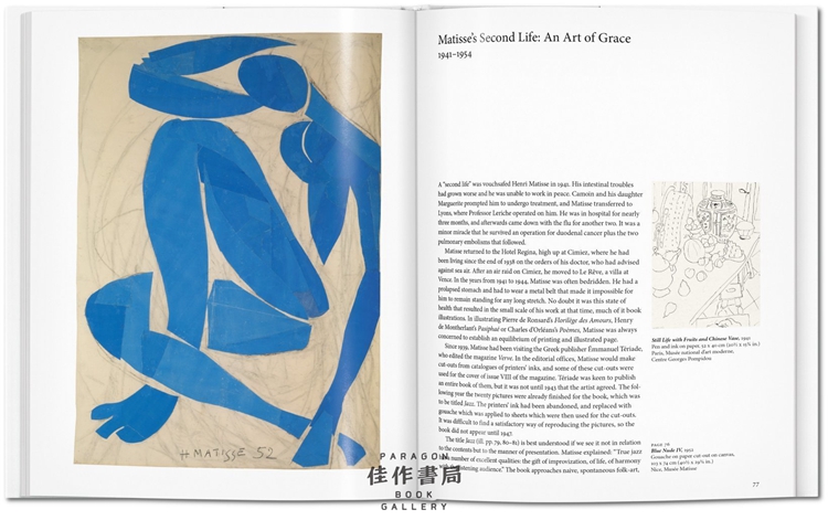 这本图文并茂的出版物内容全面且信息丰富,是与马蒂斯遗产管理方密切合作修订而成的。书中包含了创作草图、全页复制品和放大的细节图,展现了这位艺术家富有探索精神的艺术历程——从他野兽派时期的色彩辉煌,一直到他80岁高龄时发明的水粉剪纸艺术。每一幅图像都经过精心复制,营造出配得上这位卓越表现主义艺术家的观赏体验。这位色彩的吟游诗人理应得到这样的对待。