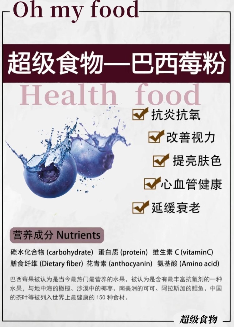 巴西莓是一种棕榈科植物含有丰富的花青素(含量是蓝莓的5倍)、抗氧化能力是奇异果的90倍!含有丰富的多酚,有助于视力保护含有大量的健康脂肪酸,有助于降低三高含有大量的黄酮,有助于抗炎!