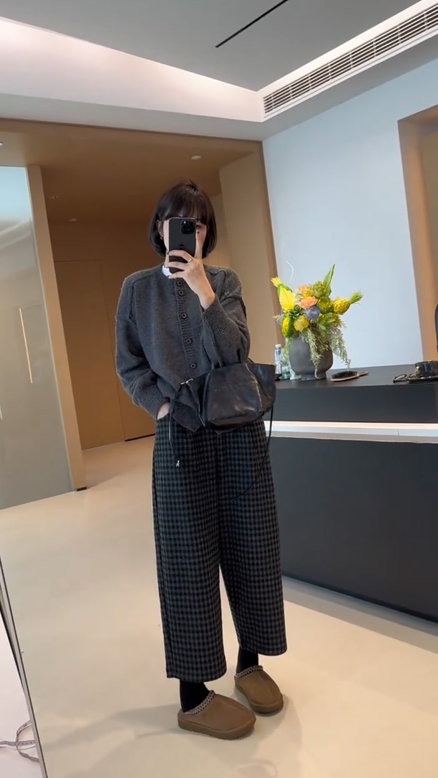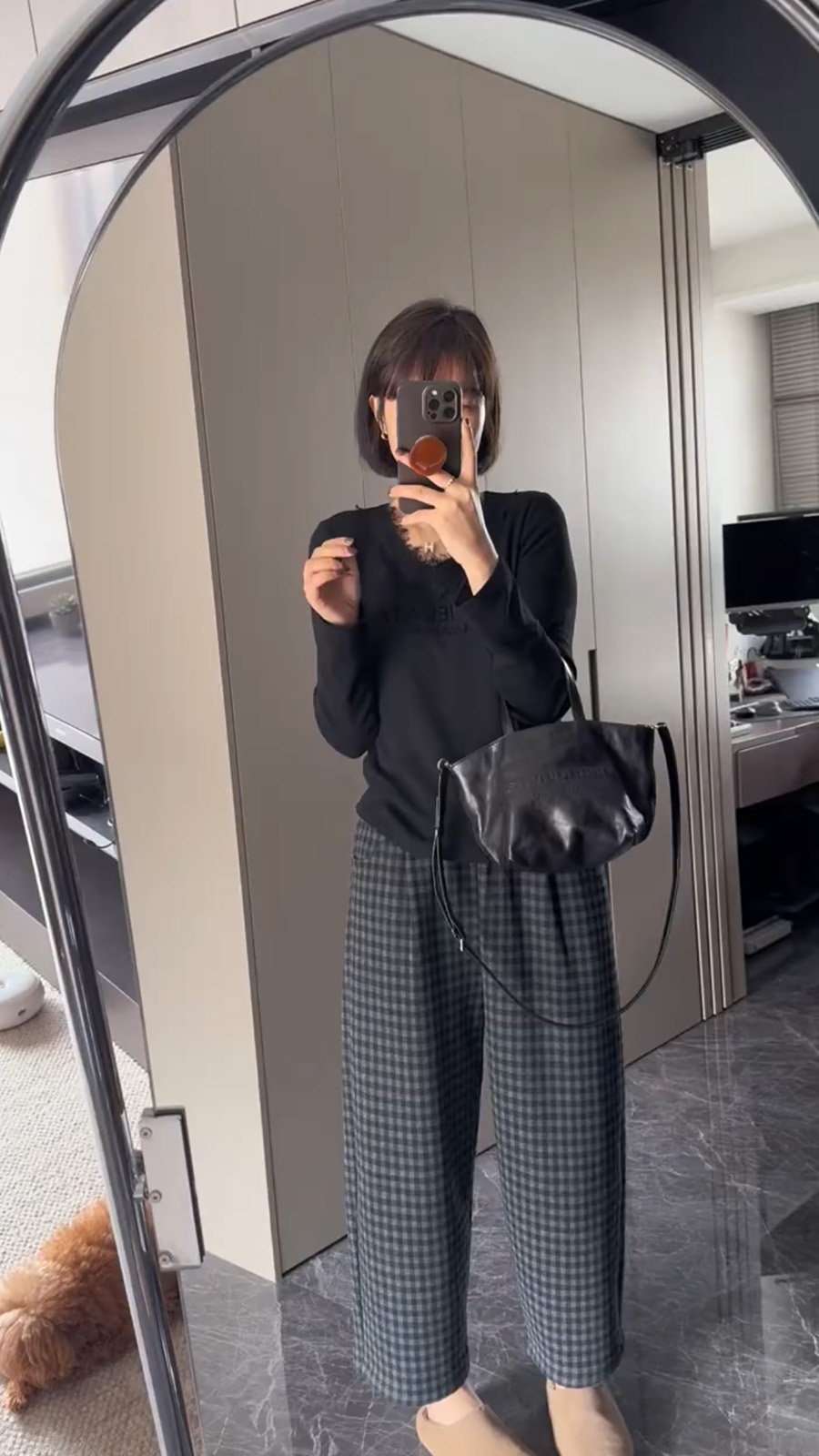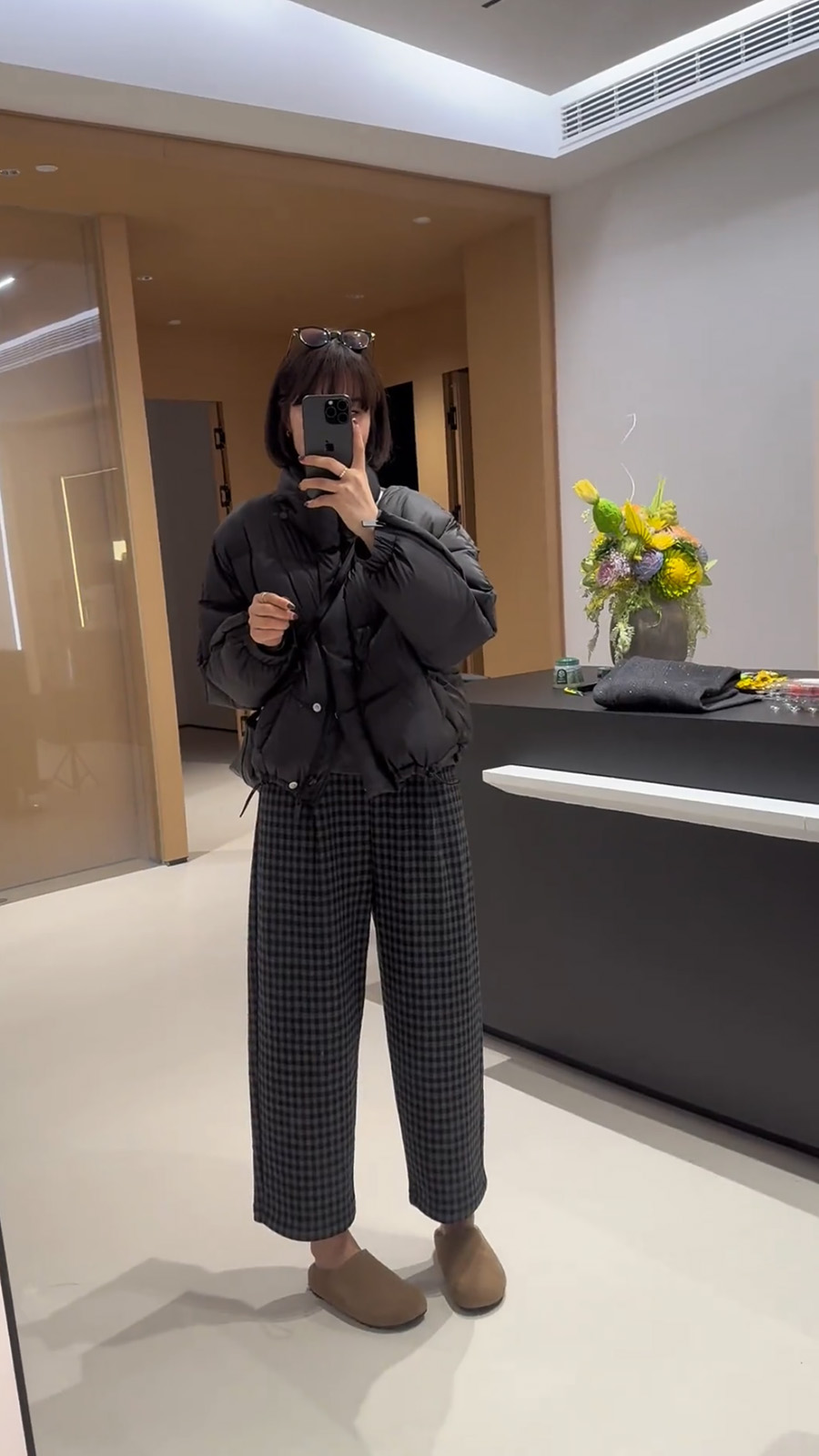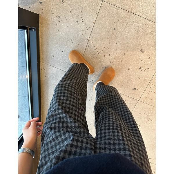 黑灰毛呢格纹九分裤!2025女简约秋冬加绒松紧腰复古休闲显瘦格子裤!