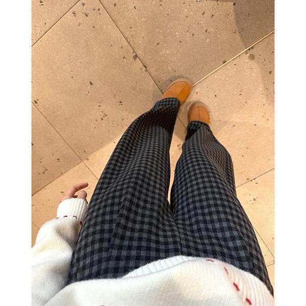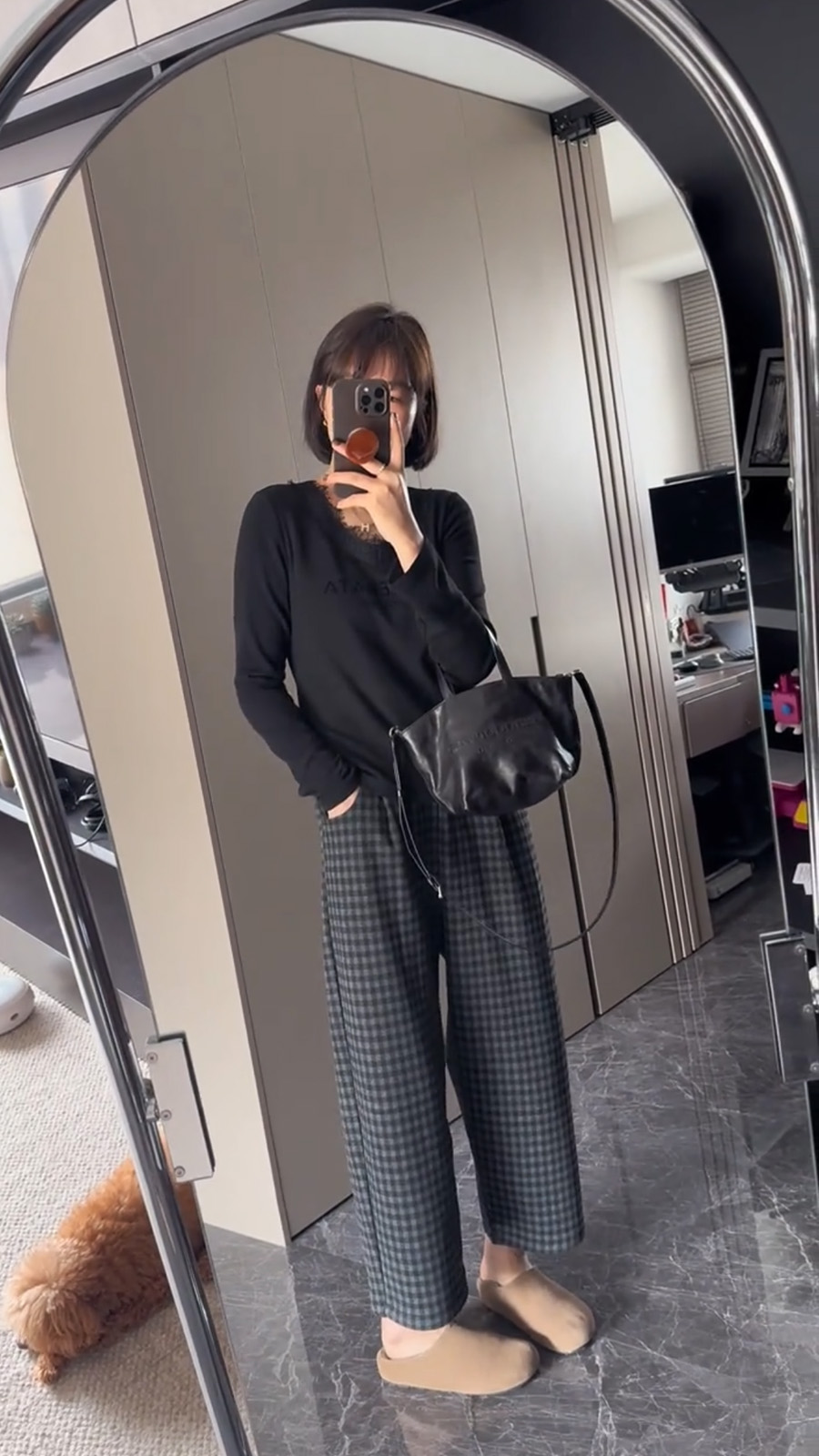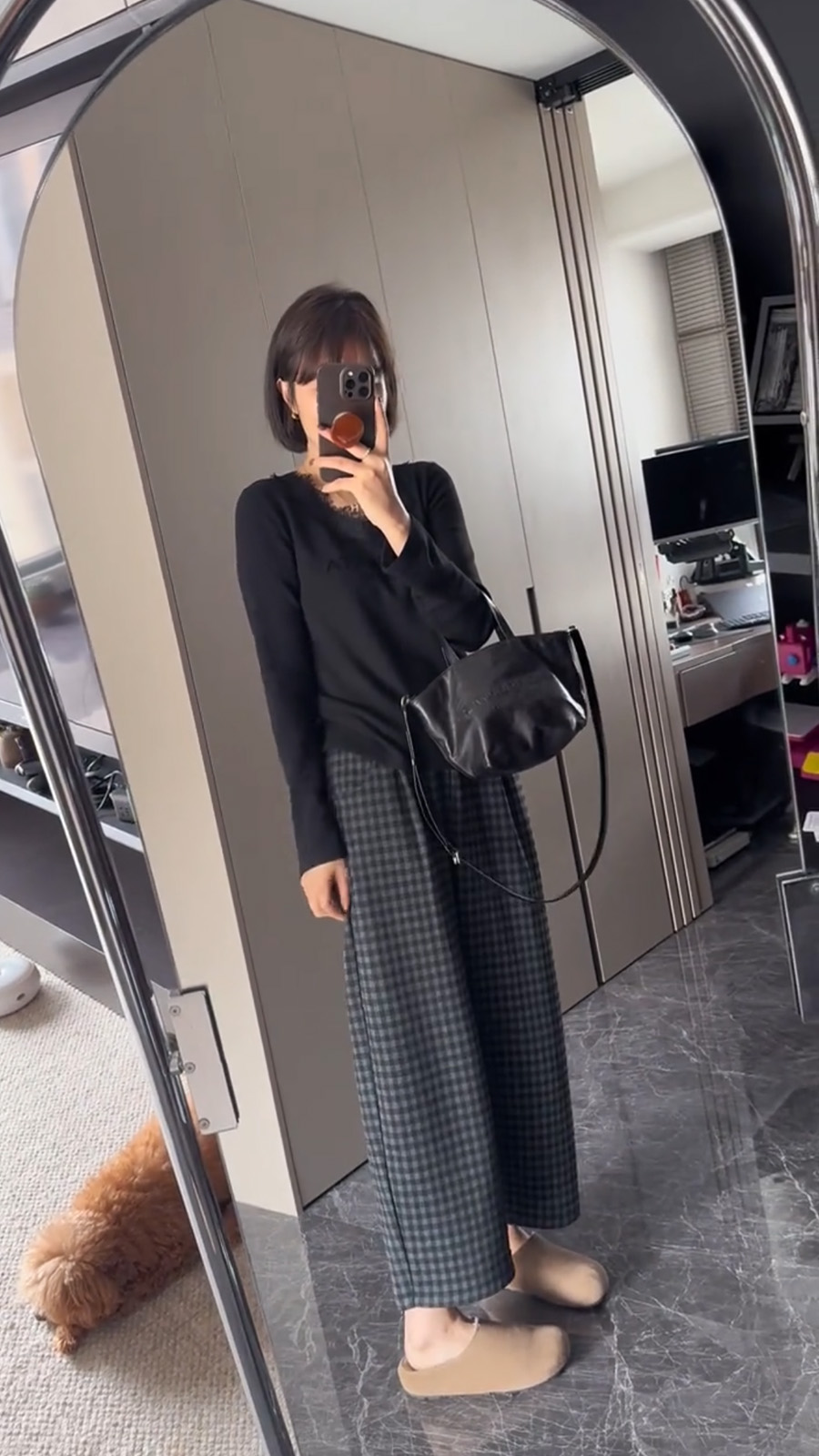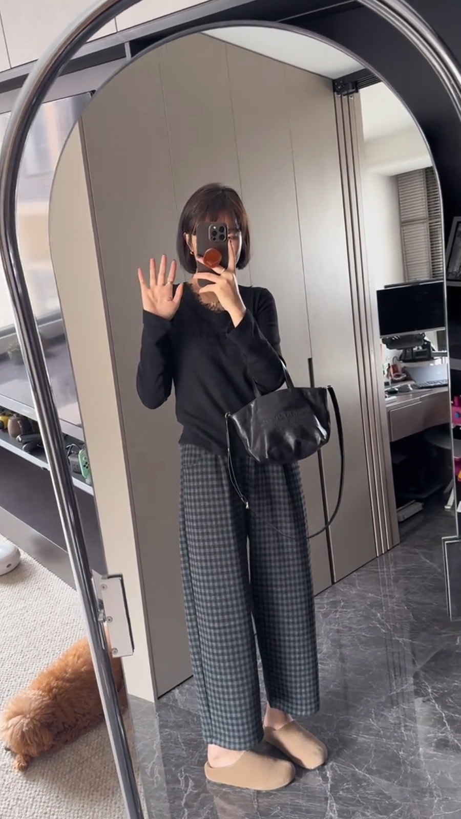 黑灰毛呢格纹九分裤!2025女简约秋冬加绒松紧腰复古休闲显瘦格子裤!