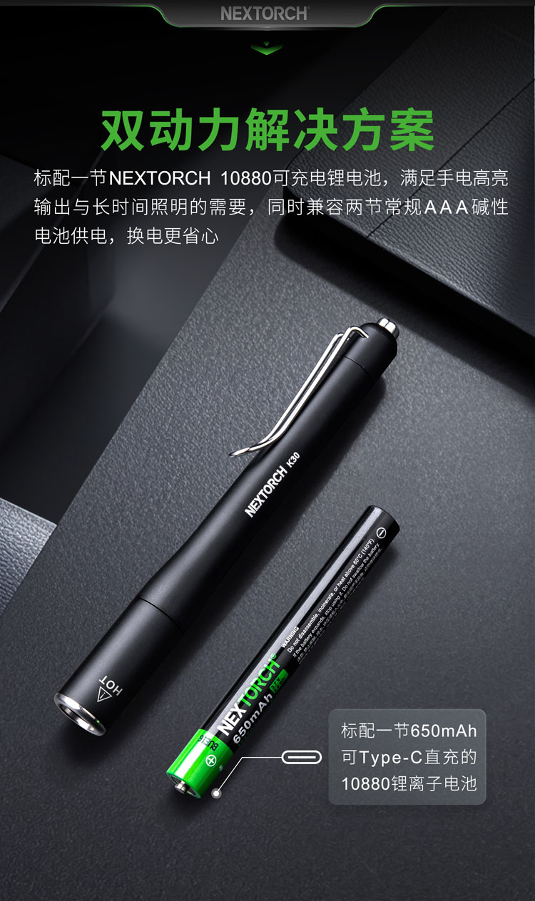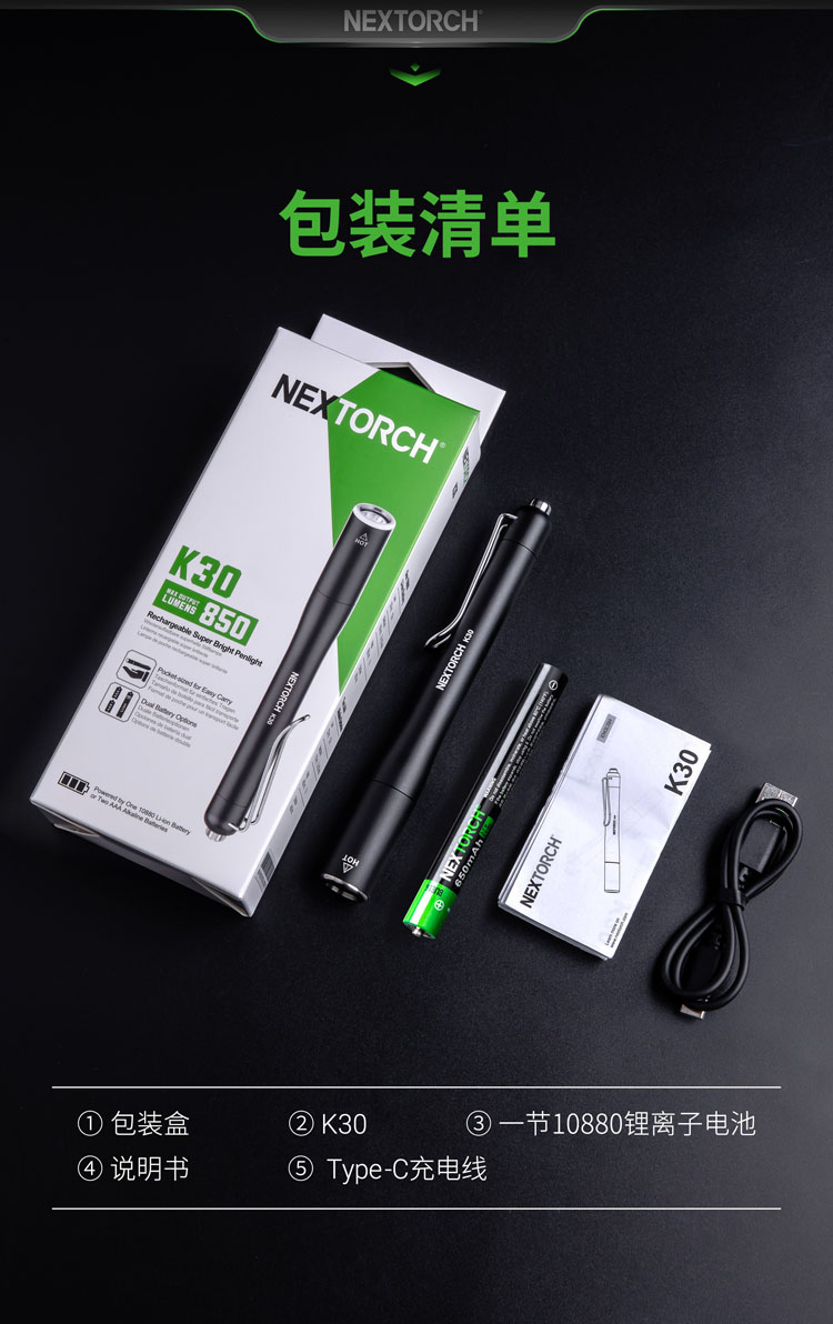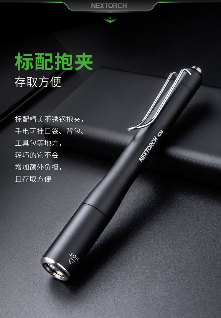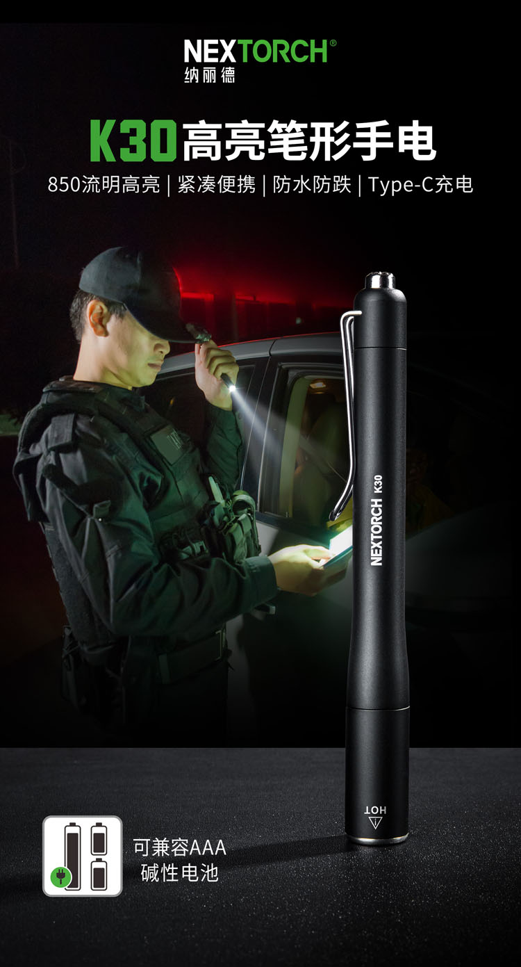 纳丽德 K30笔形手电办公便携900流明可充电双动力版本