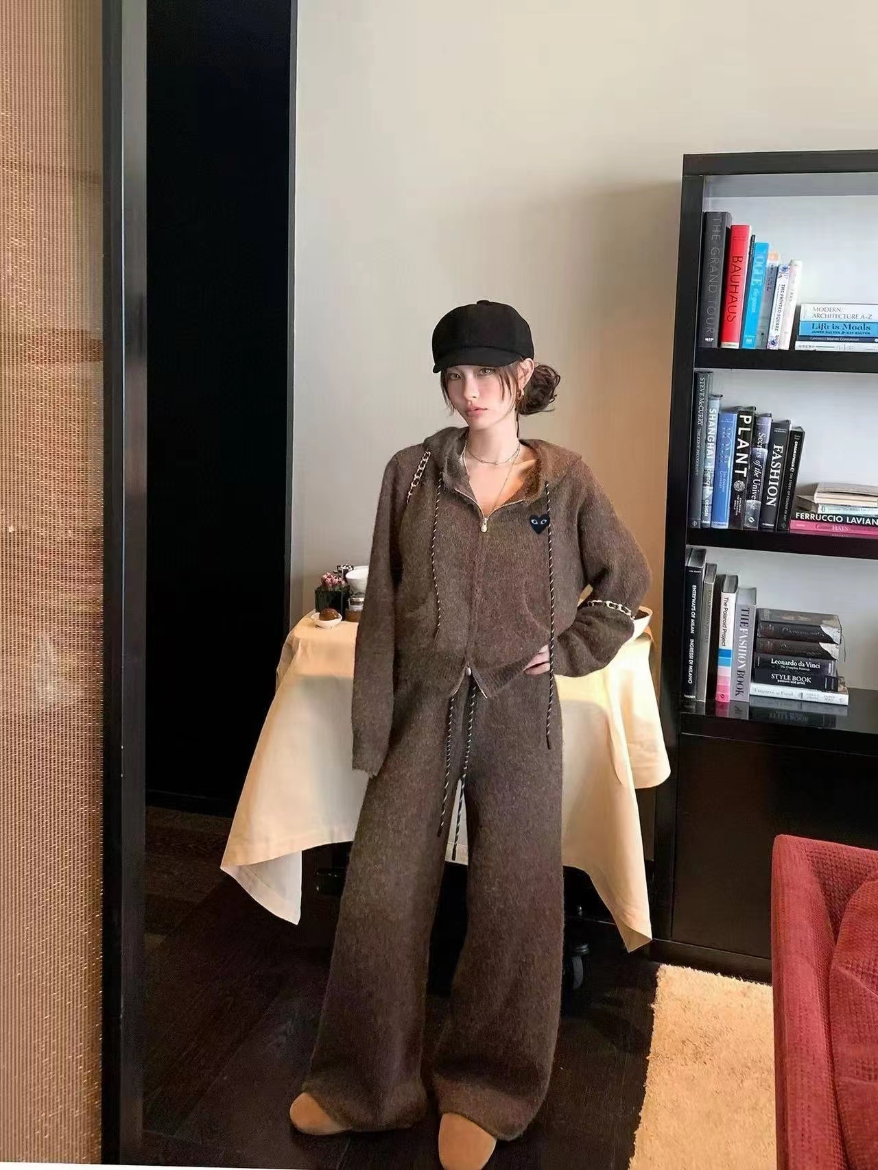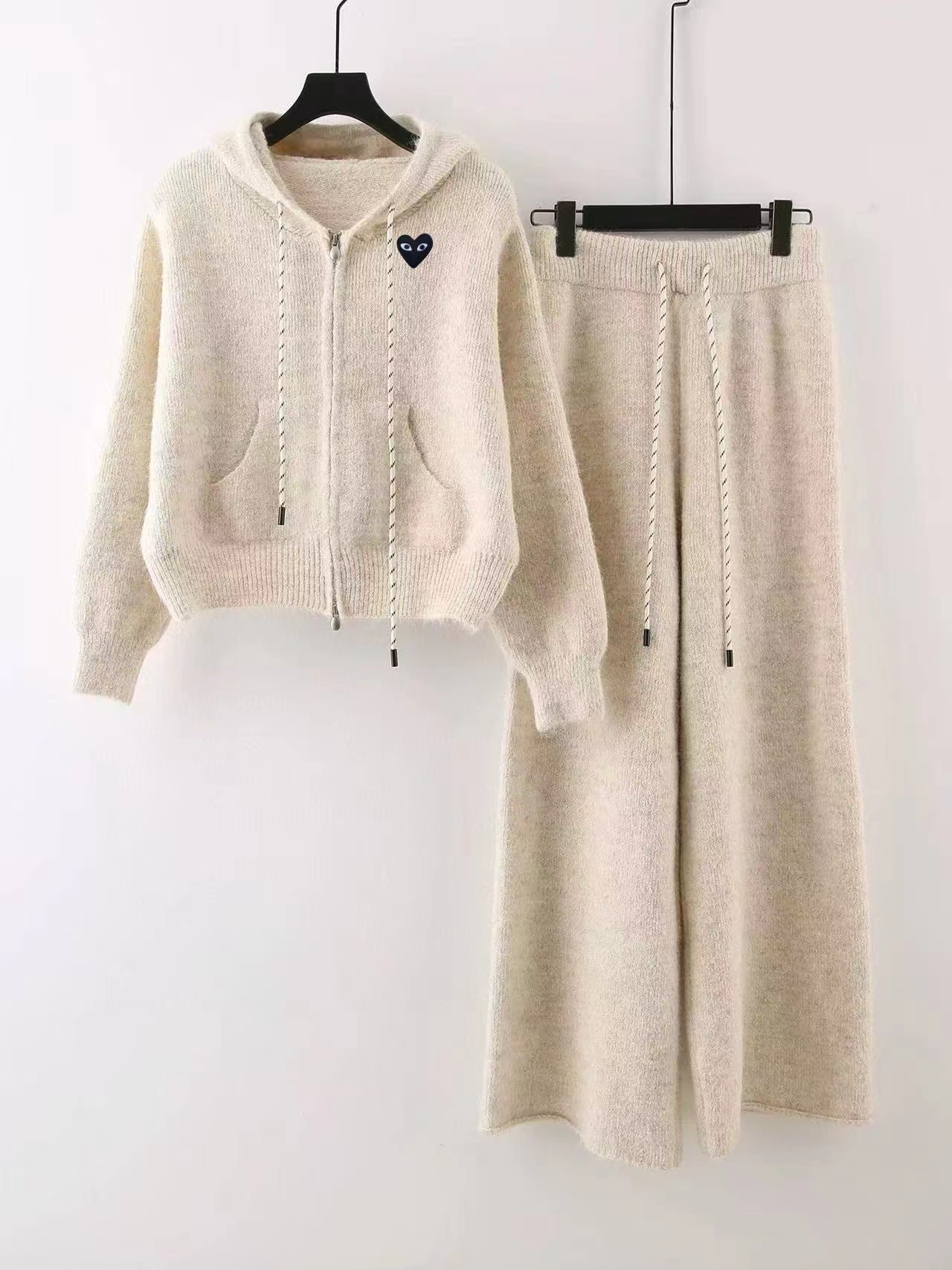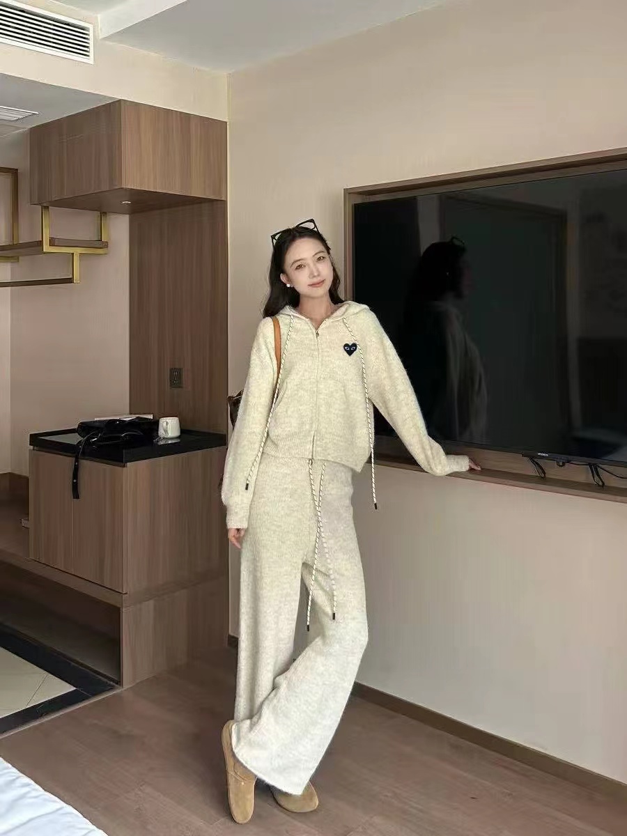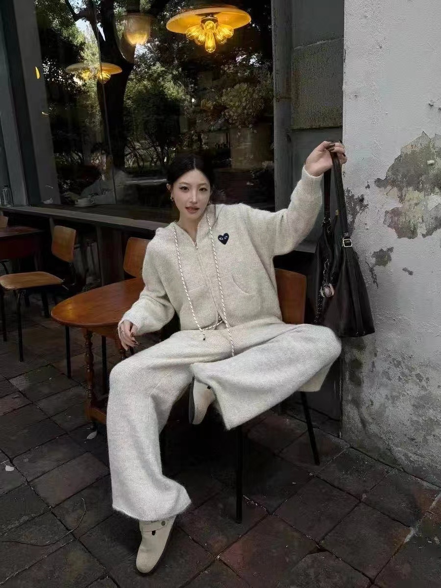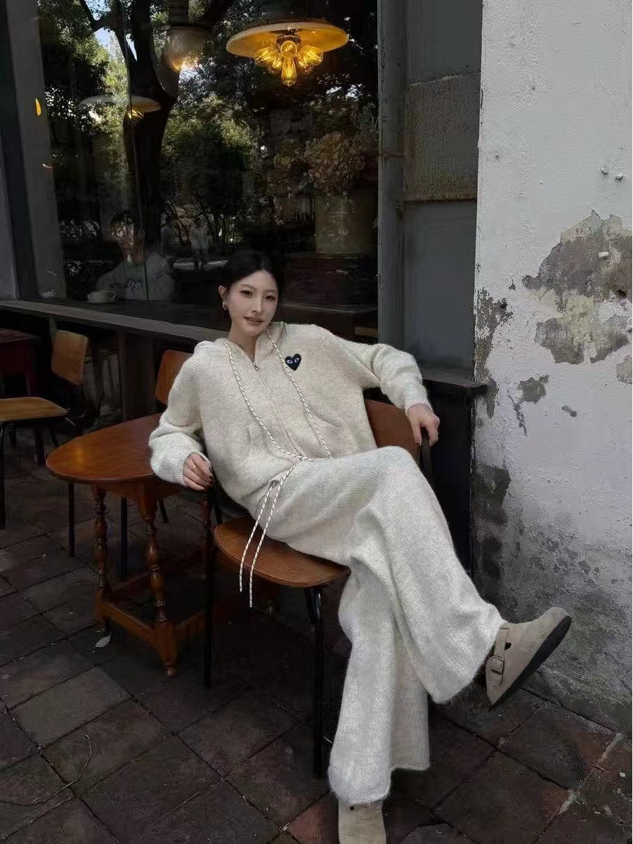 针织连帽套装,整体是温柔又松弛的风格,很适合日常休闲或者居家穿着。是一件拉链款的连帽针织衫,版型宽松,带两个前口袋,抽绳用了带缝线装饰的设计,左胸口还有一颗小巧的黑色爱心装饰,增添了可爱感。是同色系的阔腿针织裤,高腰设计,抽绳和上衣做了呼应,裤型垂顺宽松,对身材的包容度很高。整套衣服的针织质感看起来柔软亲肤,颜色干净温柔,既有慵懒随性的氛围,又因为爱心装饰和细节抽绳多了点精zhi感,是很适合打造“松弛感穿搭”的一套