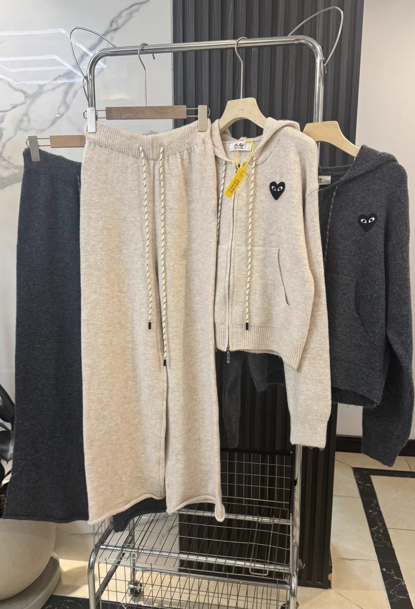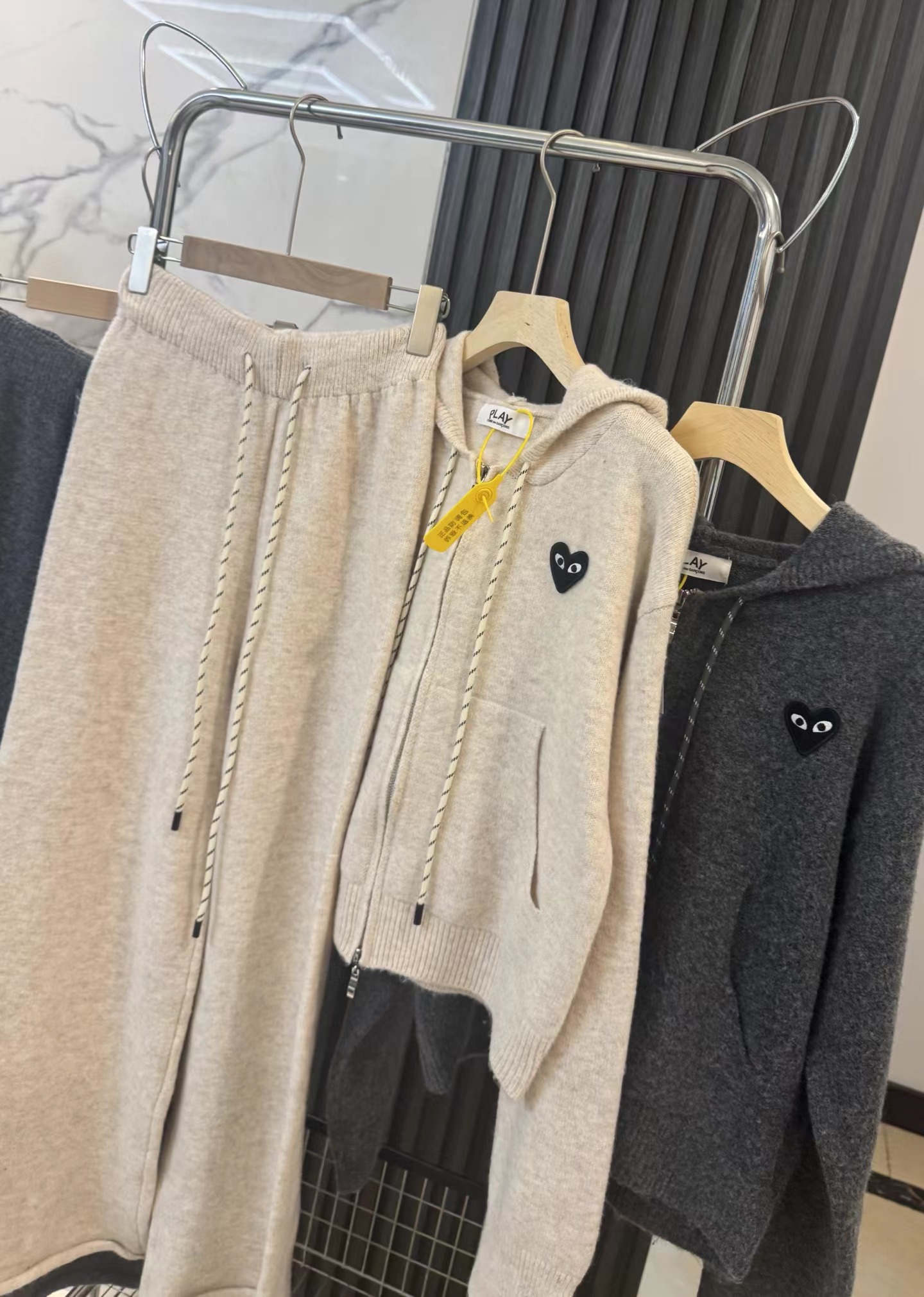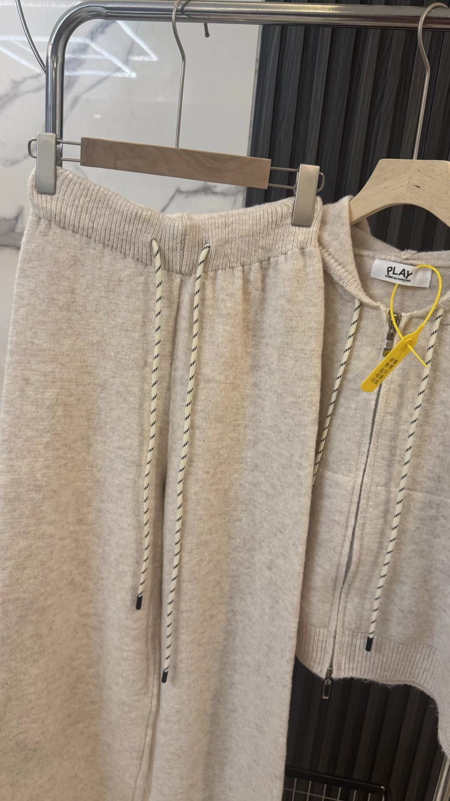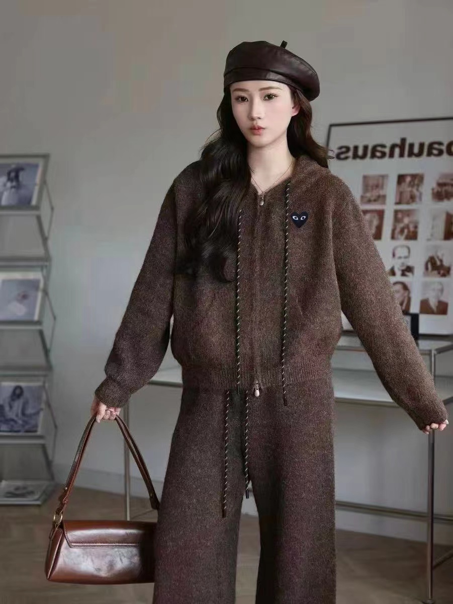 针织连帽套装,整体是温柔又松弛的风格,很适合日常休闲或者居家穿着。是一件拉链款的连帽针织衫,版型宽松,带两个前口袋,抽绳用了带缝线装饰的设计,左胸口还有一颗小巧的黑色爱心装饰,增添了可爱感。是同色系的阔腿针织裤,高腰设计,抽绳和上衣做了呼应,裤型垂顺宽松,对身材的包容度很高。整套衣服的针织质感看起来柔软亲肤,颜色干净温柔,既有慵懒随性的氛围,又因为爱心装饰和细节抽绳多了点精zhi感,是很适合打造“松弛感穿搭”的一套
