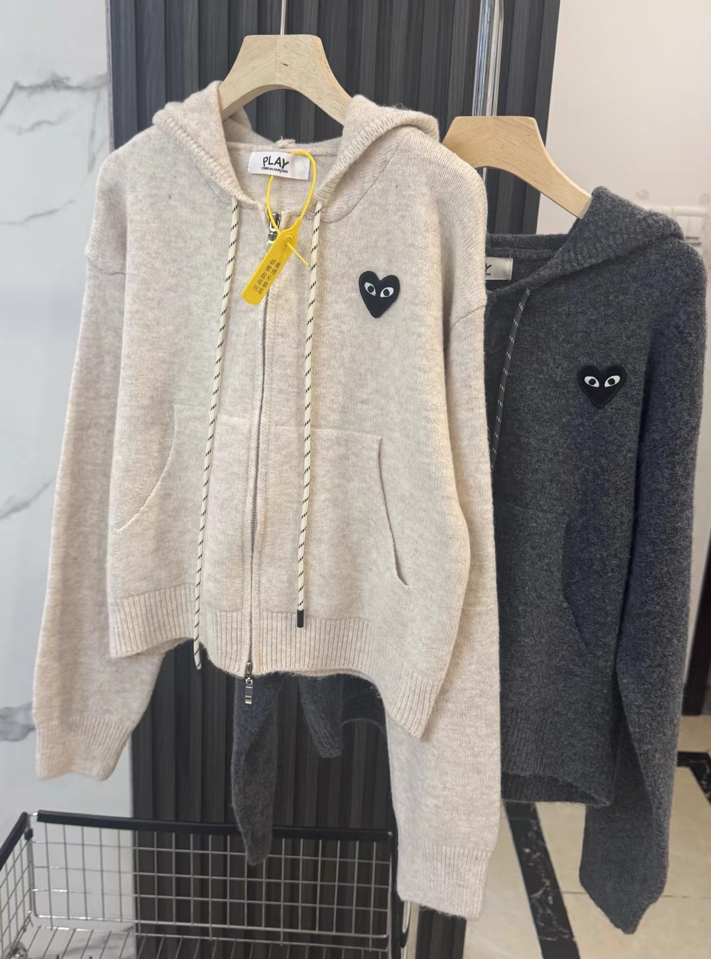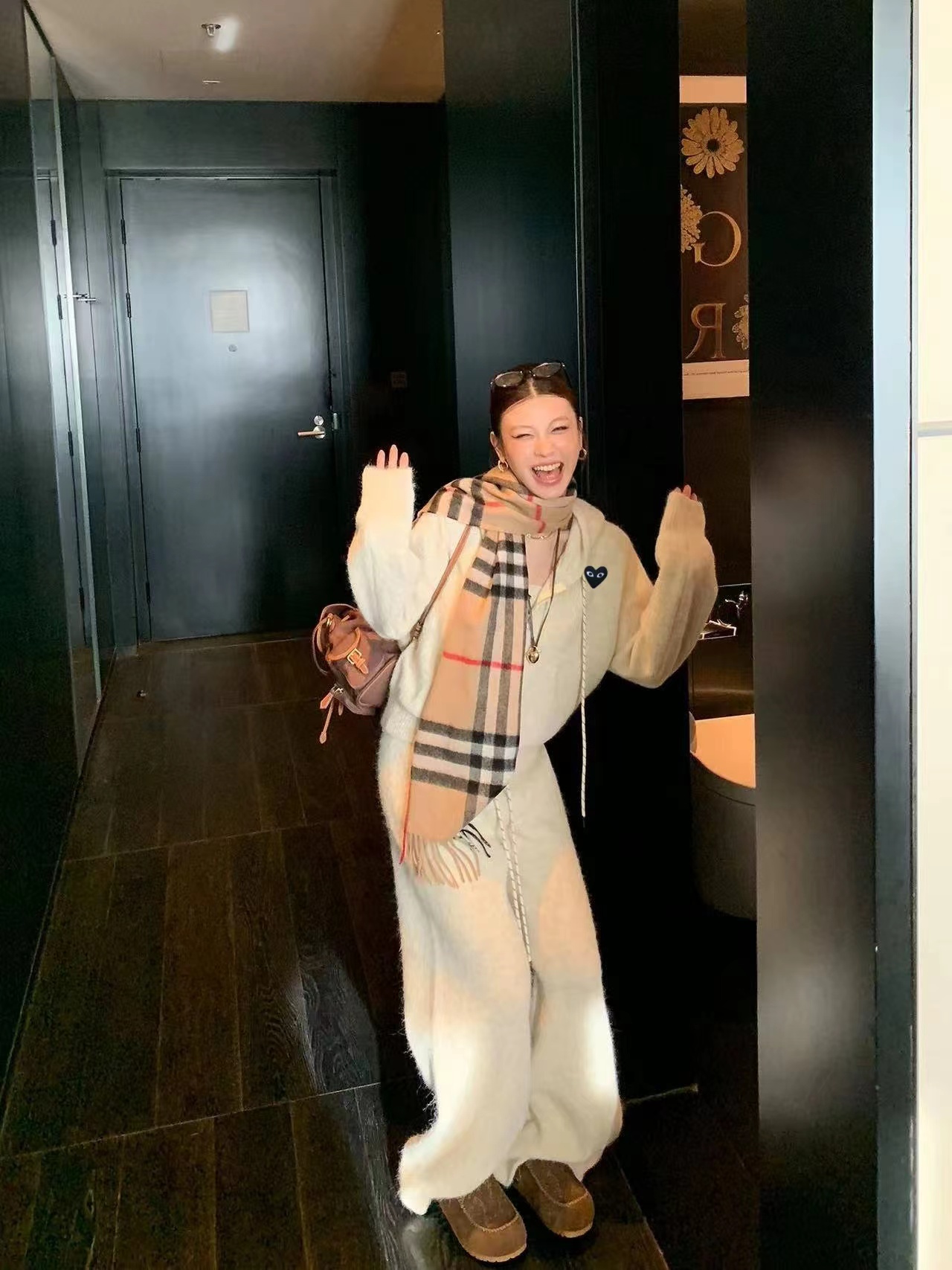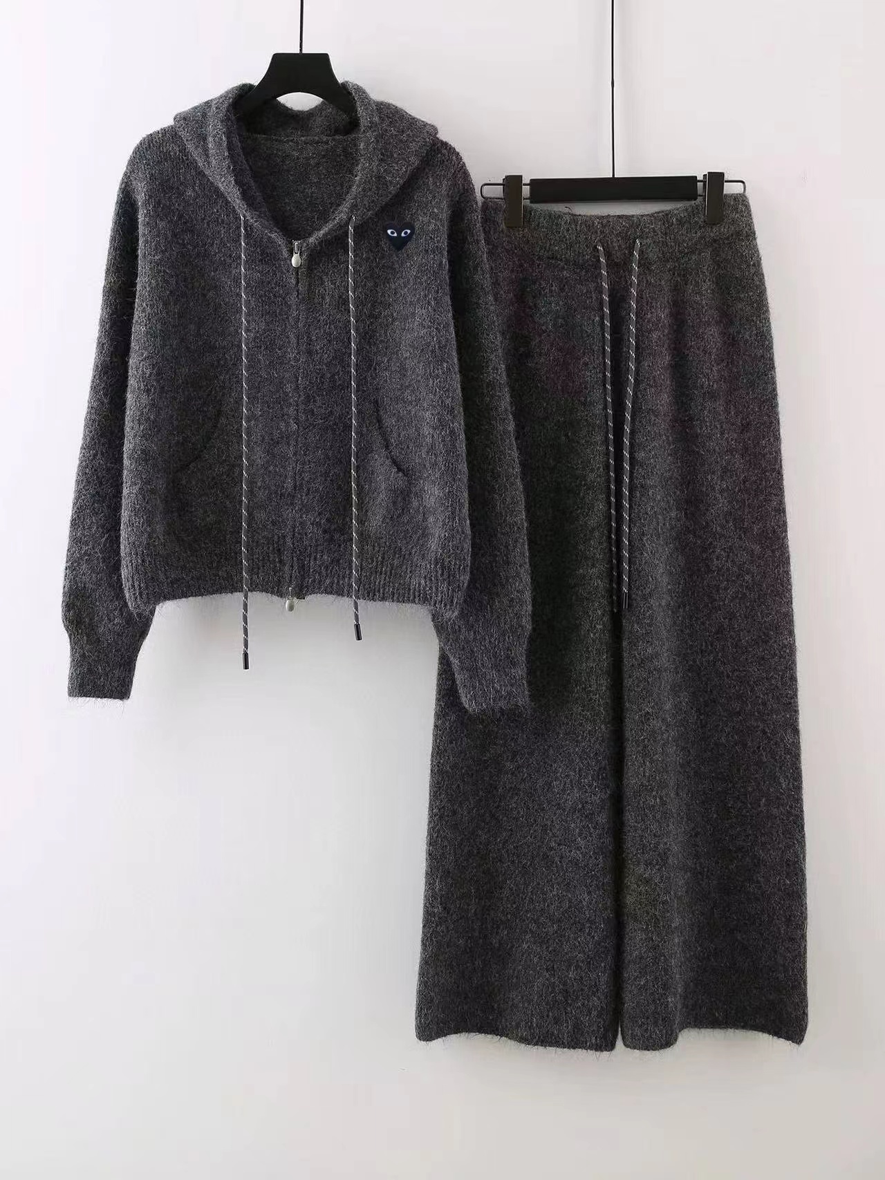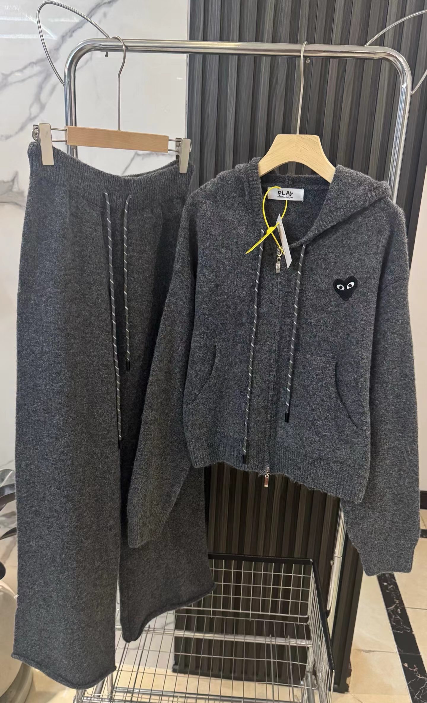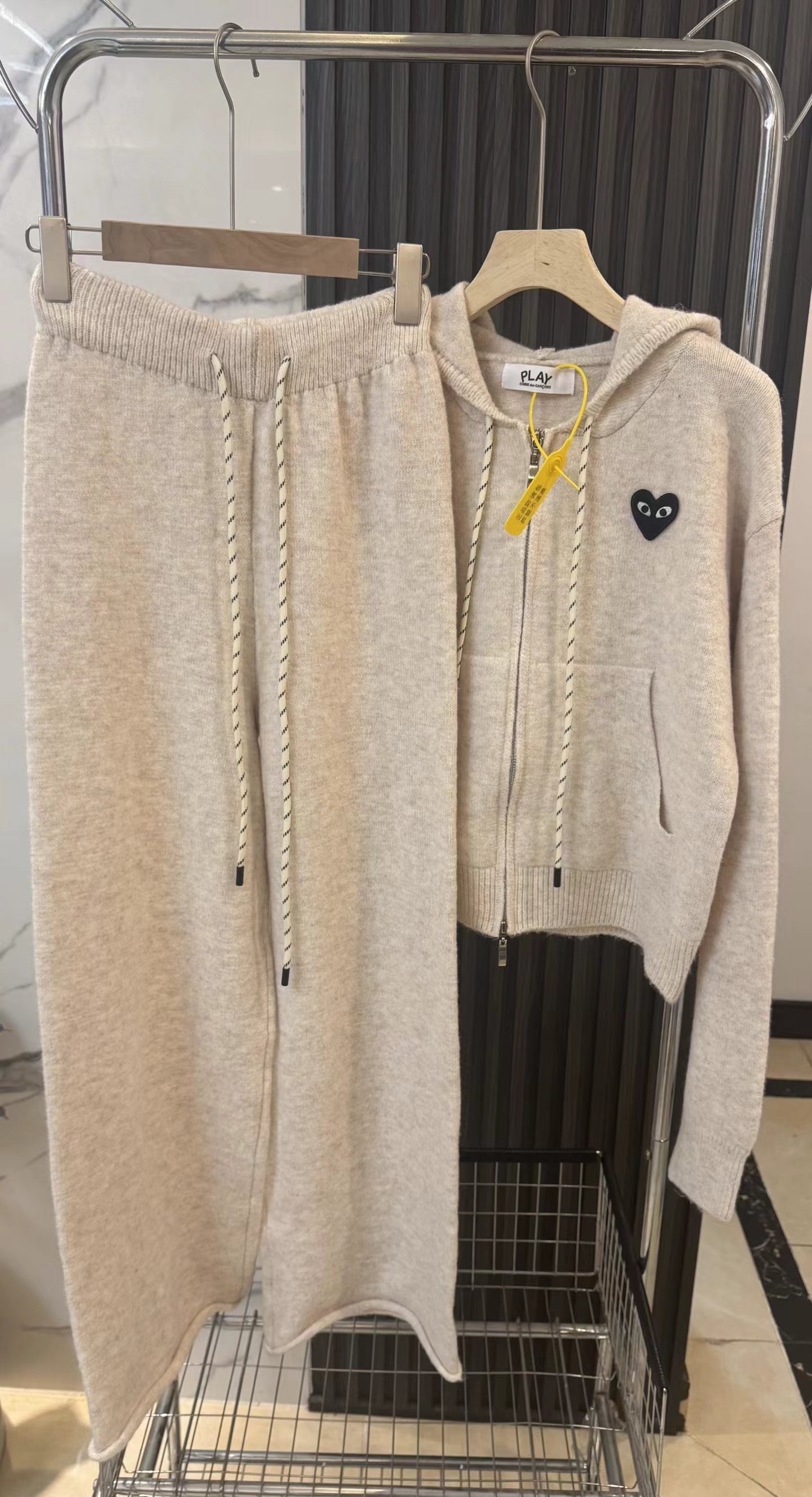 针织连帽套装,整体是温柔又松弛的风格,很适合日常休闲或者居家穿着。是一件拉链款的连帽针织衫,版型宽松,带两个前口袋,抽绳用了带缝线装饰的设计,左胸口还有一颗小巧的黑色爱心装饰,增添了可爱感。是同色系的阔腿针织裤,高腰设计,抽绳和上衣做了呼应,裤型垂顺宽松,对身材的包容度很高。整套衣服的针织质感看起来柔软亲肤,颜色干净温柔,既有慵懒随性的氛围,又因为爱心装饰和细节抽绳多了点精zhi感,是很适合打造“松弛感穿搭”的一套