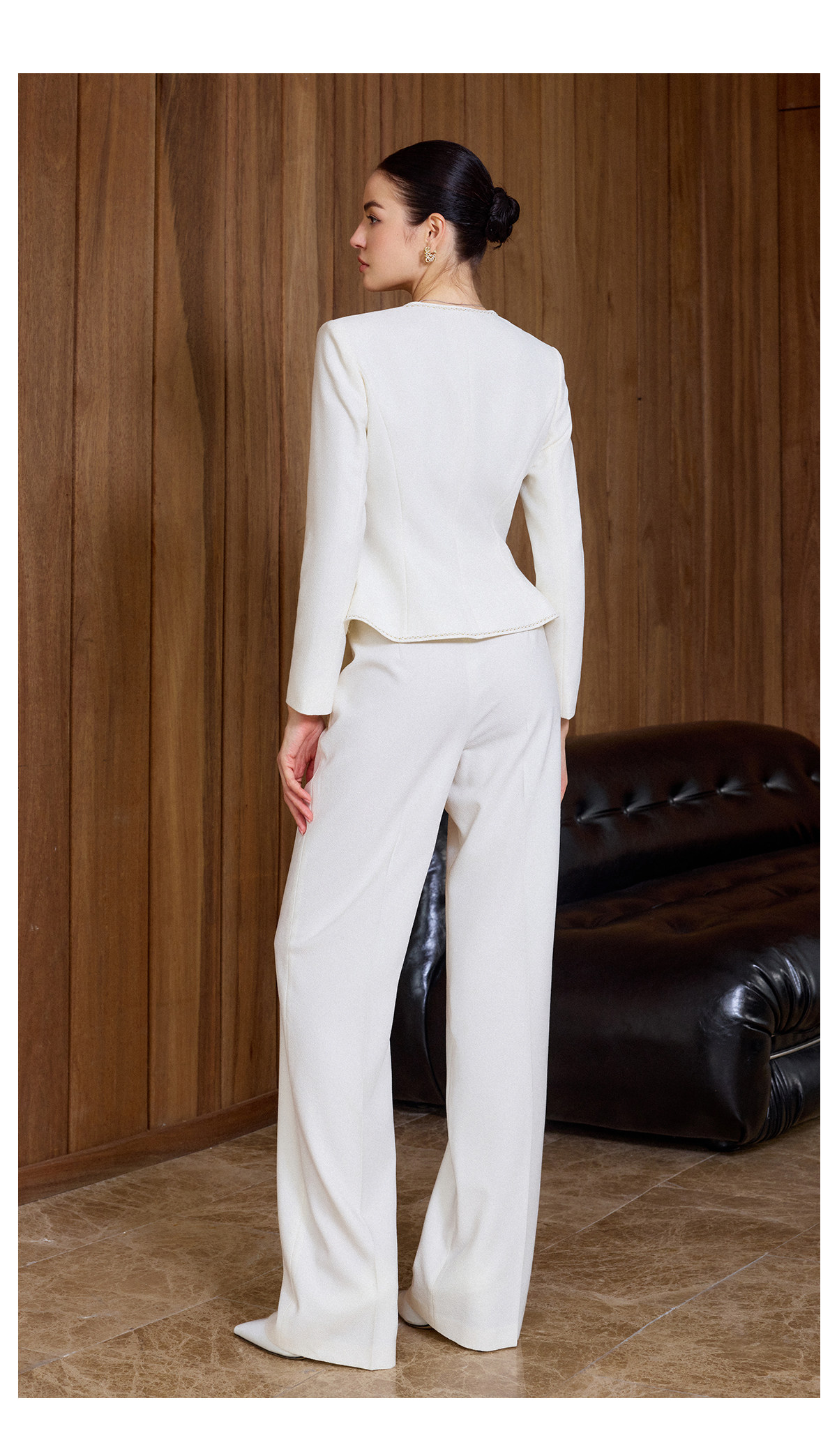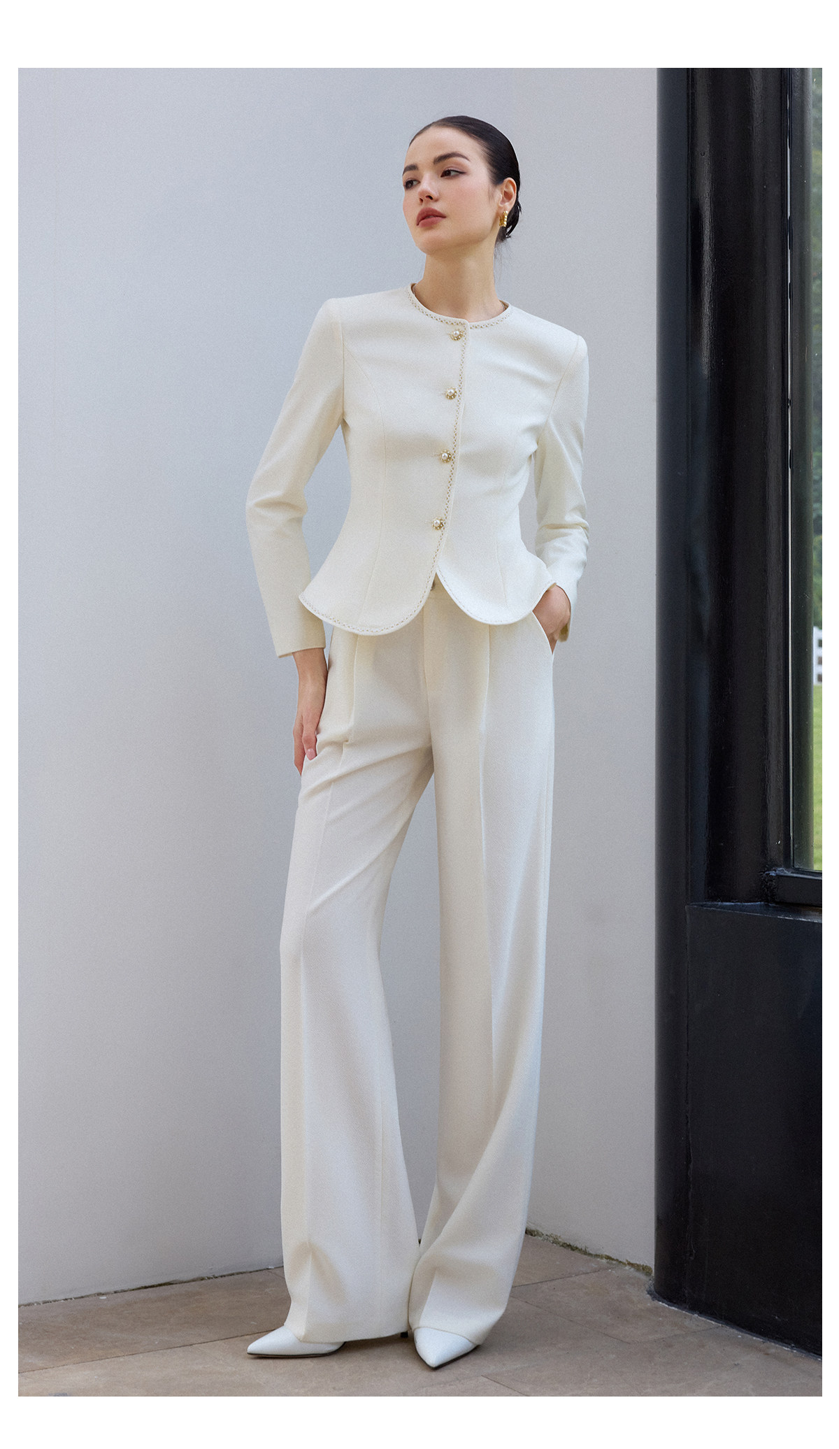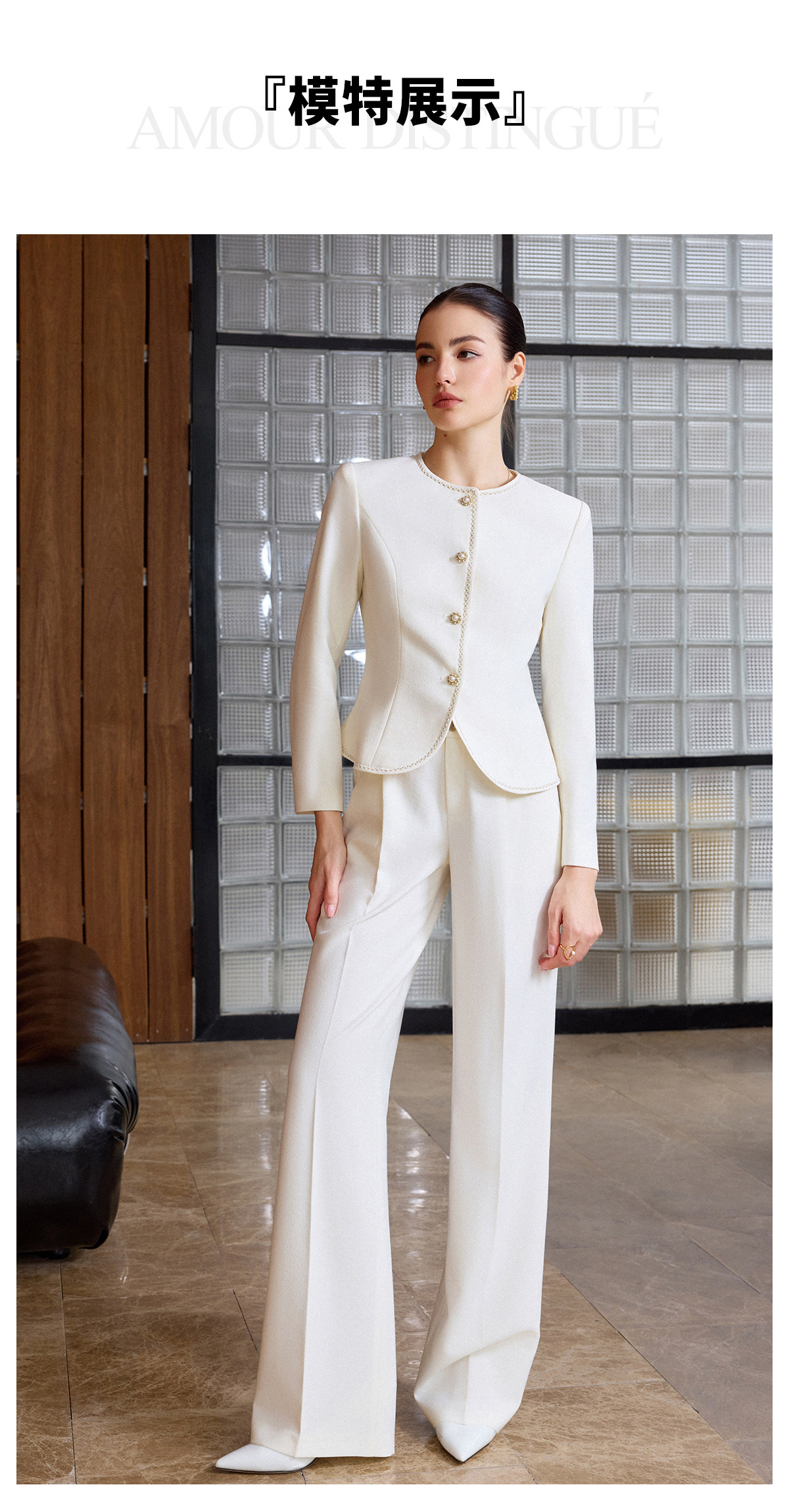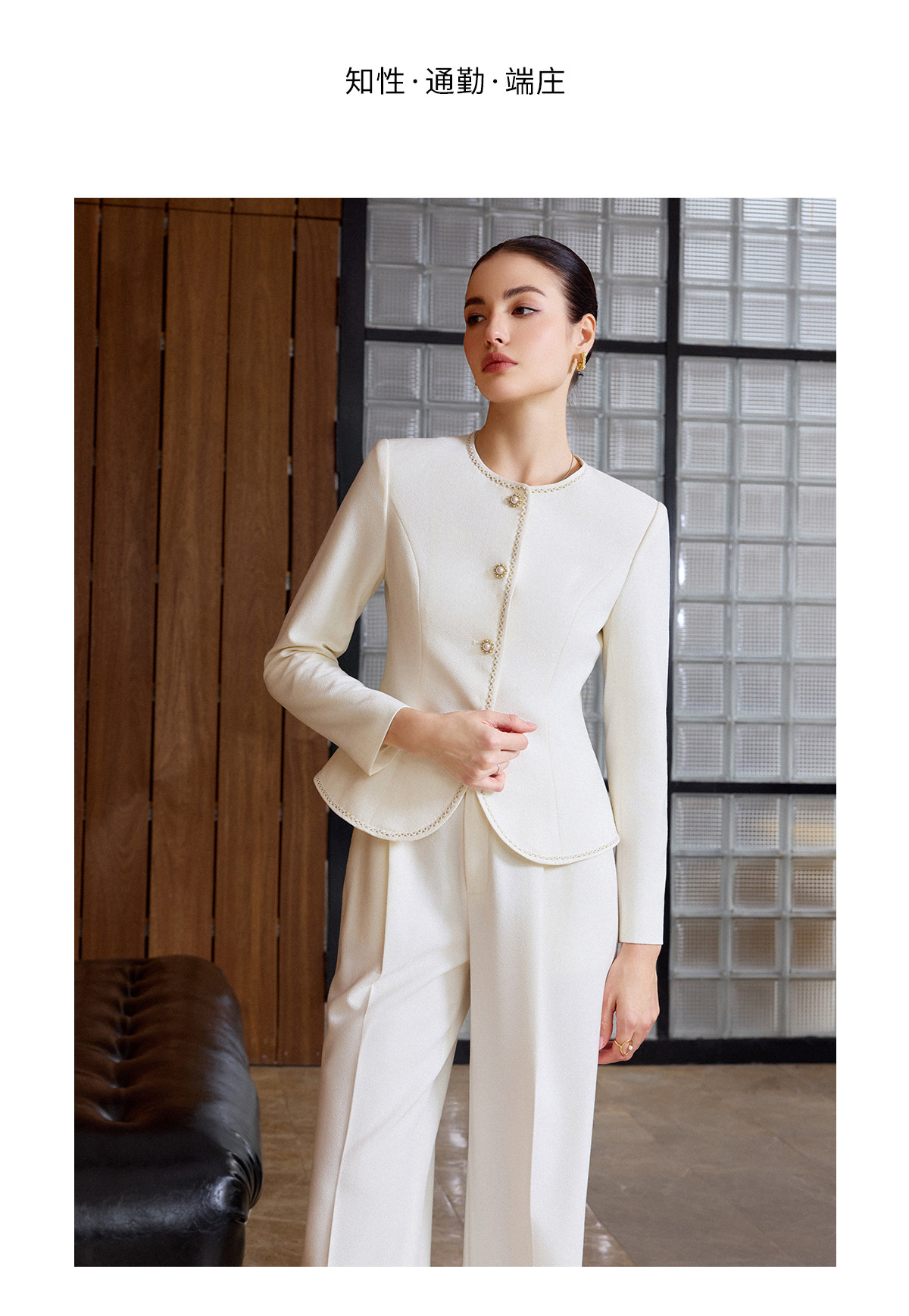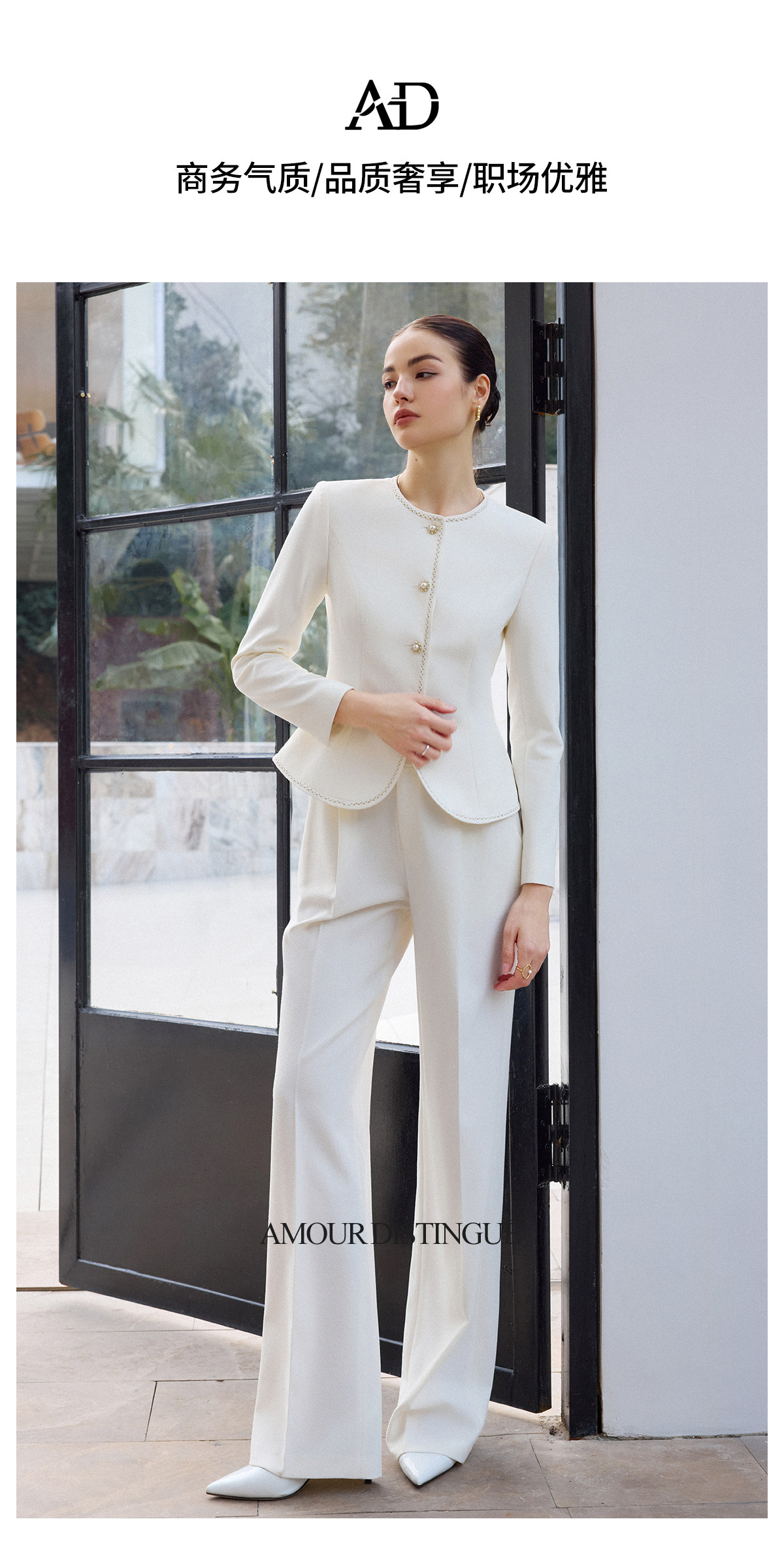 AD职业西装长裤女春季2026新款白色西装套装镶边圆领外套正装裤子