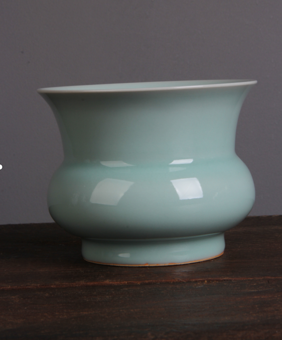 龙泉青瓷渣斗的设计灵感来源于南宋龙泉窑渣斗。此器物喇叭口、直颈、扁圆腰、圆足。胎色灰白,上施粉青色釉,圈足釉与裸胎结合处有一条火石红色线条,圈足底露胎。渣斗口大,用以在宴会场合盛放菜渣,元人笔记称:“宋季大族设宴,凡案间必用筋瓶、渣斗。”此件龙泉青瓷渣斗造型稳重而胎体轻薄,釉色秀美且肥润似玉,千年遗珍重现,十分难得。