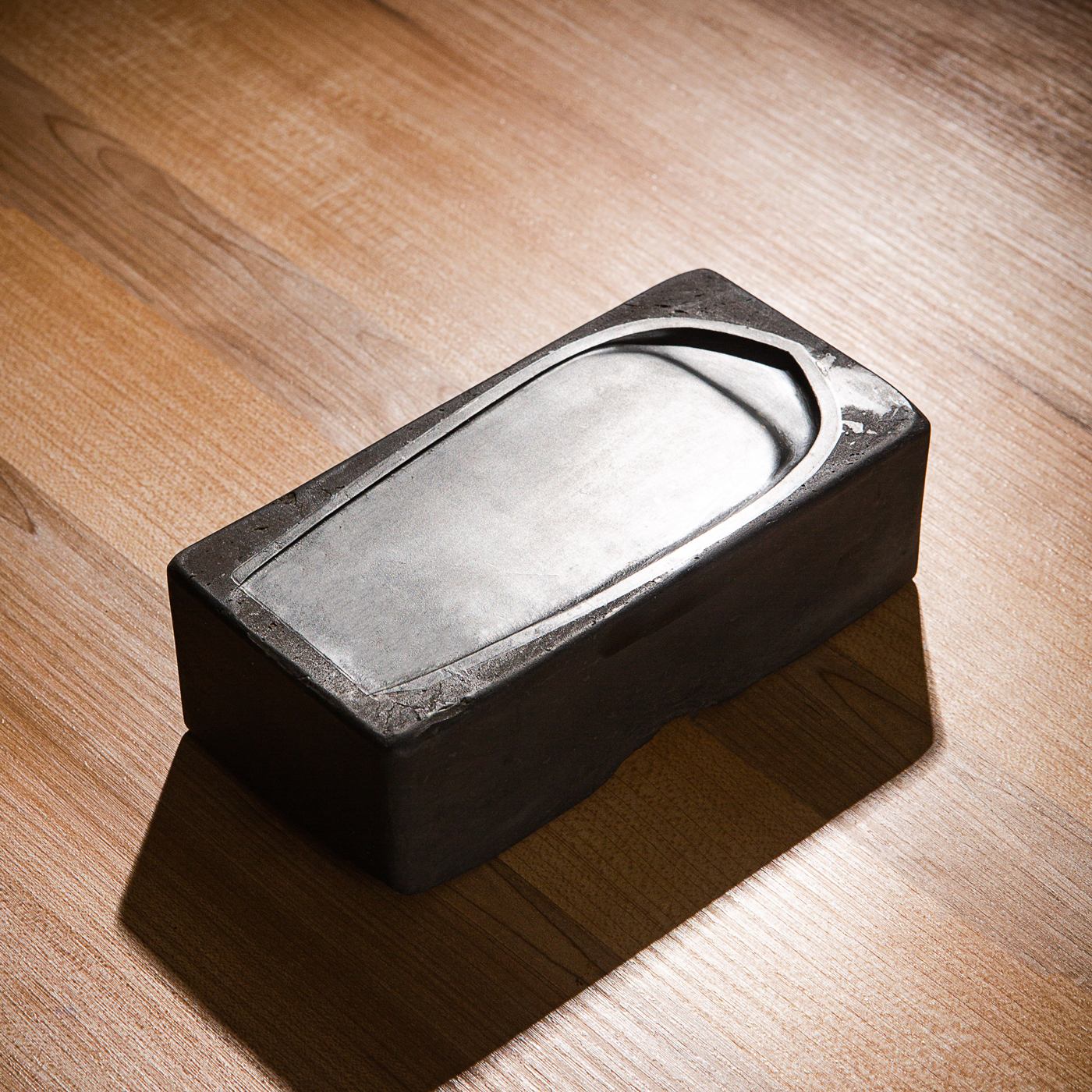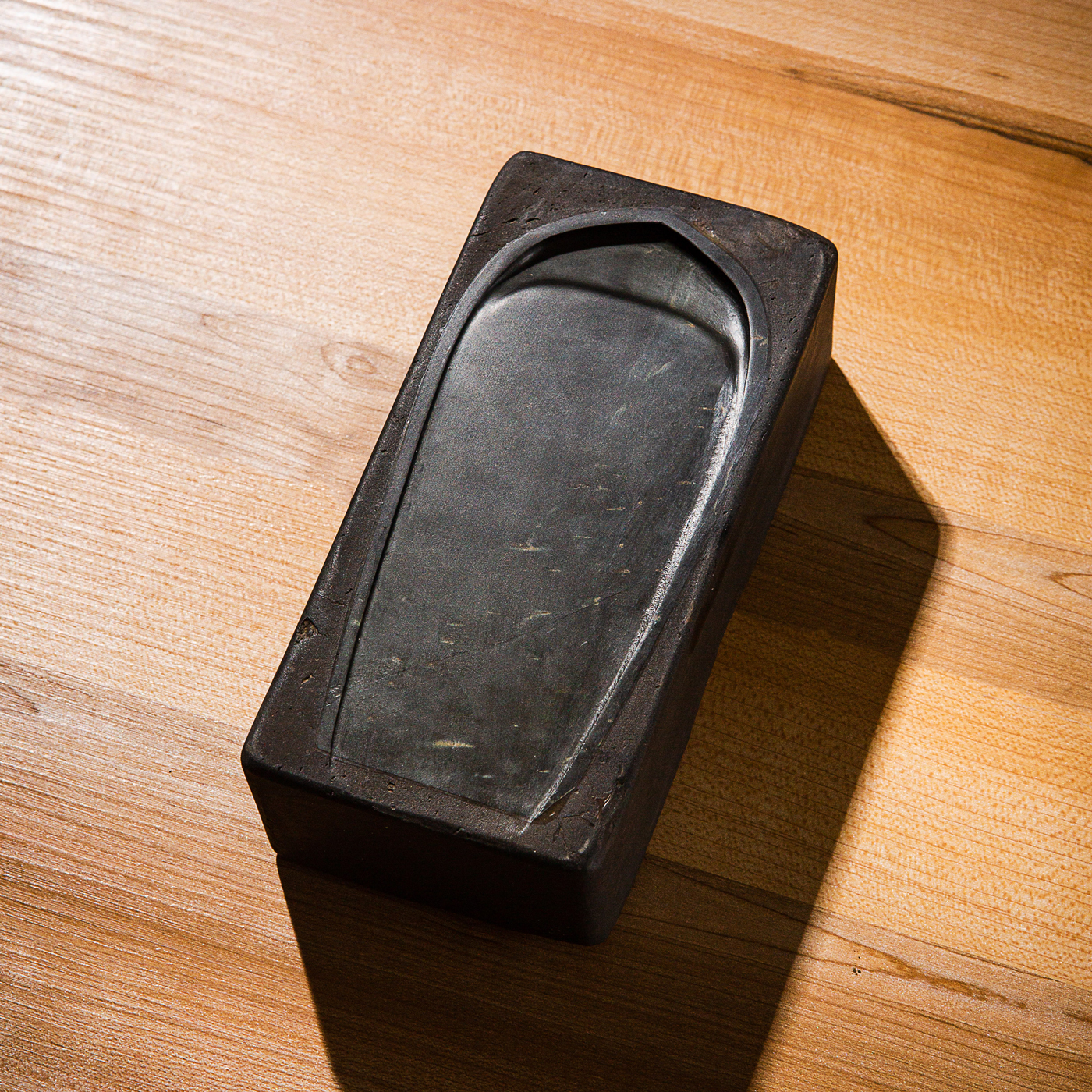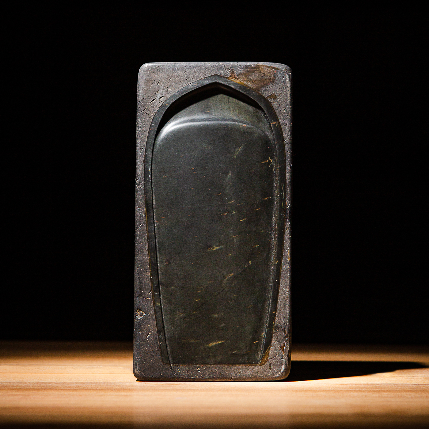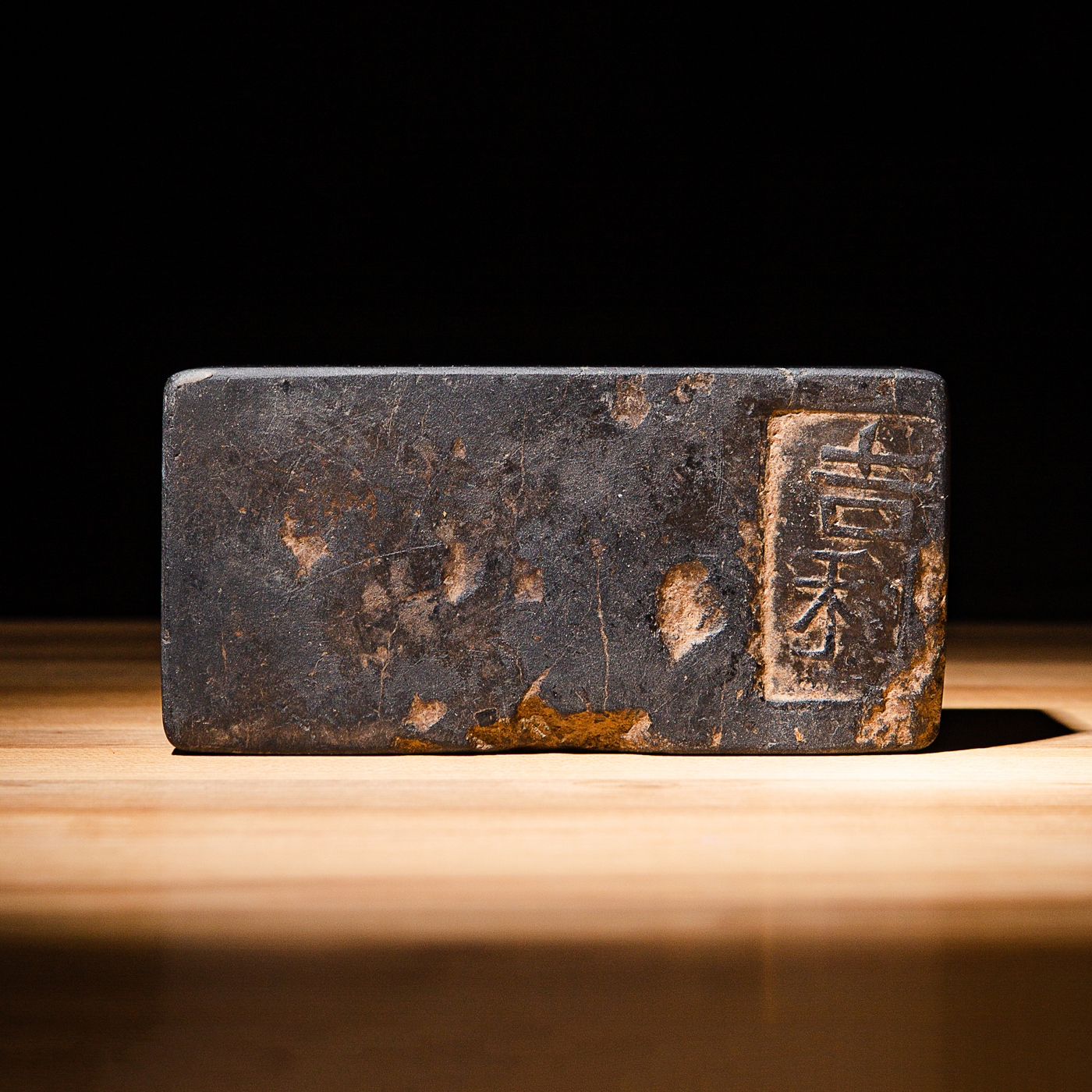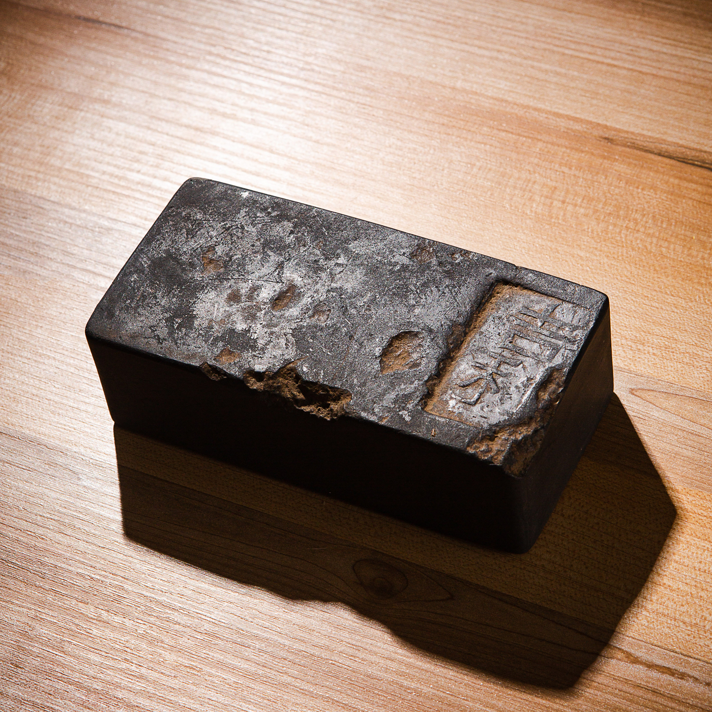 北齐“吉利”古砖制砚。砖为稀有大名品,存世稀有难寻,其铭文俊美古朴,皮壳老辣。采用镶嵌工艺制砚,工艺复杂,所镶嵌歙石质地细嫩,形状文雅,下发墨极佳。