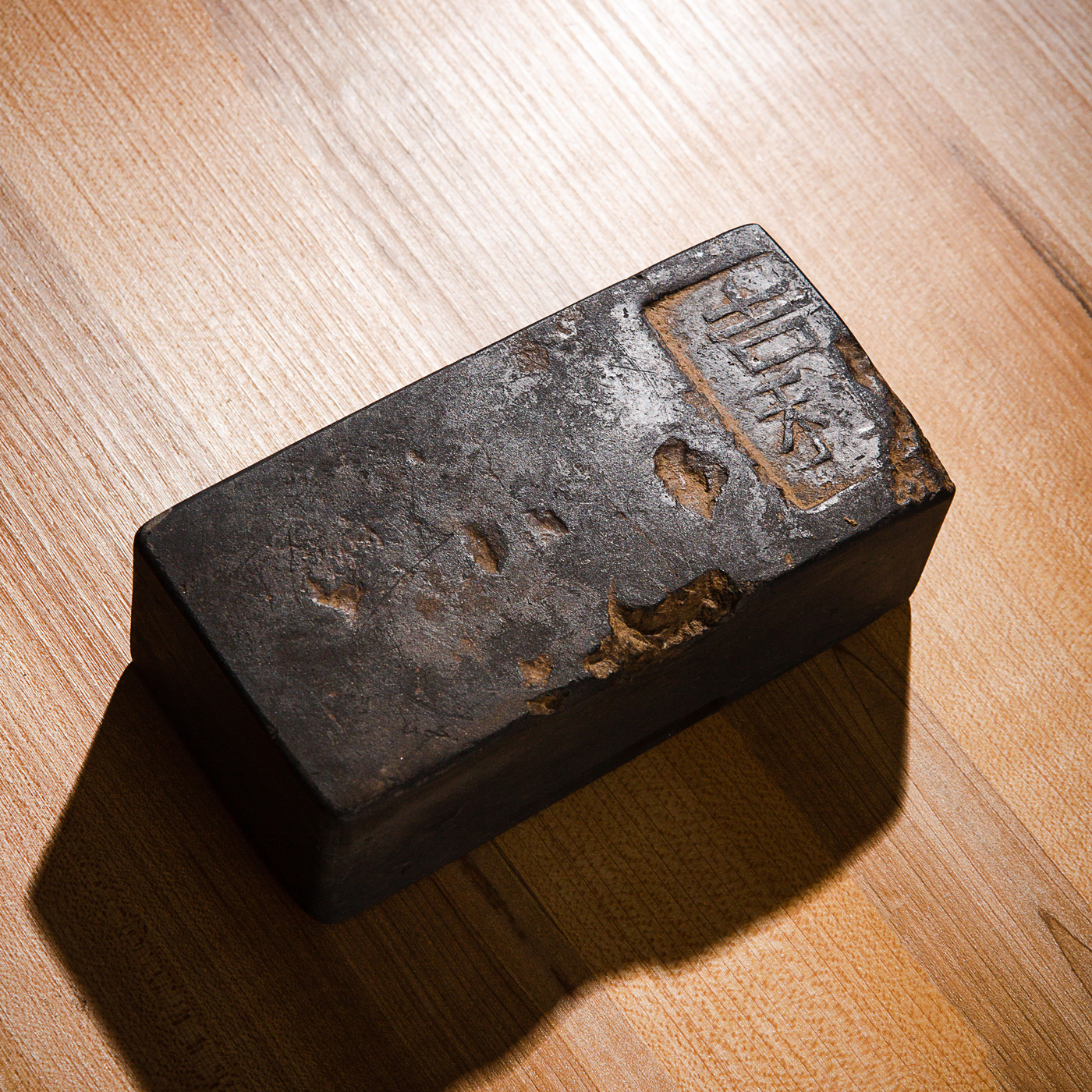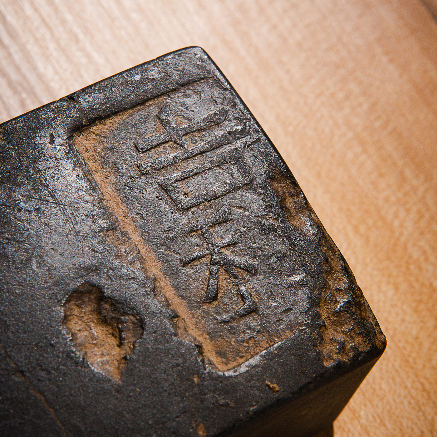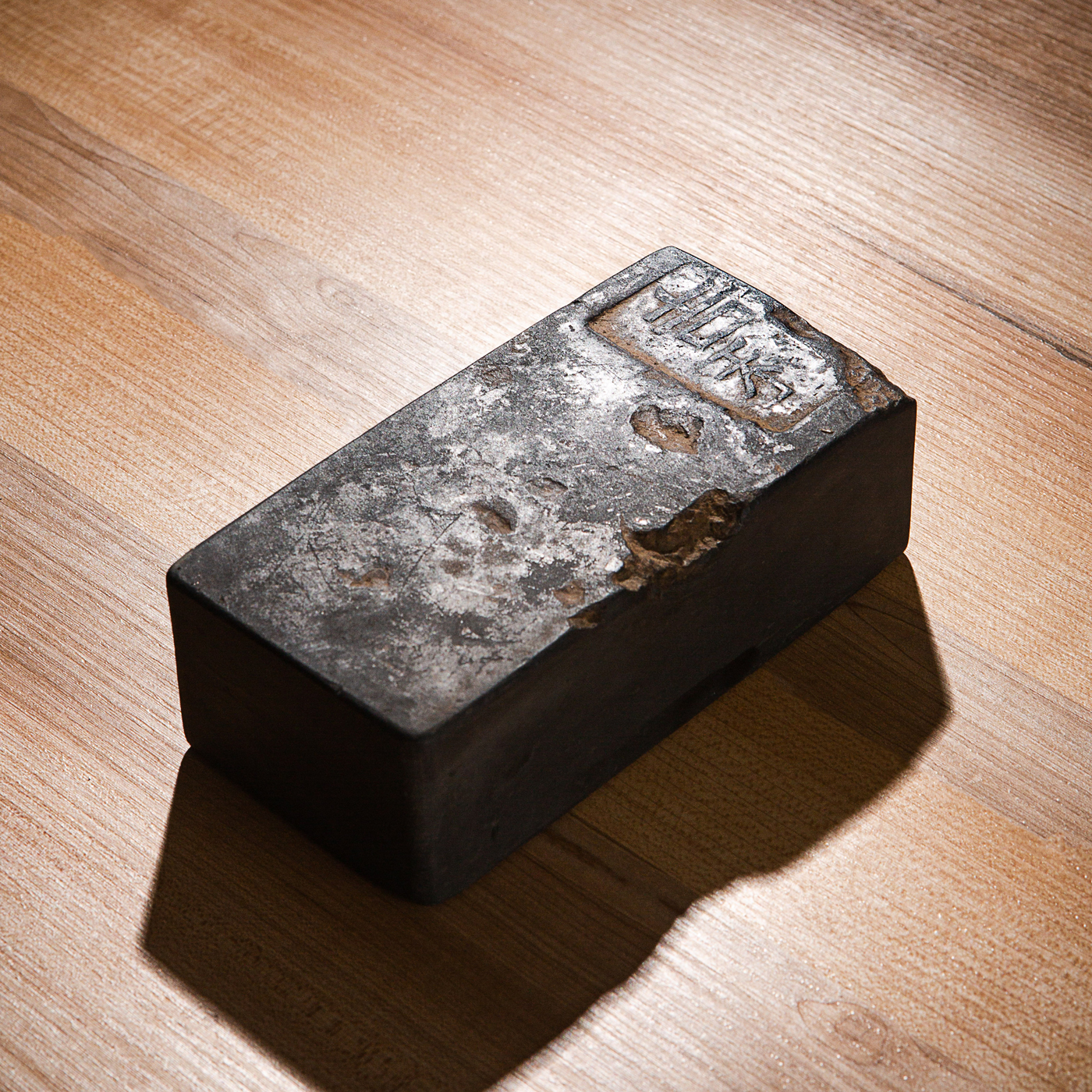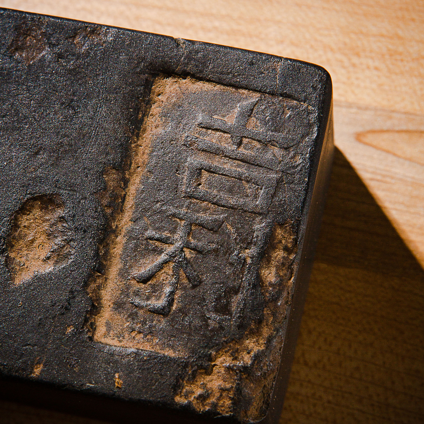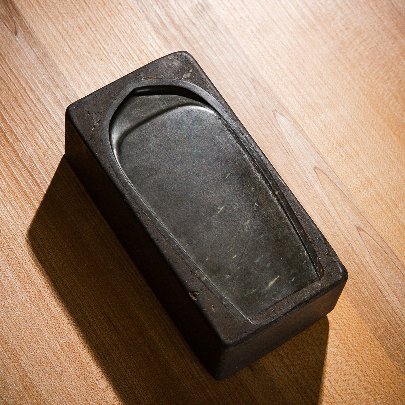 北齐“吉利”古砖制砚。砖为稀有大名品,存世稀有难寻,其铭文俊美古朴,皮壳老辣。采用镶嵌工艺制砚,工艺复杂,所镶嵌歙石质地细嫩,形状文雅,下发墨极佳。