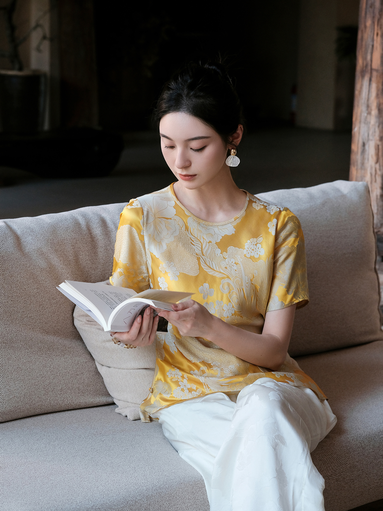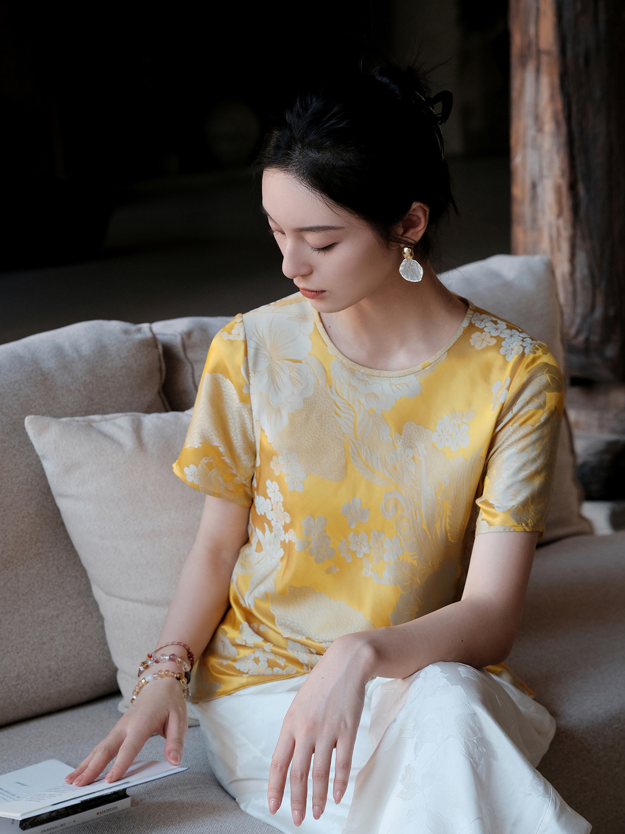 盛唐婧| 桑蚕丝牡丹提花修身国风简约短袖-黄色
