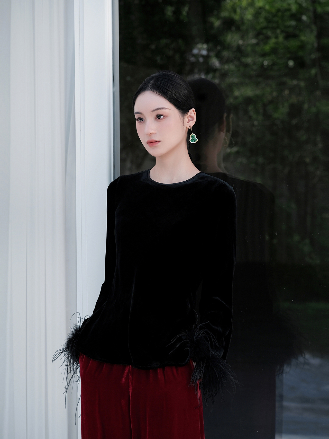 盛唐牡丹| 真丝丝绒配鸵鸟毛袖上衣