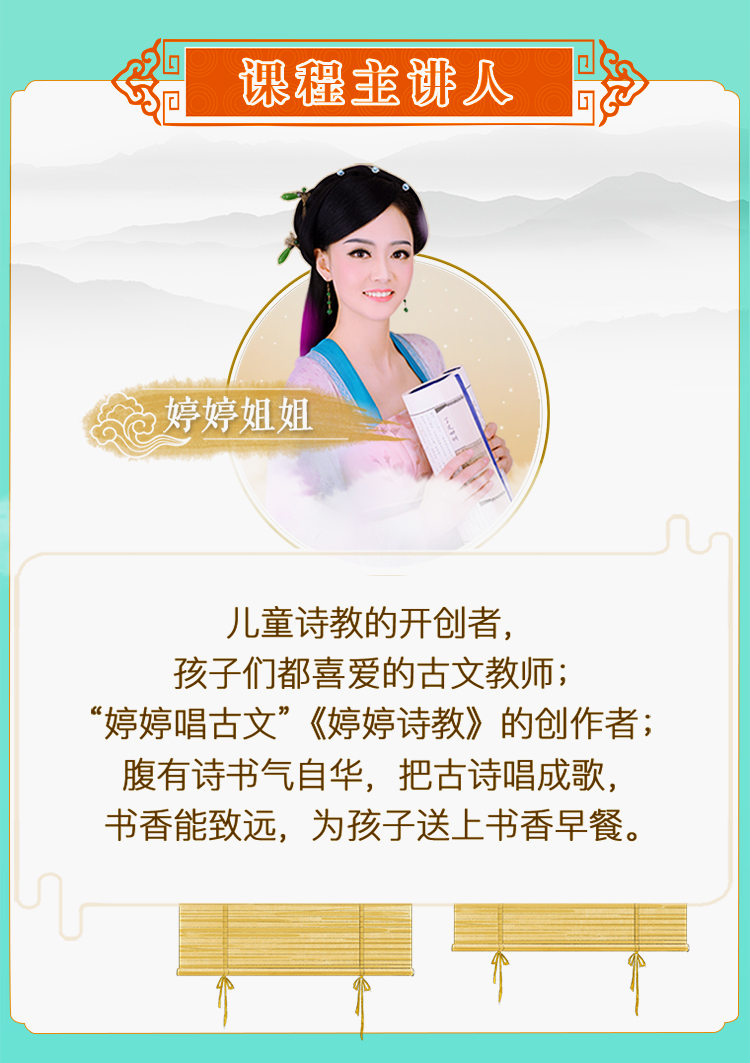 婷婷姐姐,孩子们最爱的家庭教师,已将百余首古诗词谱曲成歌,并广为流传。当下炙手可热的“婷婷唱古文”和“婷婷诗教”的专栏创作者,现代诗教开创者,倡导儿童教育从诗教开始。
