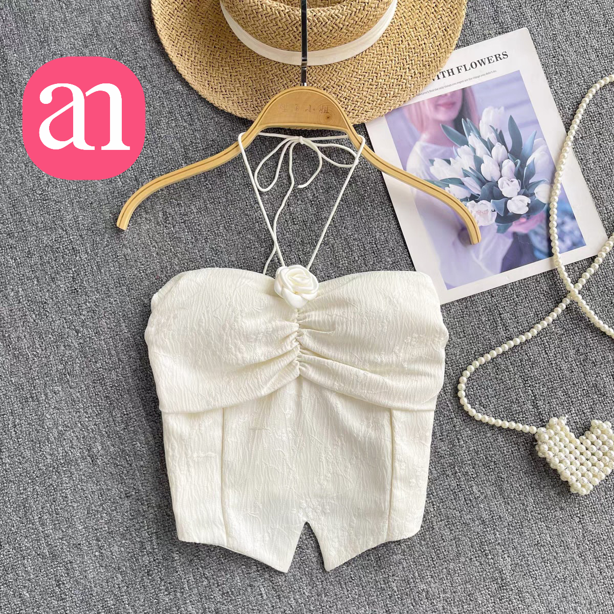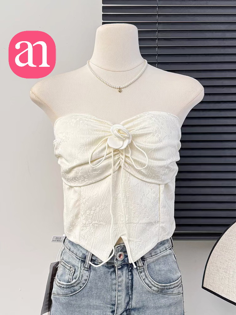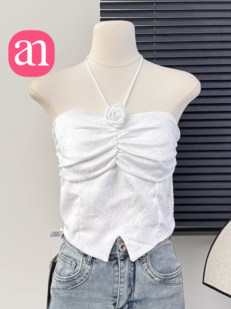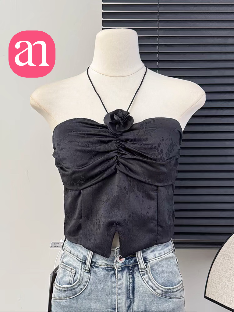 【特价29】性感辣妹玫瑰花挂脖系带吊带 纯欲风提花压褶抹胸上衣夏季 15194039