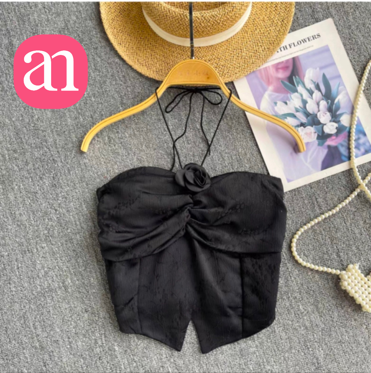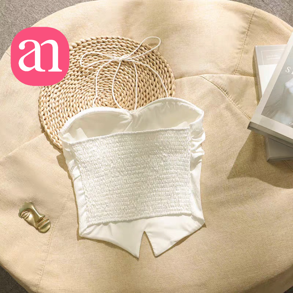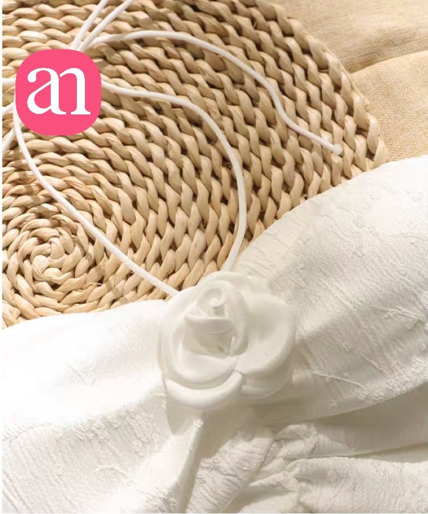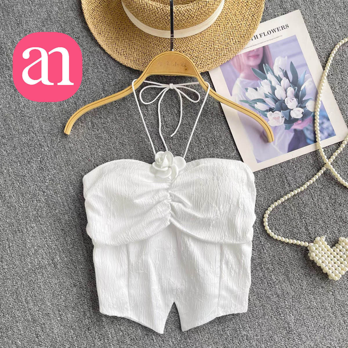 【特价29】性感辣妹玫瑰花挂脖系带吊带 纯欲风提花压褶抹胸上衣夏季 15194039
