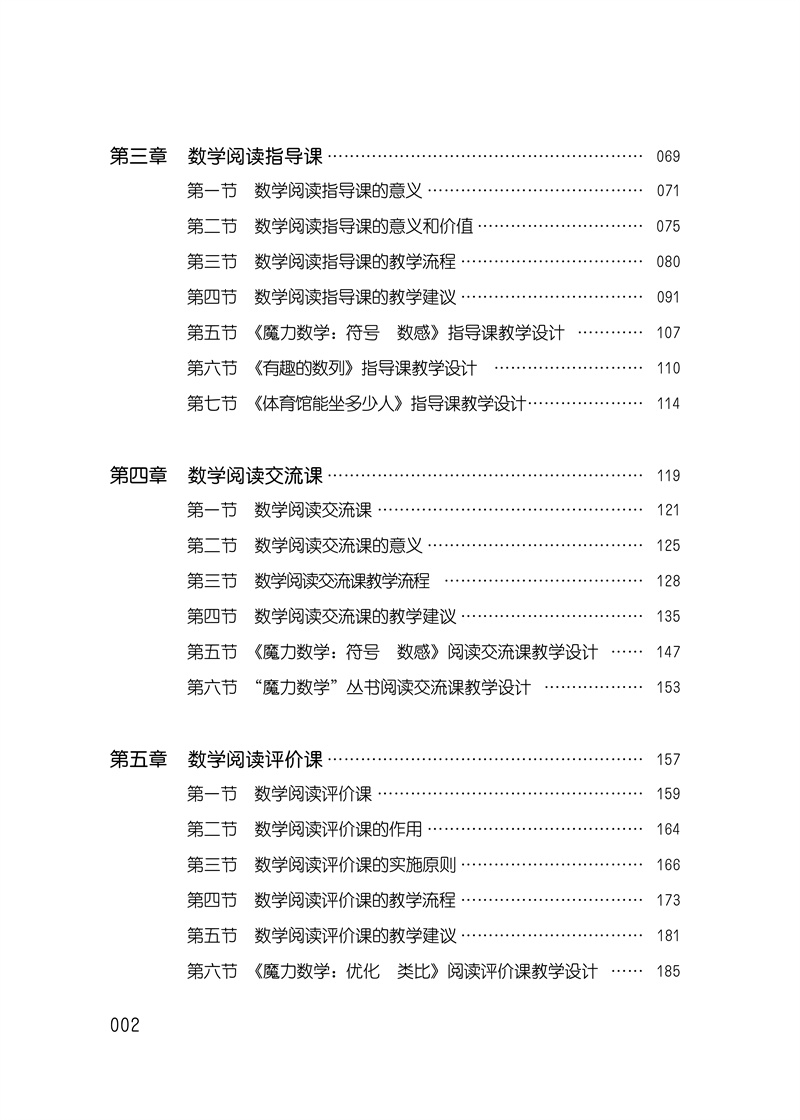 在进行数学阅读教学的过程中,作者发现:通过对数学阅读课型的研究,有助于教师更好地掌握各种类型的数学阅读课的教学目的、教学结构、教学方法等方面的规律,更有助于教师便教利学,提高数学阅读课的质量。在本书中,作者聚焦课例进行深度研讨,采用;课例十微报告的方式,形成一种相对固定的流程、该课型的实施建议和有效的策略,这样便于老师们在进行数学阅读实施过程中参考和使用。本书是在指向核心素养的;三环四步数学阅读教学模型基础上,对数学阅读;导读课;指导课;交流课;评价课和;绘本进行深入研究,遵循教学过程的基本规律,运用系统方法设计教学过程,使之成为一种具有操作性的流程。这不仅能促进教师有效实施数学阅读,更能促进学生在积极的数学阅读中提高学习兴趣,激发学生思维,从而提升阅读的品质。