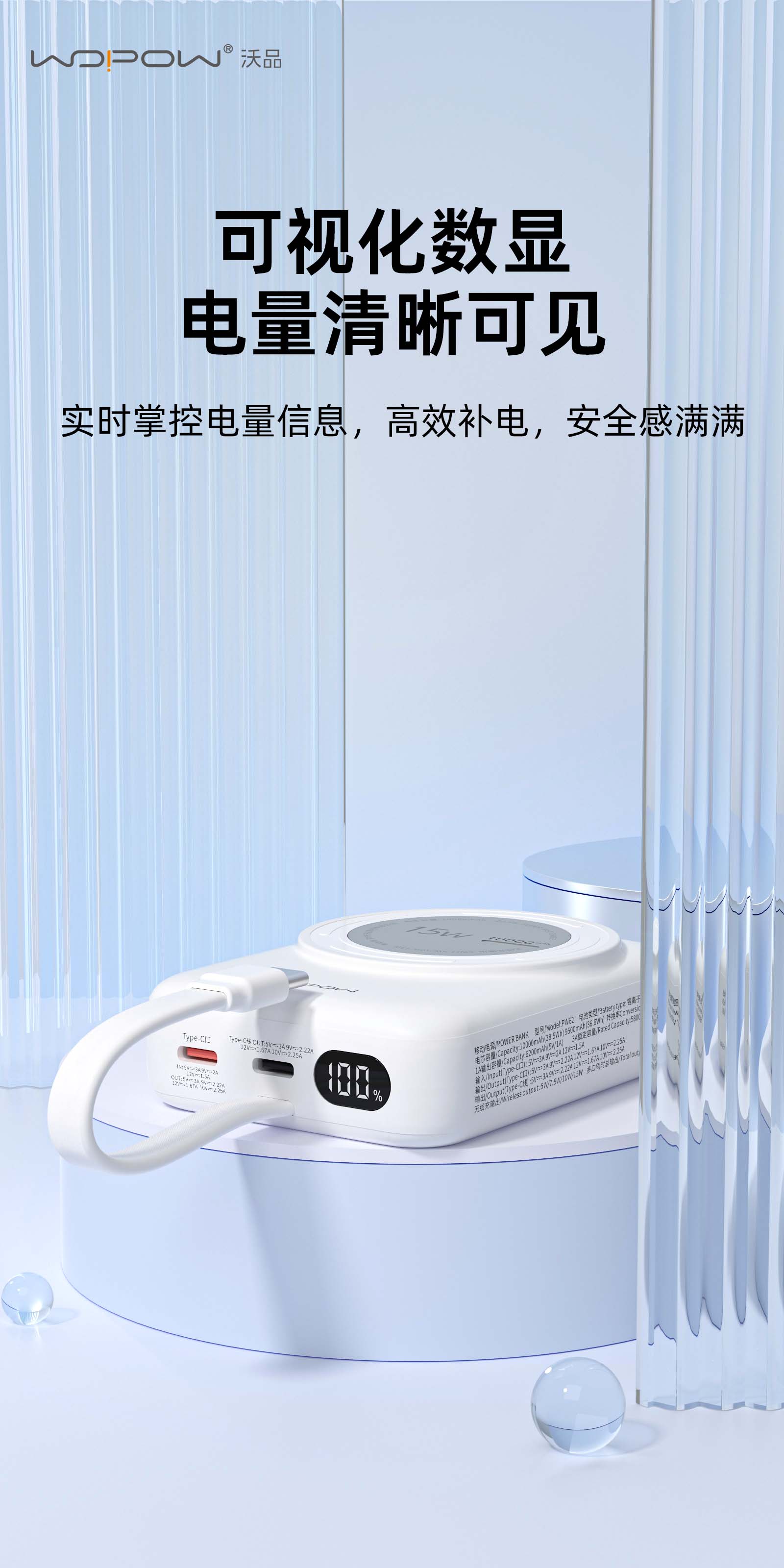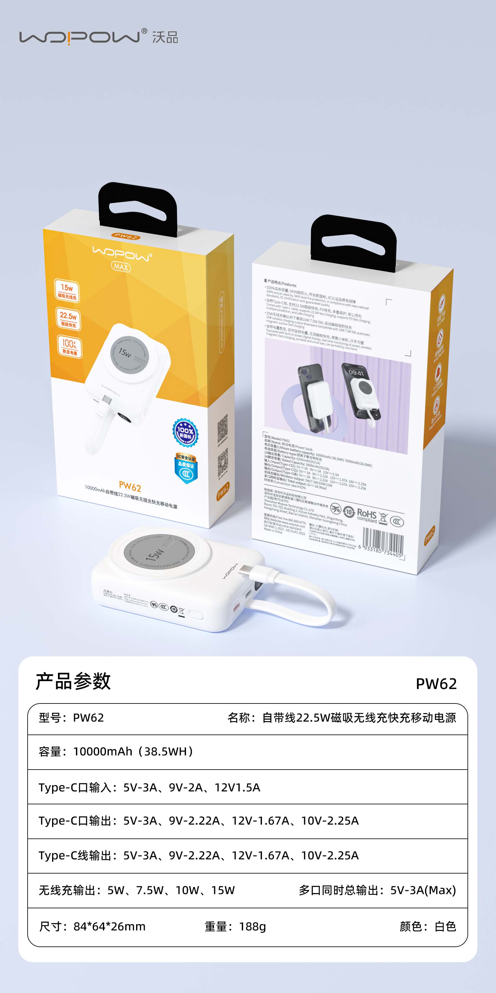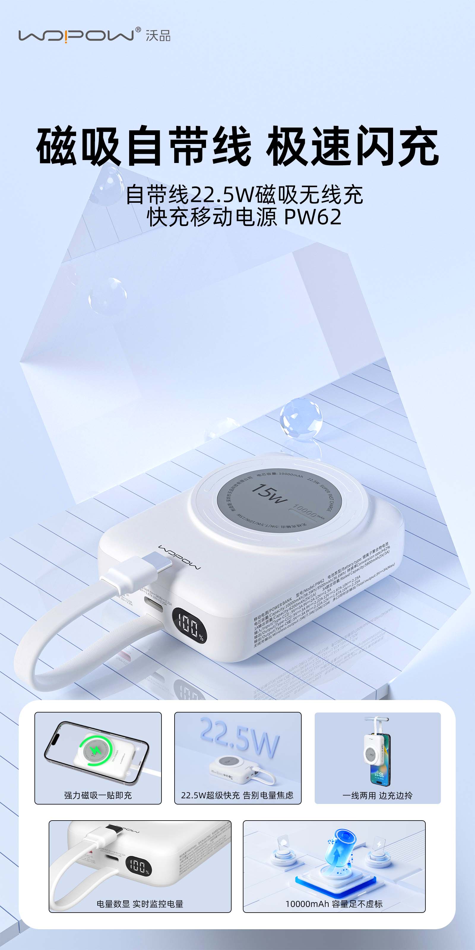 【超模君严选】沃品自带线22.5w磁吸无线充电宝PW62
