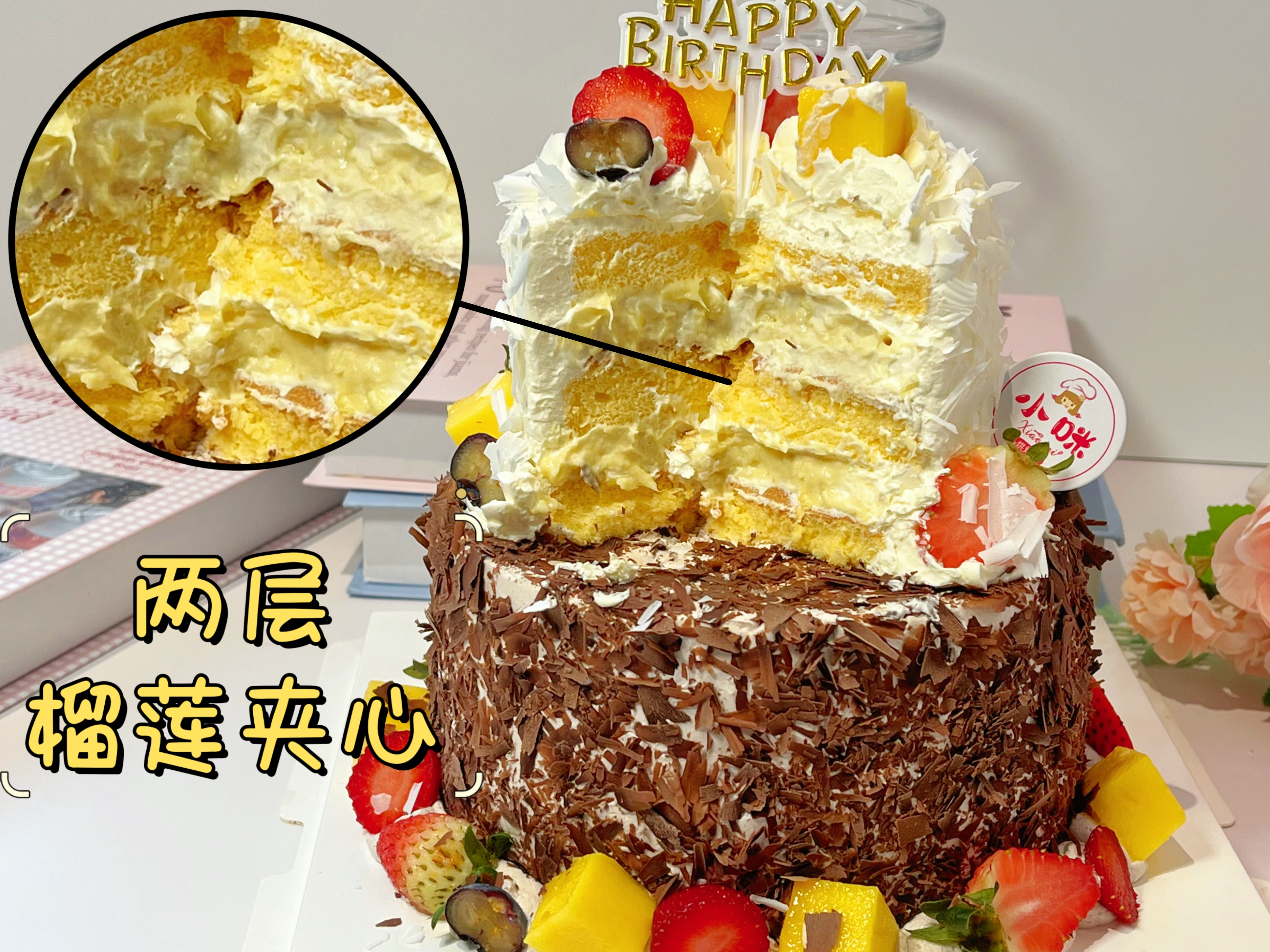 戚风蛋糕胚+两层榴莲夹心+白色巧克力碎