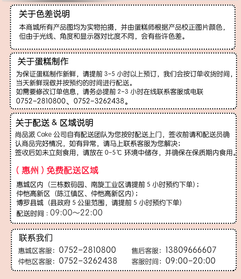 我们坚持当日接单、新鲜现做,拒绝罐头果肉与植物奶油,让每一口都保留食材本真的鲜活清甜。生活需要一点甜,我们的蛋糕不只是一份甜品,更是传递快乐的仪式感,为你带来视觉与味蕾的双重满足~