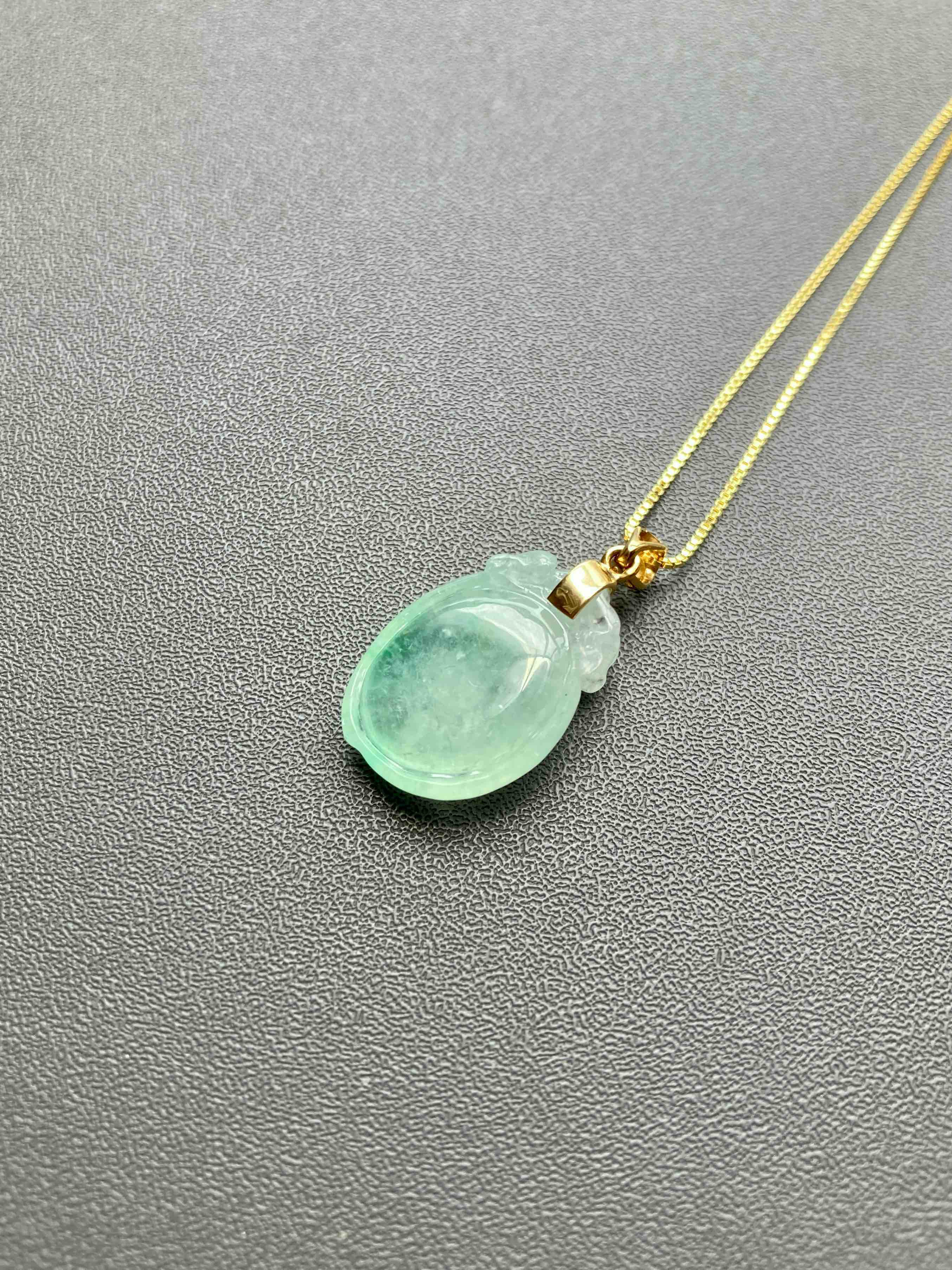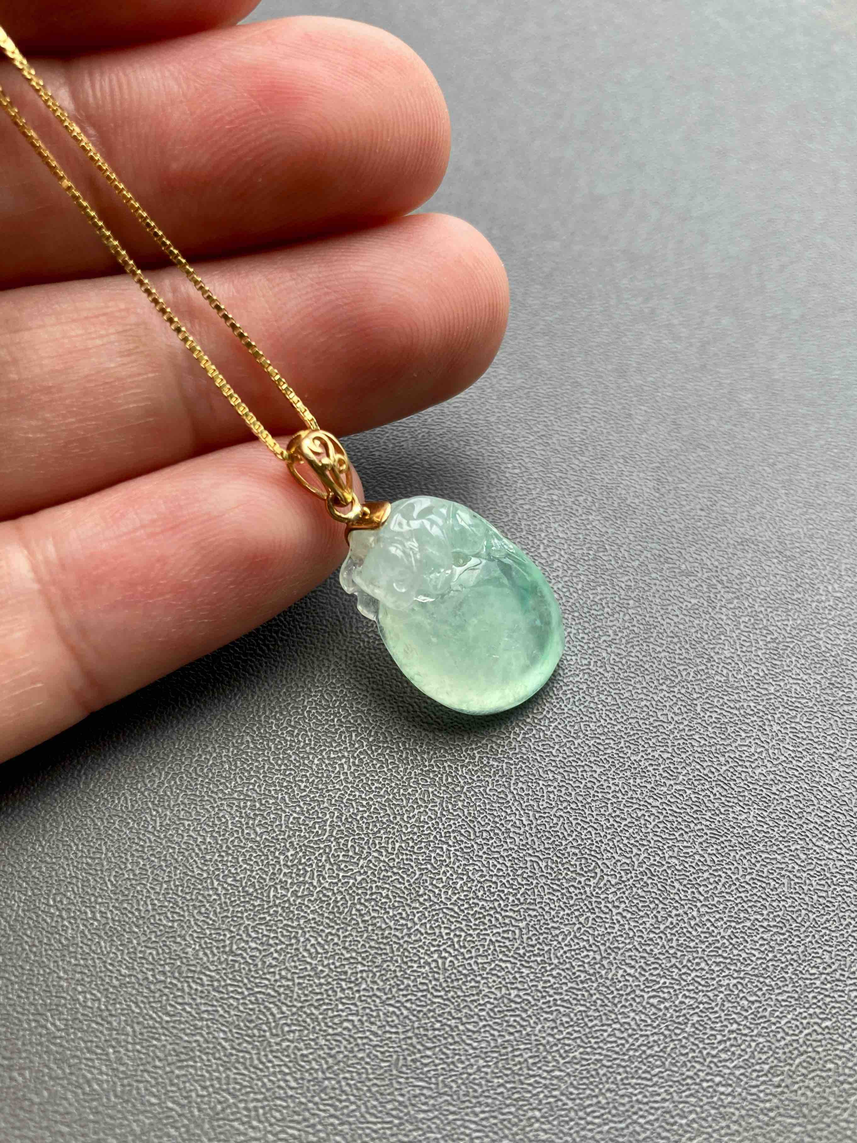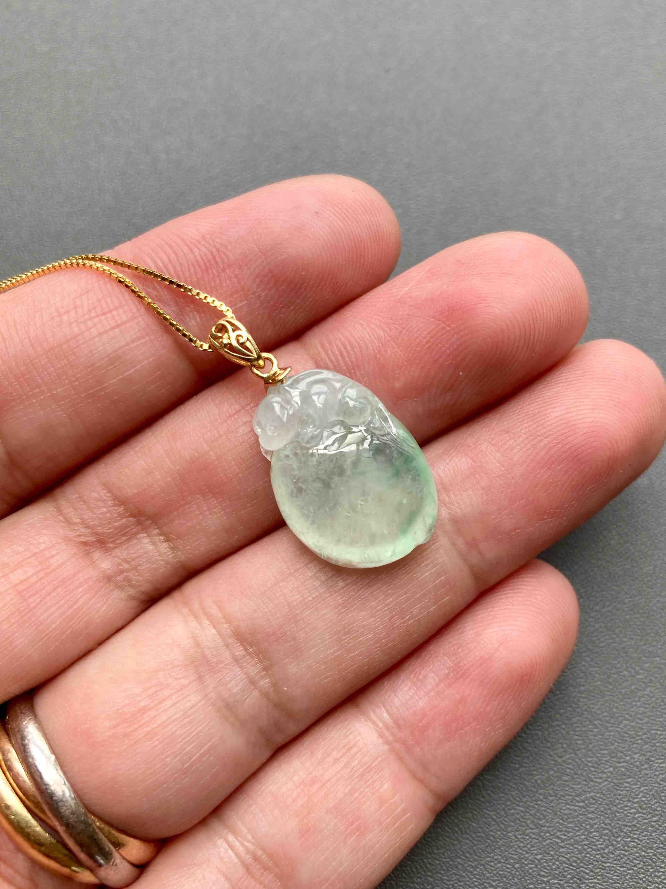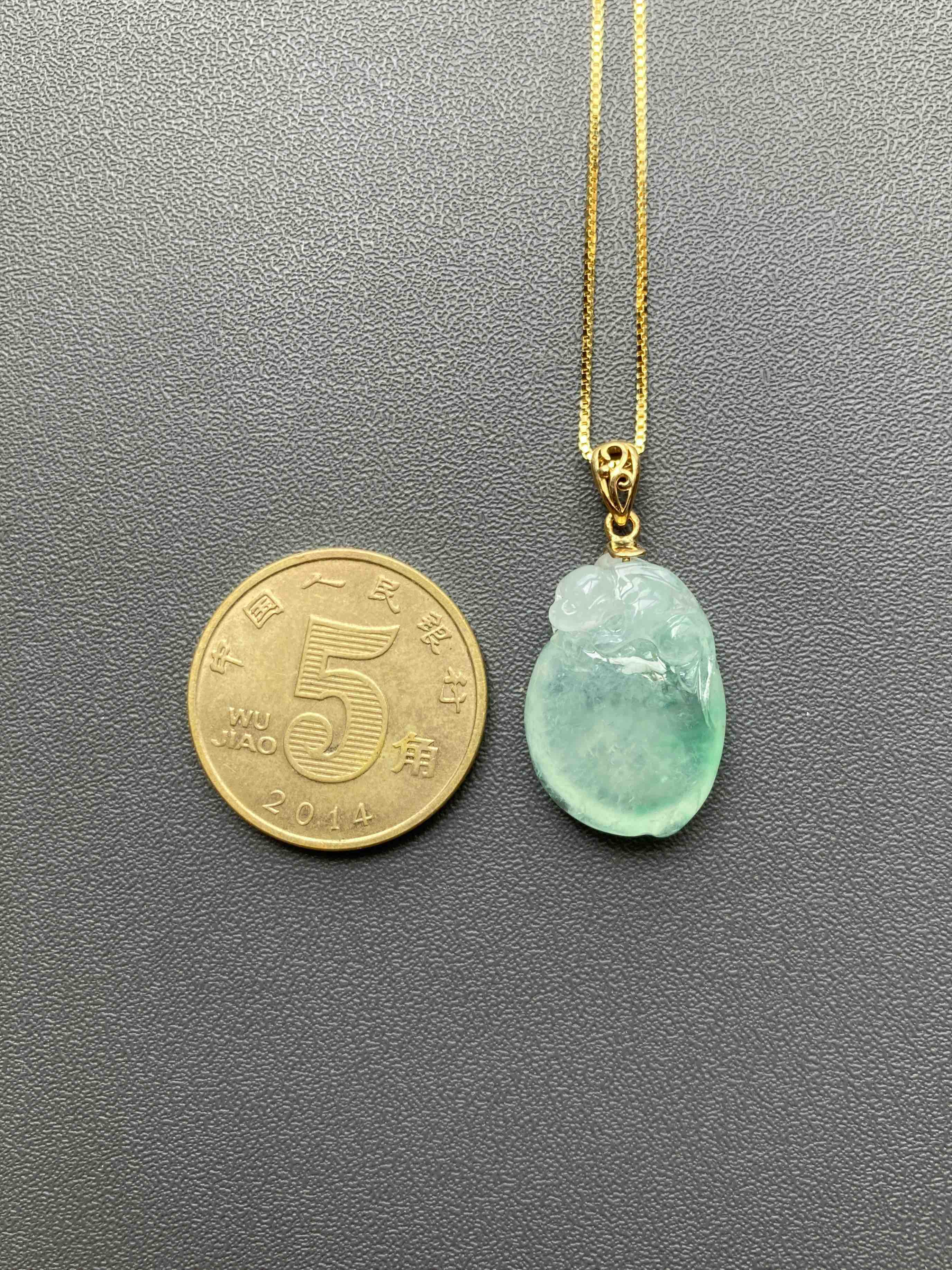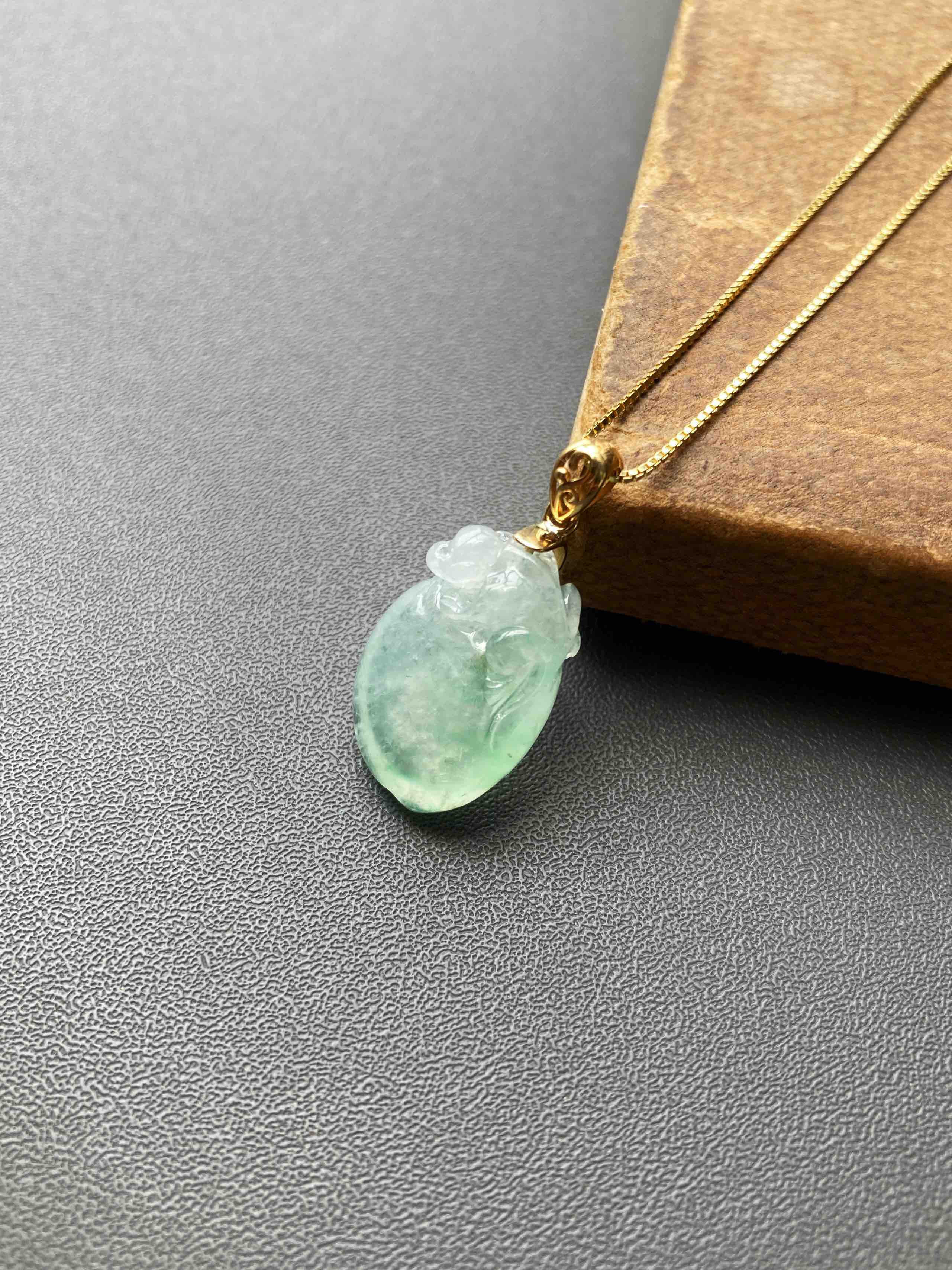 小桃子,人见人爱,冰种飘阳绿,荧光四射,种色俱佳,下面光面无雕,上面雕刻一只小猴,寓意灵猴献瑞,福寿双全,小四价位请走,今天我还送她配套的18k金镂空扣头和银镀金项链一条,划算,