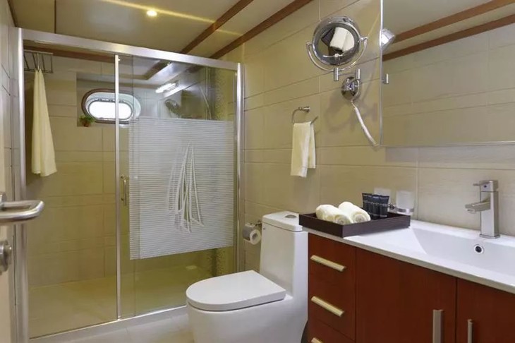 所有客舱都有独立洗手间、吹风机、空调、32寸电视机、船内电话、保险箱和浴巾。