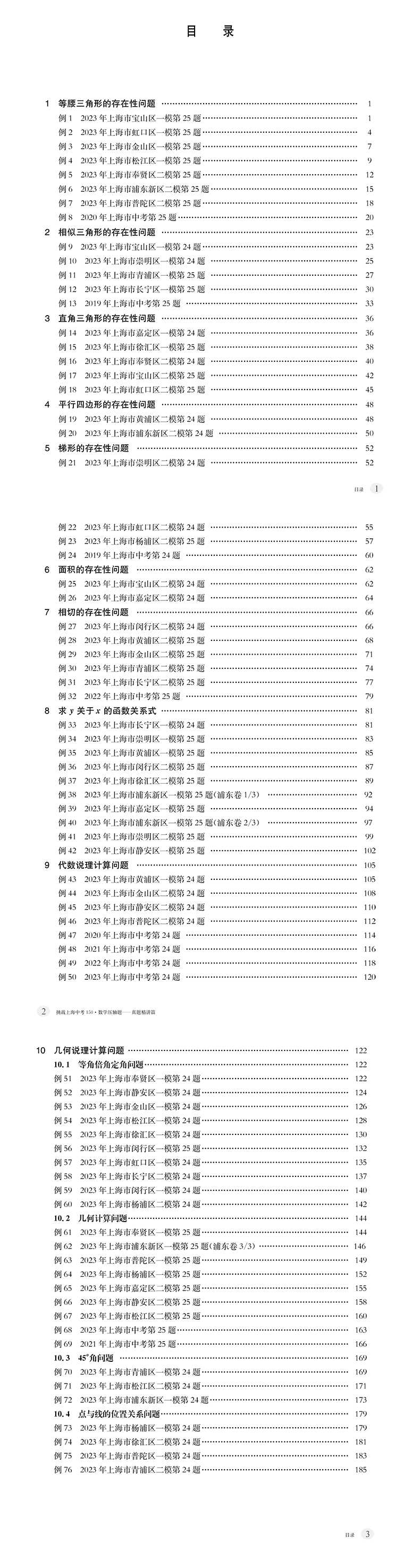 《挑战上海中考150数学压轴题真题精讲篇》分为;等腰三角形的存在性问题;相似三角形的存在性问题;直角三角形的存在性问题;平行四边形的存在性问题;梯形的存在性问题;面积的存在性问题;相切的存在性问题;求y关于x的函数关系式;代数说理计算问题;几何说理计算问题10章内容,收录了上海16个区2023年1月一模压轴题,2023年4月二模压轴题,以及近五年上海的中考压轴题。
