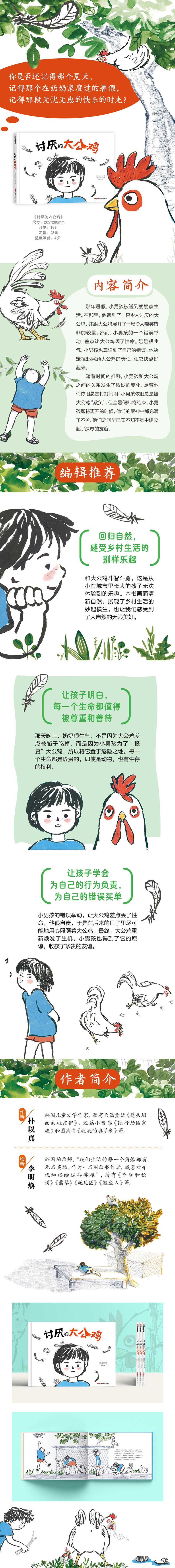 1. 以第一人称视角,讲述了小男孩与大公鸡斗智斗勇的故事,贴近生活,生动有趣; 2. 能够让孩子学会如何善待生命,如何与他人相处; 3. 能够引导孩子自我反思,及时意识到自己的错误,并学会主动承担错误带来的后果; 4. 能够让孩子学会亲近自然,感受自然的独特魅力,得到启示和成长。