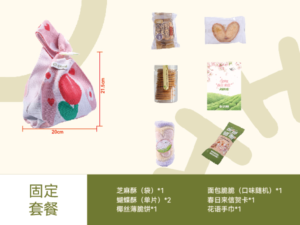 套餐A:芝麻酥(袋)*1、椰丝薄脆*1、蝴蝶酥(单片)*2、面包脆脆(口味随机)*1、花语手巾*1、春日来信贺卡*1