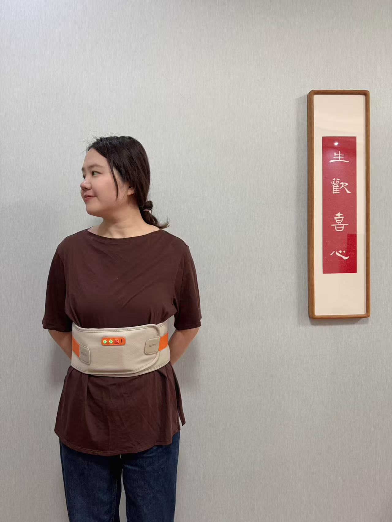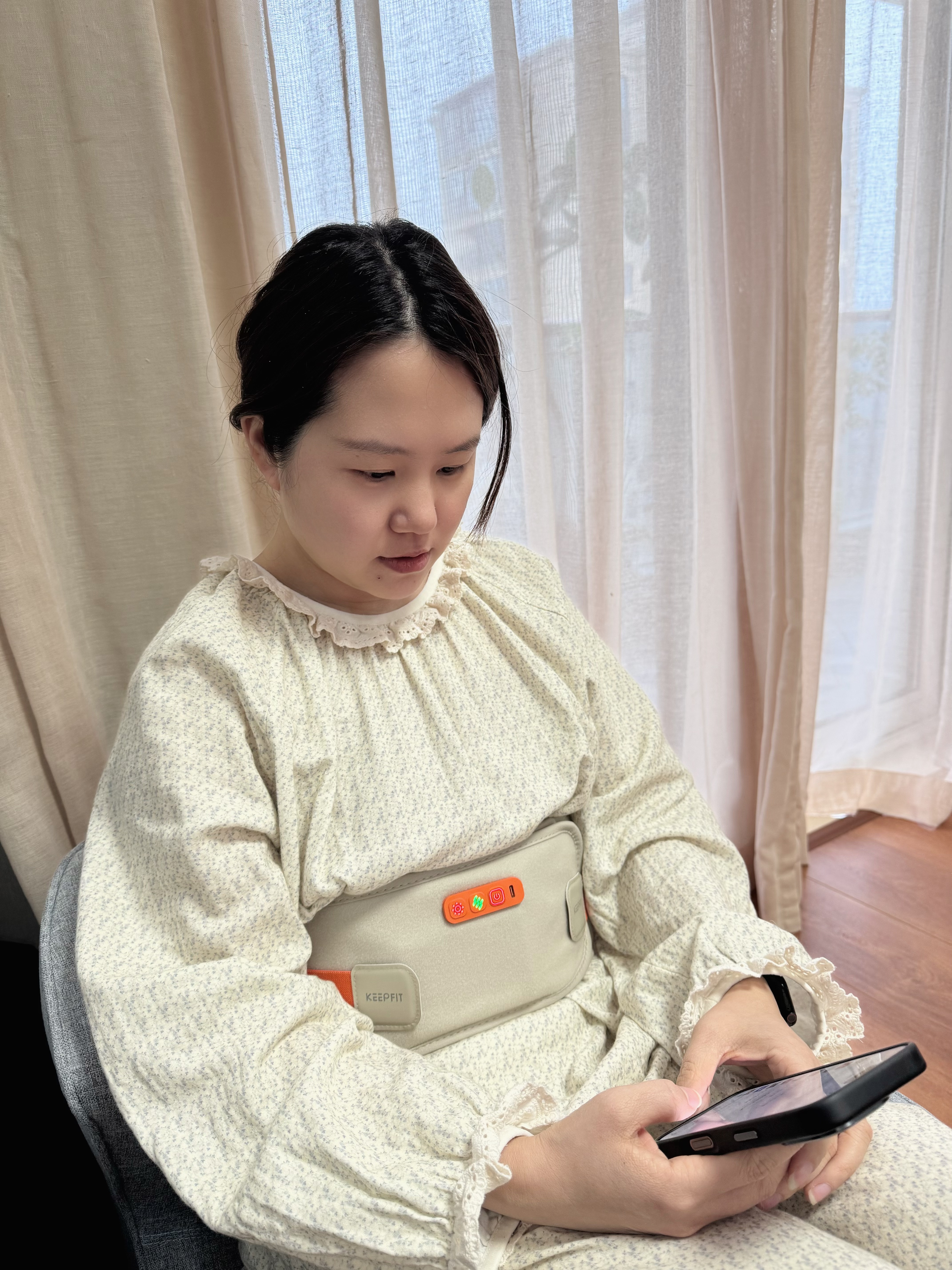 我先请老婆试用,腰带戴上身还是很服帖的哦,打开按摩和加热,哎呀,老婆戴上就不想脱掉了,坐在凳子上,刷刷手机太舒服了,直到机器工作满20分钟自动关机,老婆还要开机继续享受。
