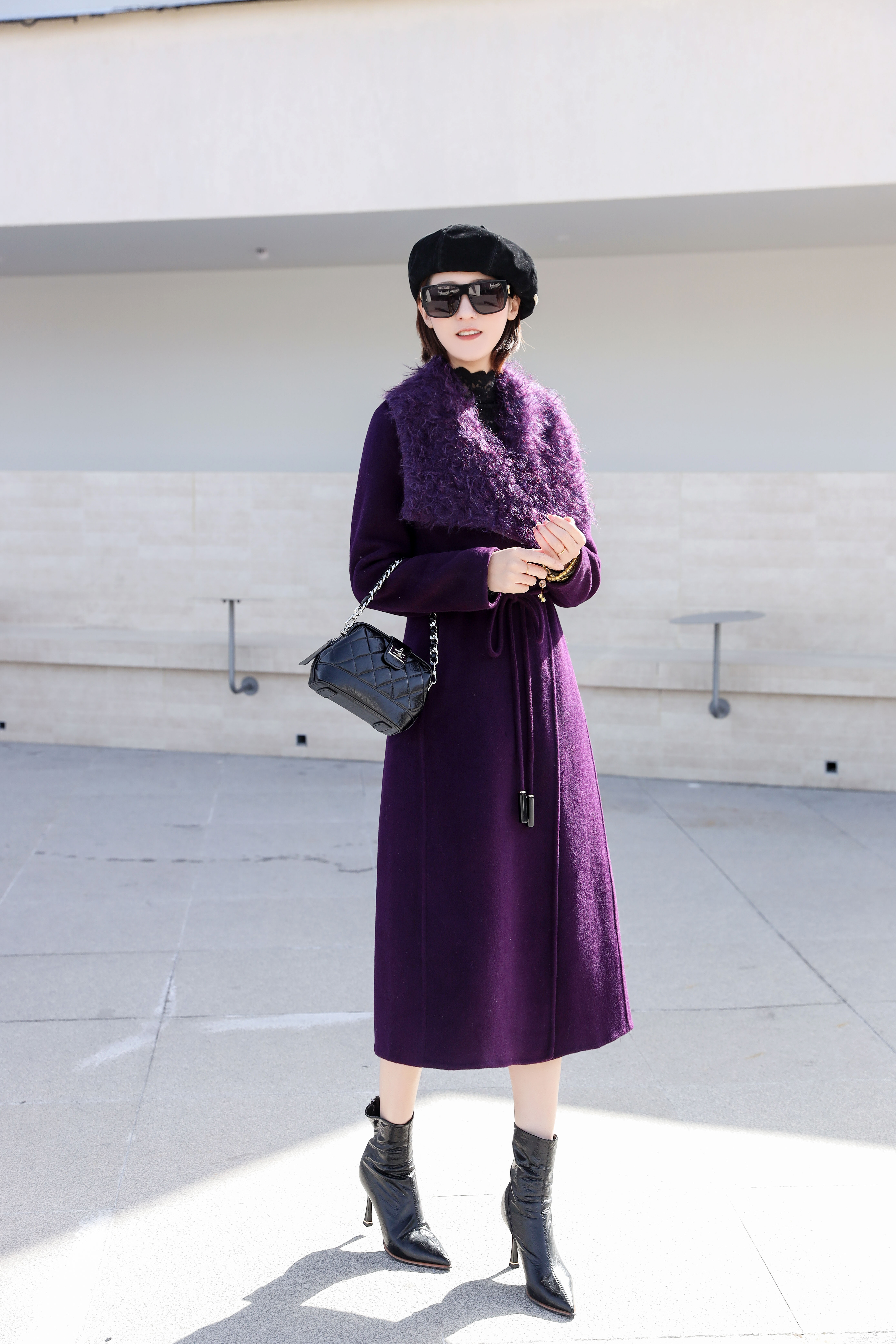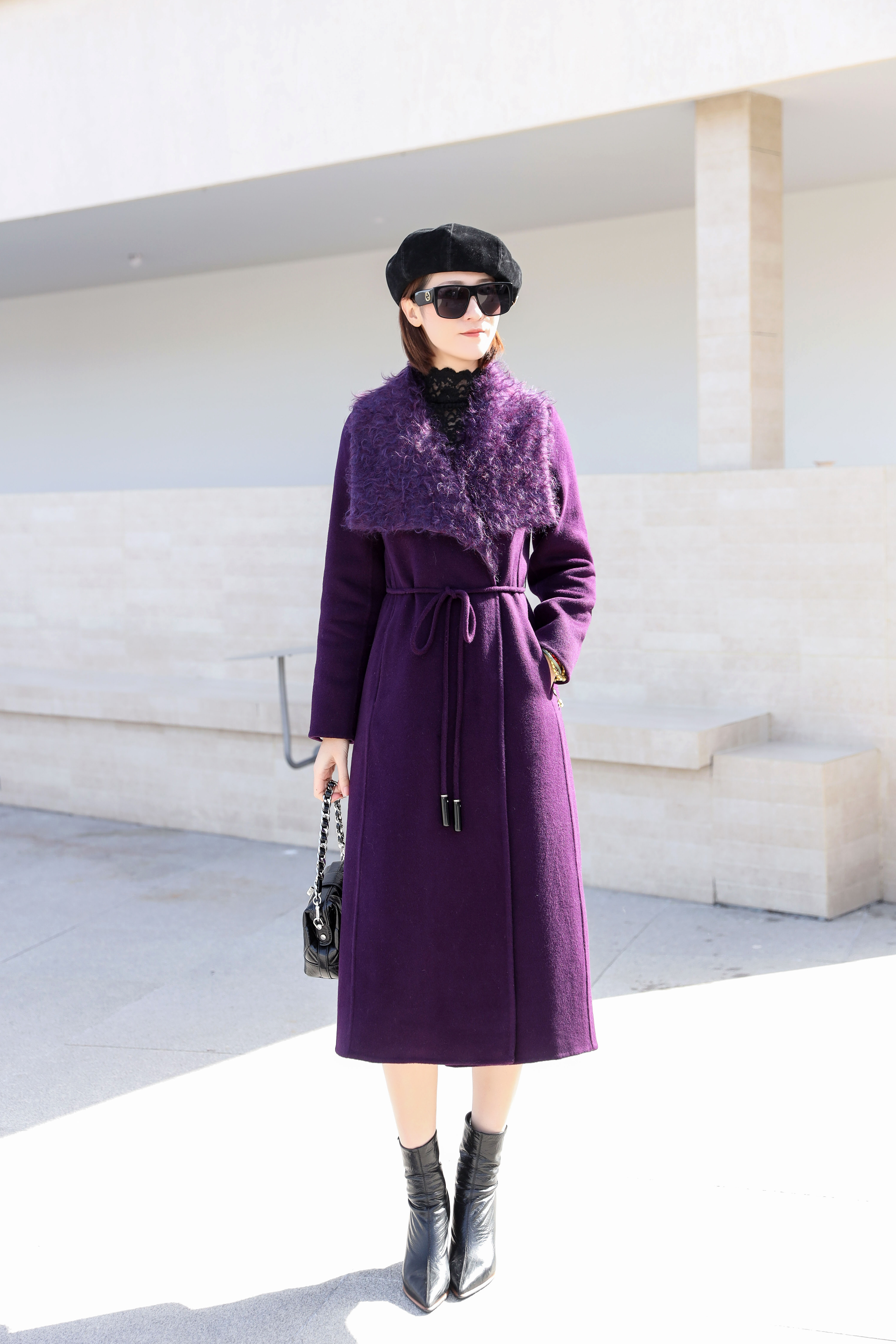 SZ6C16 紫色长款100%羊毛外套 双面呢×羊毛,奢柔二重奏 内外100%纯羊毛双面手工艺;马海毛大翻领,氛围感定格键 大气舒展的柔雾领口 毛茸触感瞬间点亮脸庞光泽;细腰绳勾勒,暗藏心机的浪漫