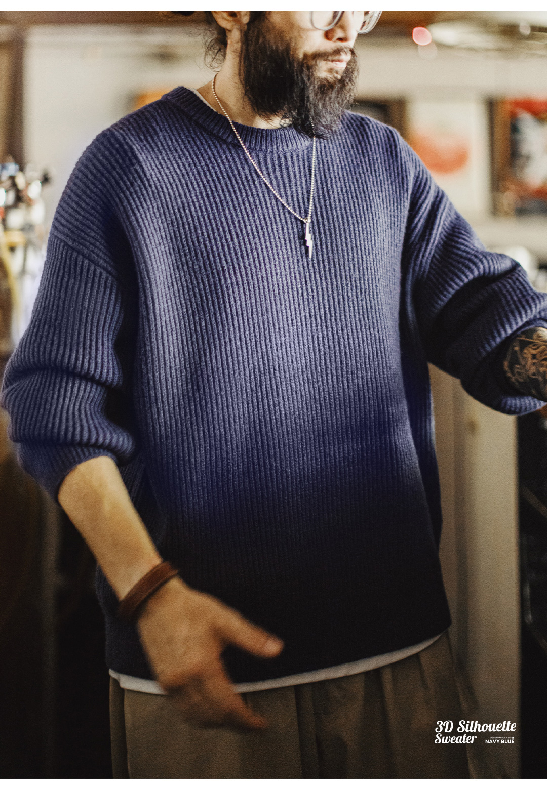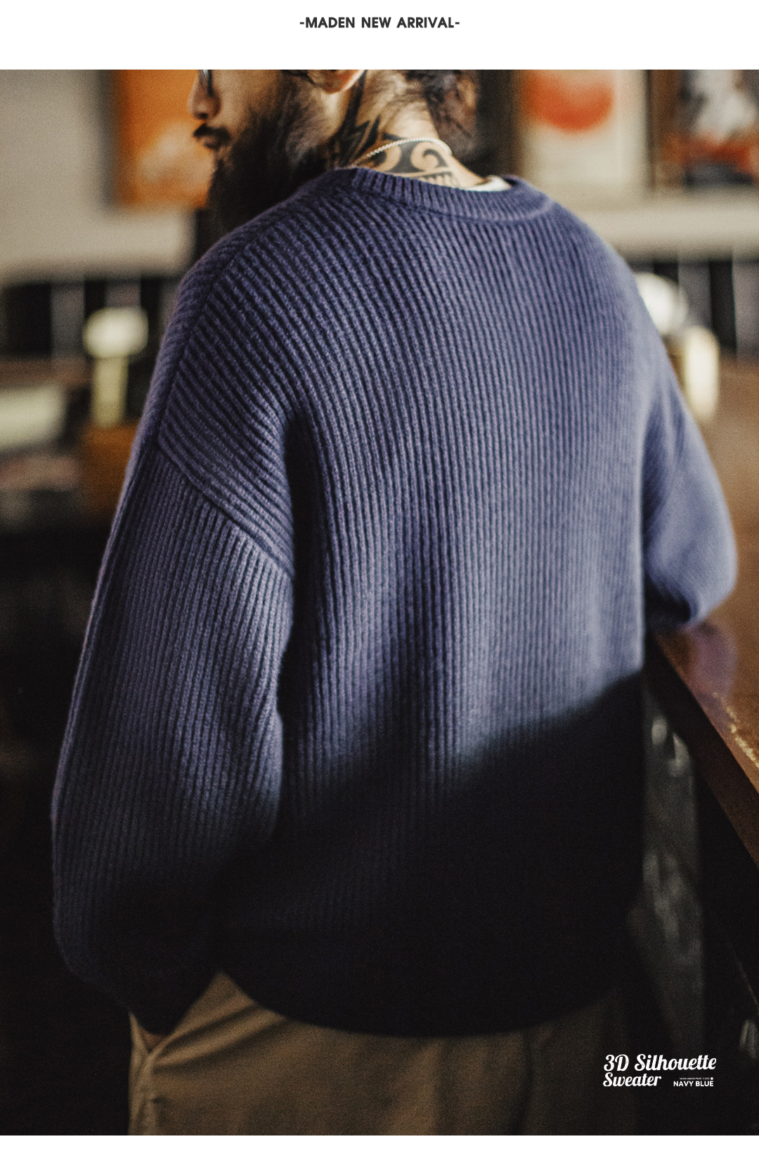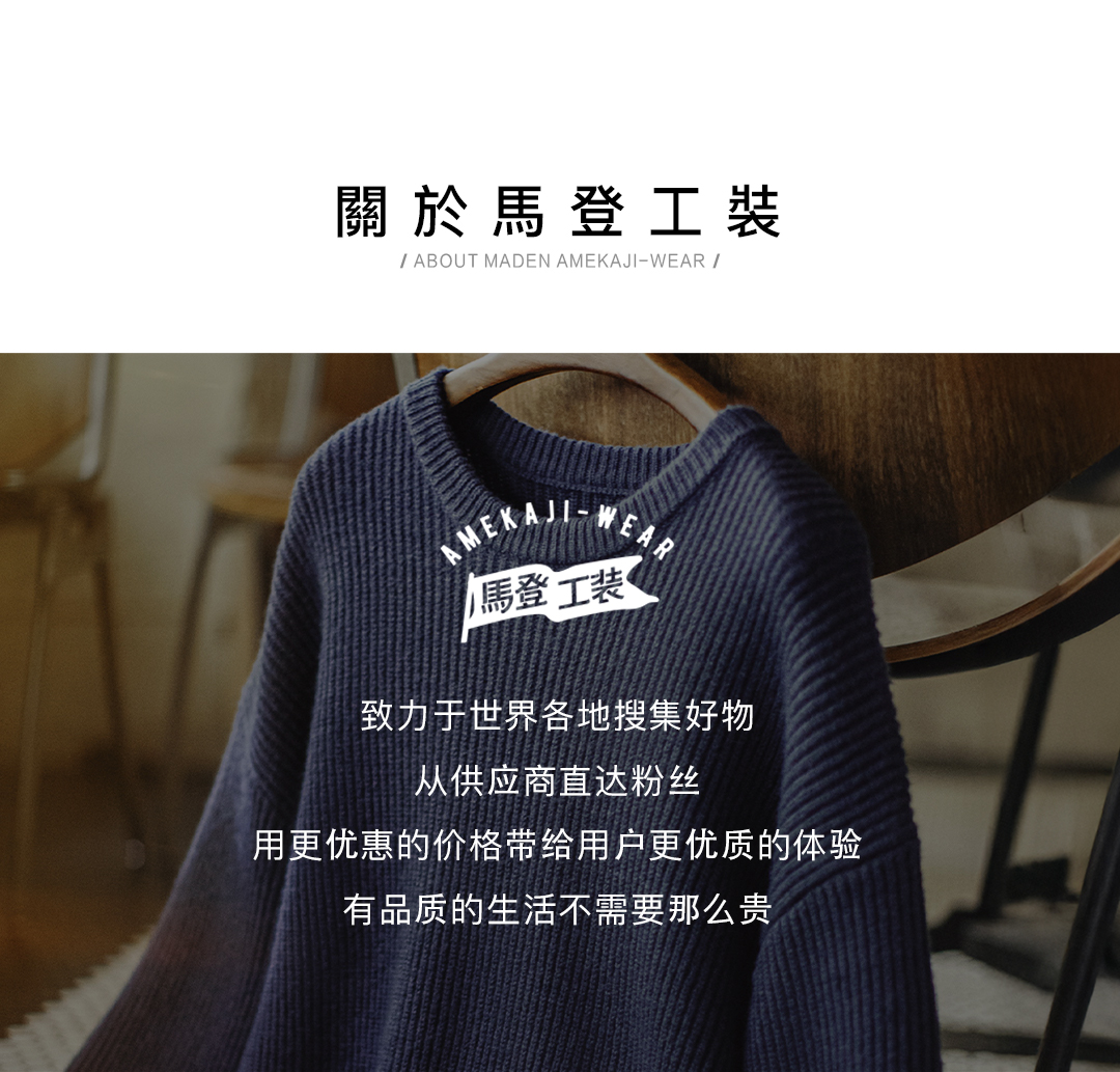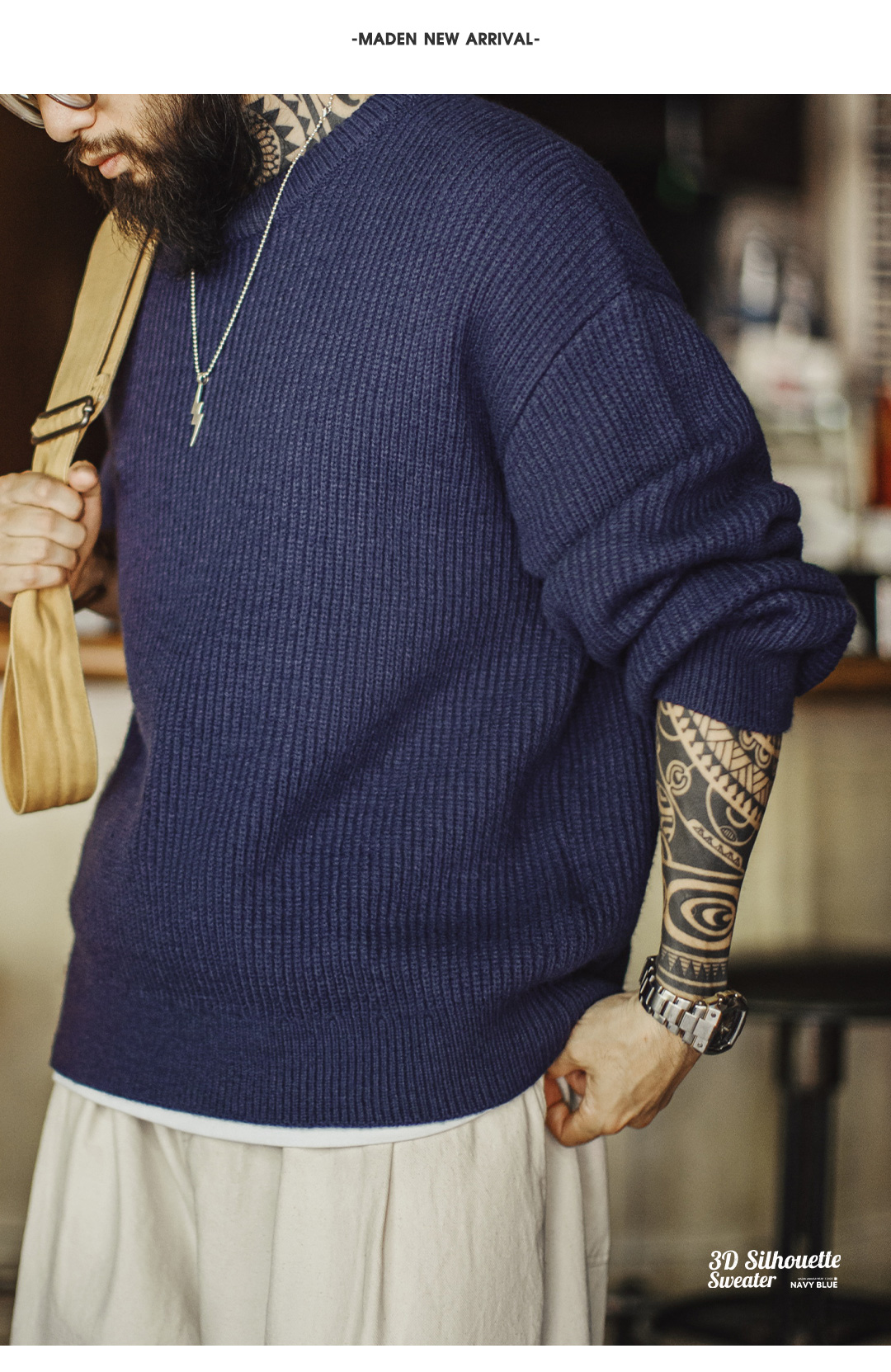 马登工装美式蓝色坑条毛衣圆领套头垂感外穿条纹上衣针织外套男冬