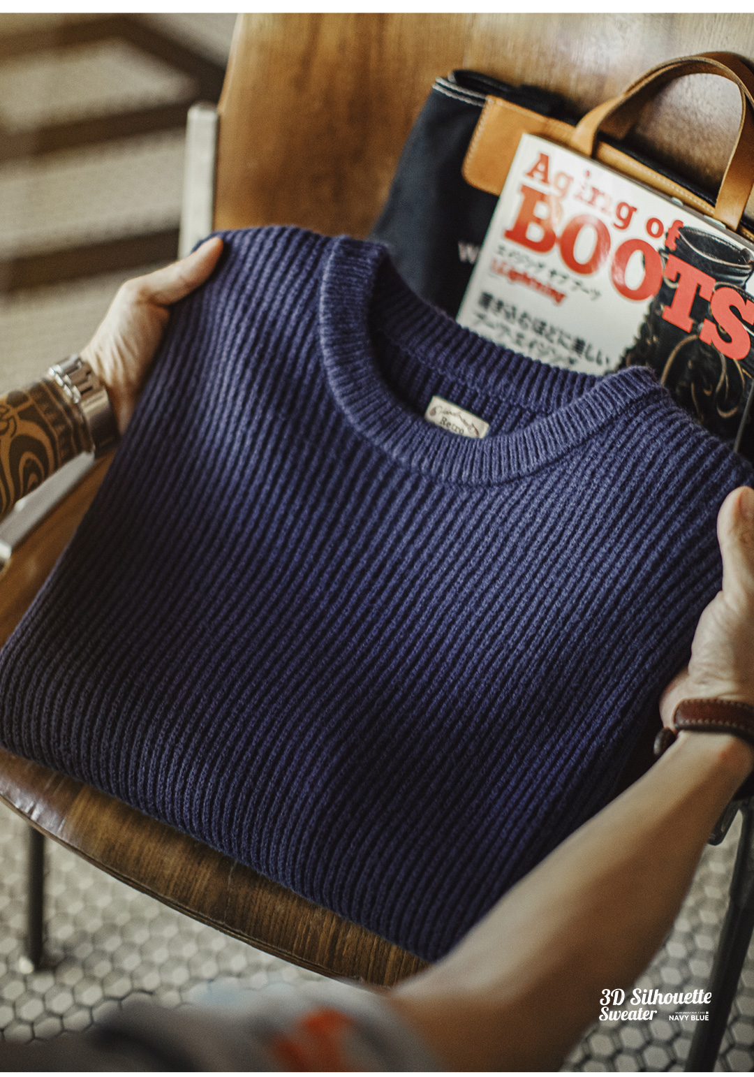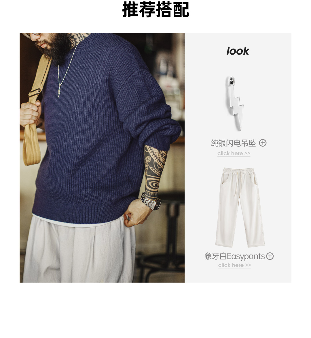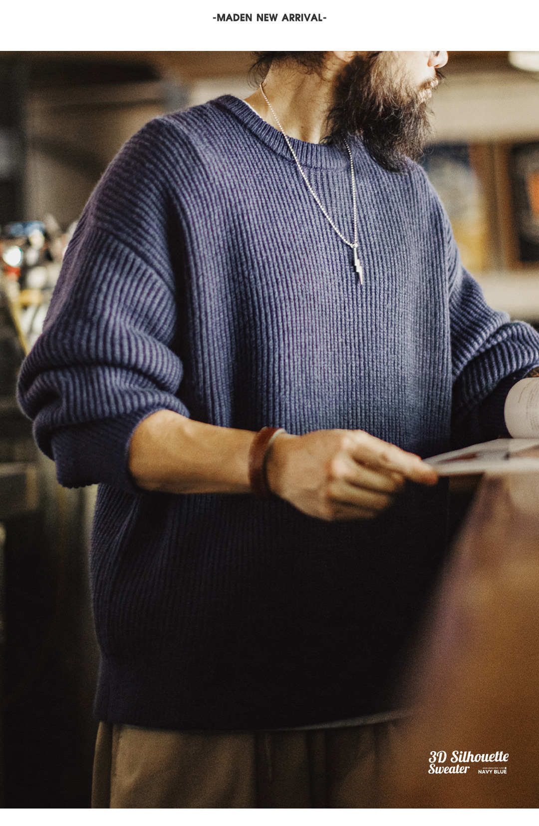 马登工装美式蓝色坑条毛衣圆领套头垂感外穿条纹上衣针织外套男冬