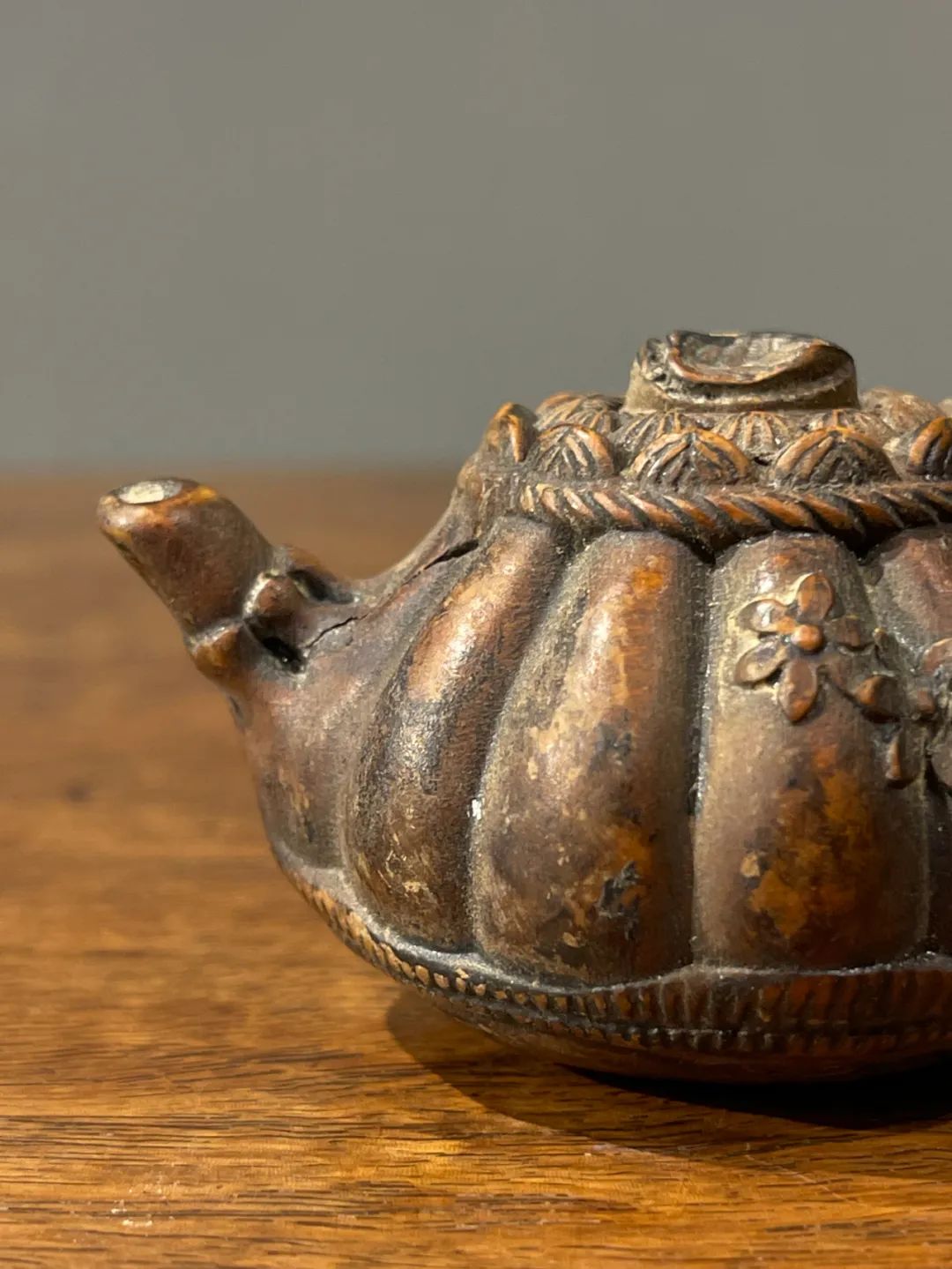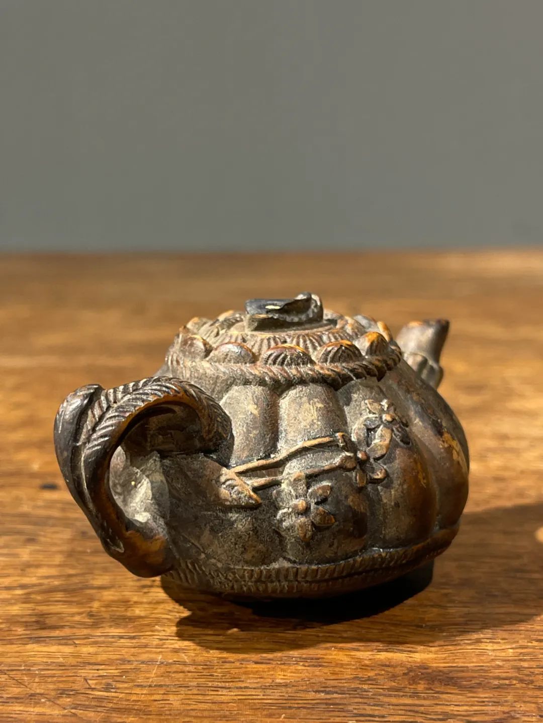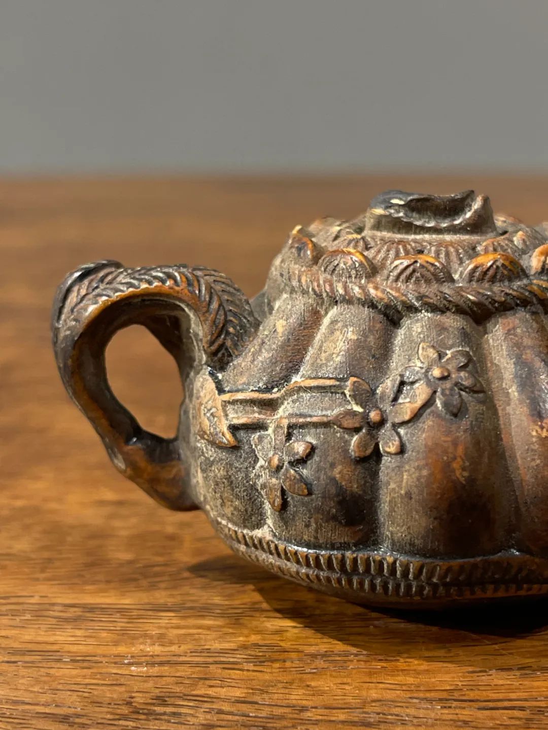 这是一件黄杨木雕刻而成的茶壶形摆件或是摆件,此件立体圆雕茶壶,取材质地坚硬、色泽柔美褐黄,质地细腻、表面光泽温润的黄杨木,雕琢成瓜棱壶身,表面浅浮雕梅花纹的把壶,仿紫砂壶风格惟妙惟肖,精緻生动,尺寸虽小,握于掌中盘玩令人心动、爱不释手。