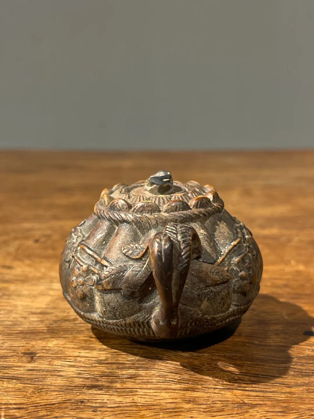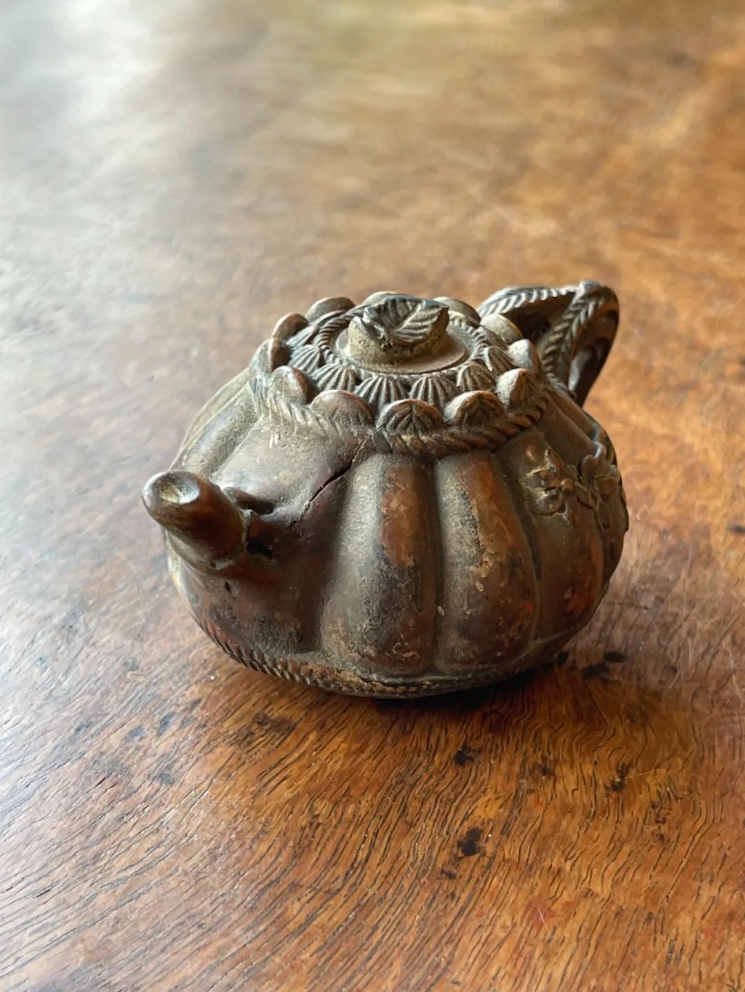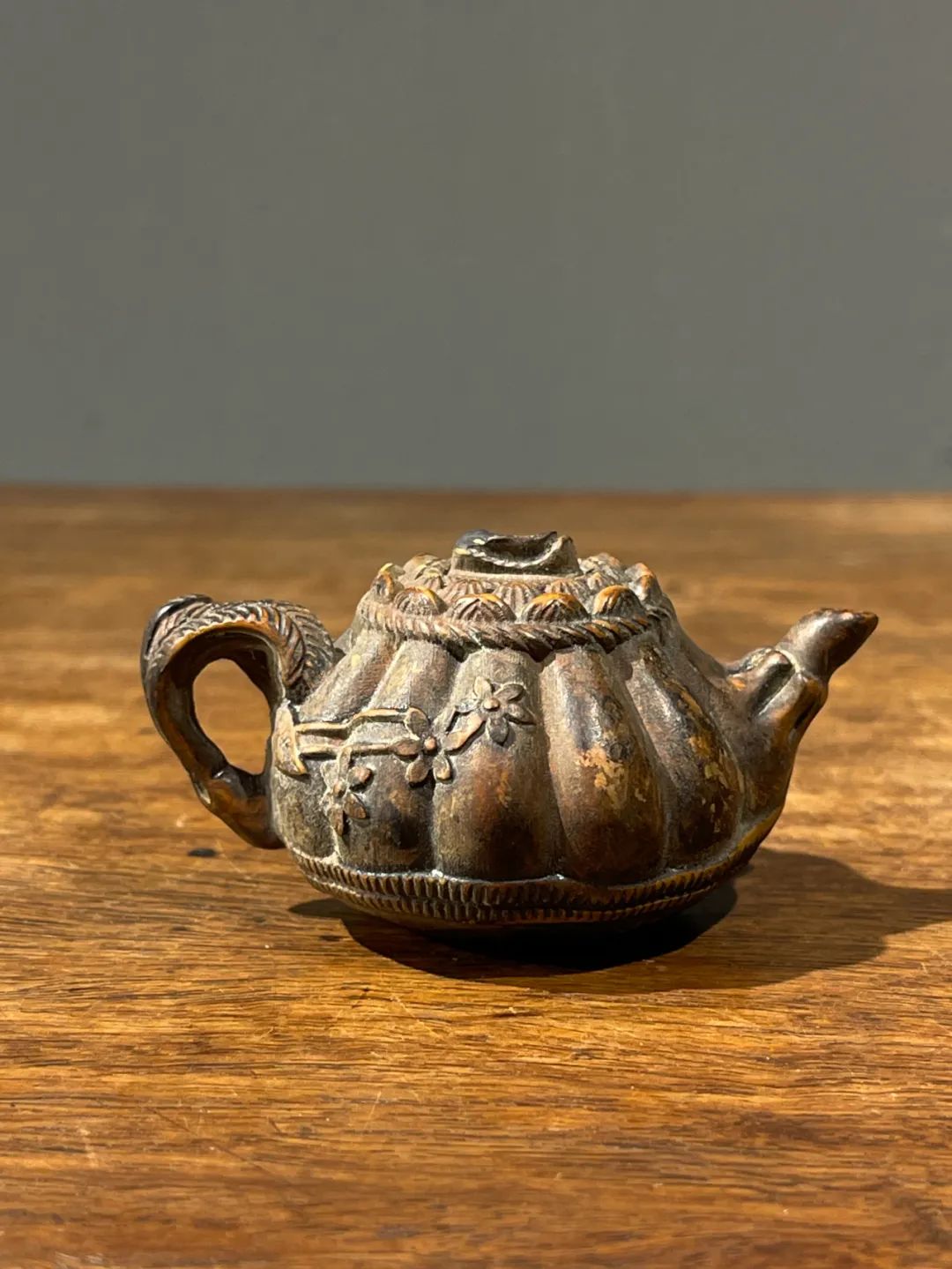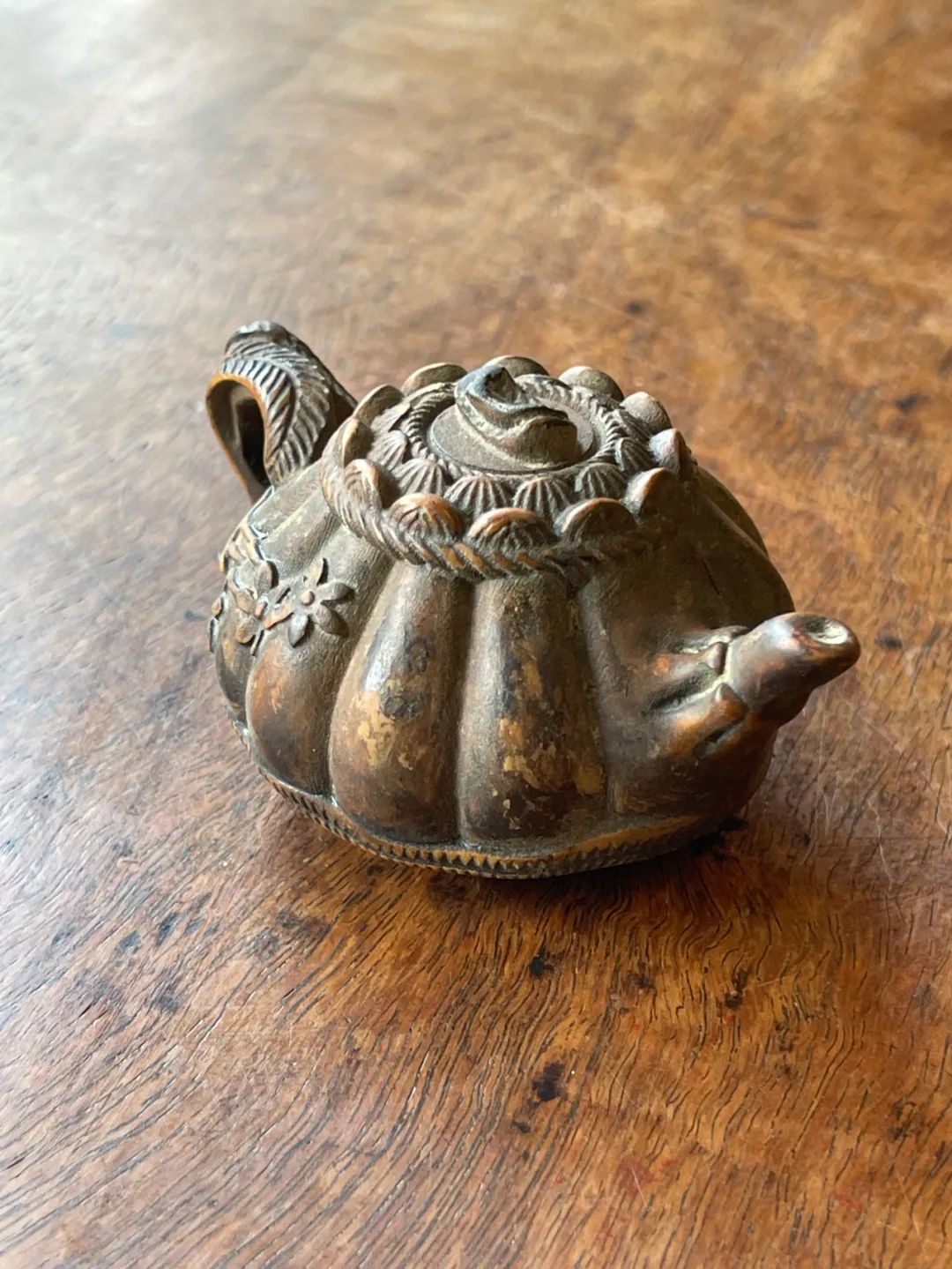 这是一件黄杨木雕刻而成的茶壶形摆件或是摆件,此件立体圆雕茶壶,取材质地坚硬、色泽柔美褐黄,质地细腻、表面光泽温润的黄杨木,雕琢成瓜棱壶身,表面浅浮雕梅花纹的把壶,仿紫砂壶风格惟妙惟肖,精緻生动,尺寸虽小,握于掌中盘玩令人心动、爱不释手。