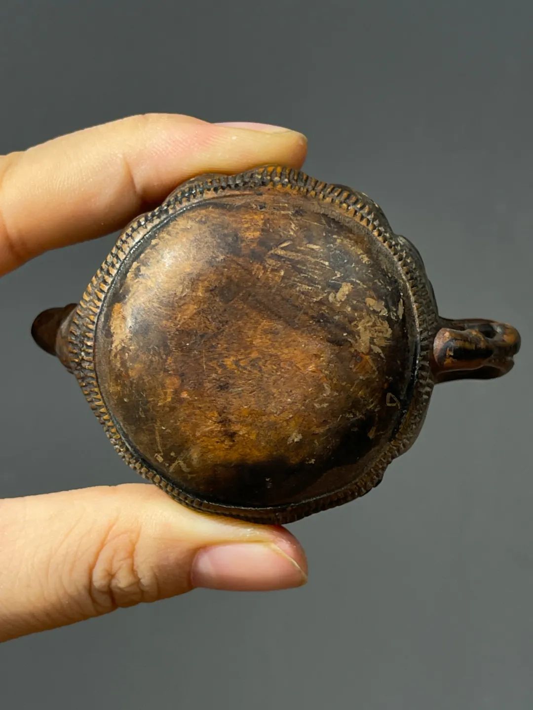 黄杨木是产自我国南方的树木,生长百年直径才加粗一尺,其木质柔韧细密,色泽淡黄瑕疵少,质地细腻,其润泽可媲美象牙。此黄杨木雕茶壶把玩/摆件,立体仿紫砂壶,整体造型圆融雅致,雕镂打磨精致细腻,非卓越工匠不可为之,是年代挺老的木雕手把玩件。