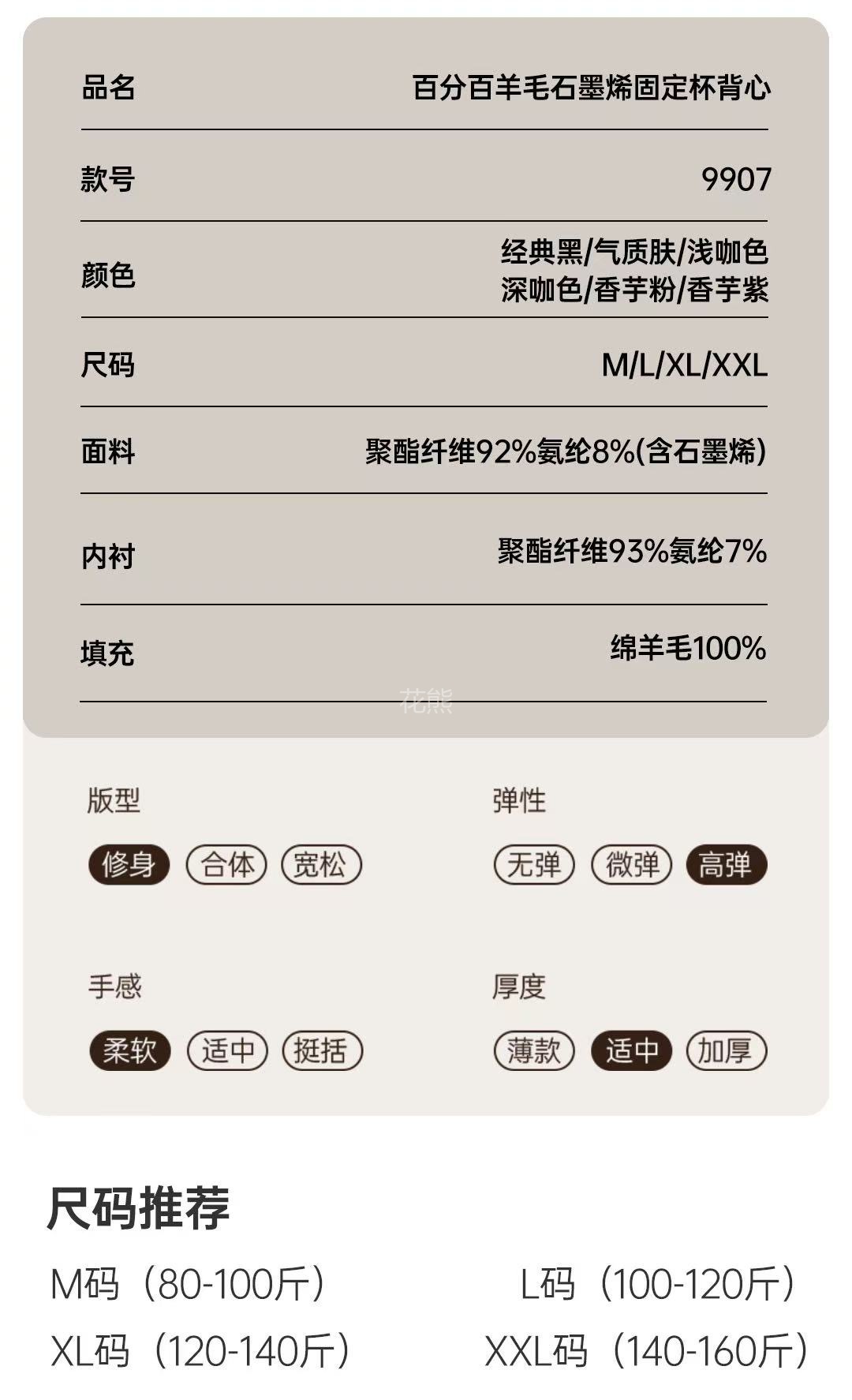 【面料】面层:聚酯纤维92%氨纶8%(含石墨烯)内衬:聚酯纤维93%氨纶7%填充:绵羊毛100%