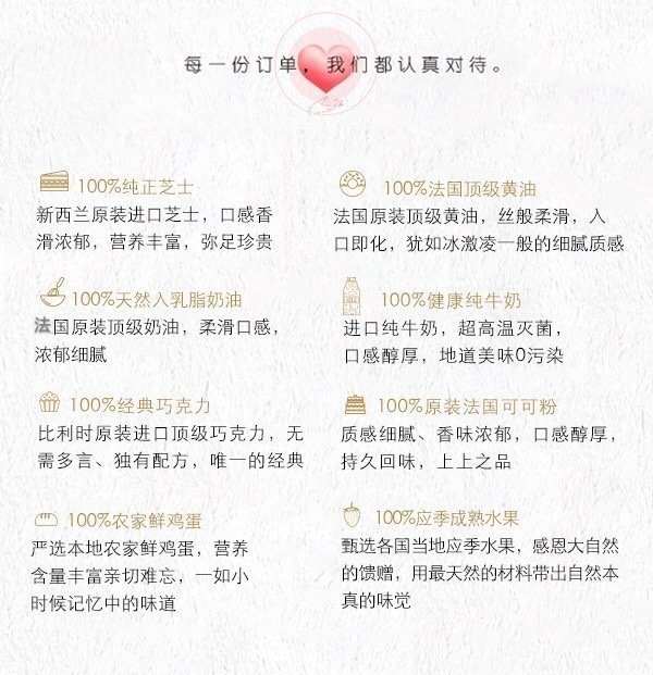 蛋糕主要原材料:100%纯动物奶油、新鲜水果、进口面粉、乳酪、法国进口黄油、纯牛奶、鲜鸡蛋