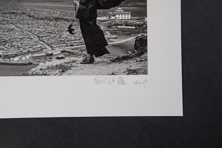 此作品是60名家作品中的其中之一,创作于2010年,作者三度被评为"中国最有影响力摄影人物", 可能是中国难得的数十年全身心投入拍摄宗教信仰的摄影家。他始终坚持通过追寻一种往往隐藏于僧侣们的日常生活中的视觉蕴籍来展现某种视觉上的戏剧性以及这背后的诗意。本幅作品记录了一位站立修行地高处的女尼,眺望远方,有一种日常的神圣性,纯净,宁静,散发一种特殊的精神气息,让我们看到,在这片辽阔的梵天佛地上,生命、信仰与大地共存。