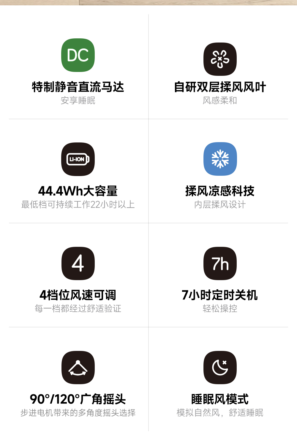 3.功能加强,比如80°广角摇头、7小时定时关机、“睡眠风”模式等。