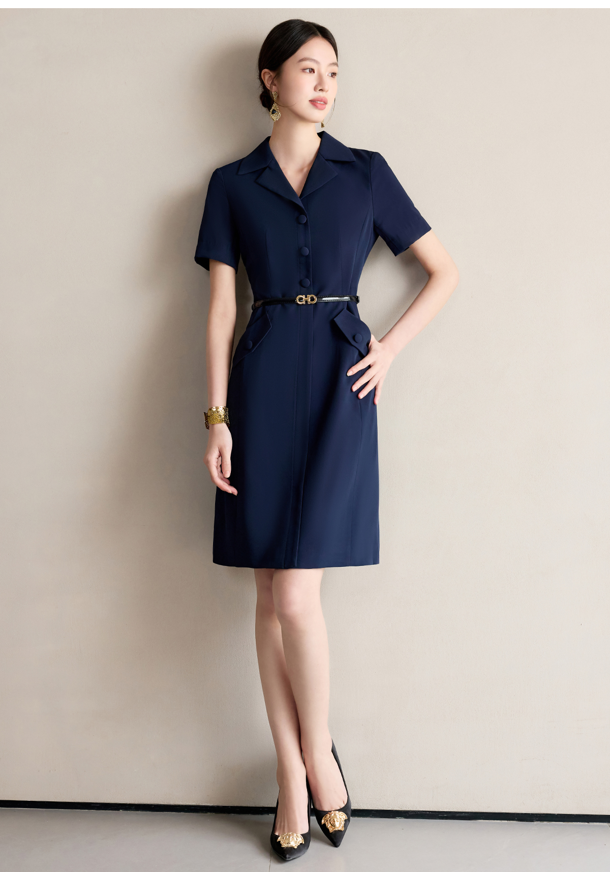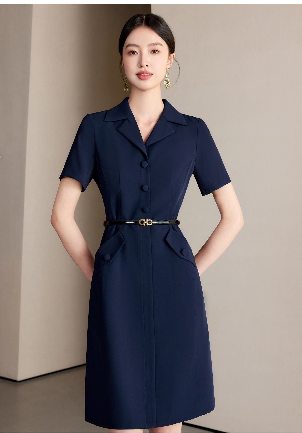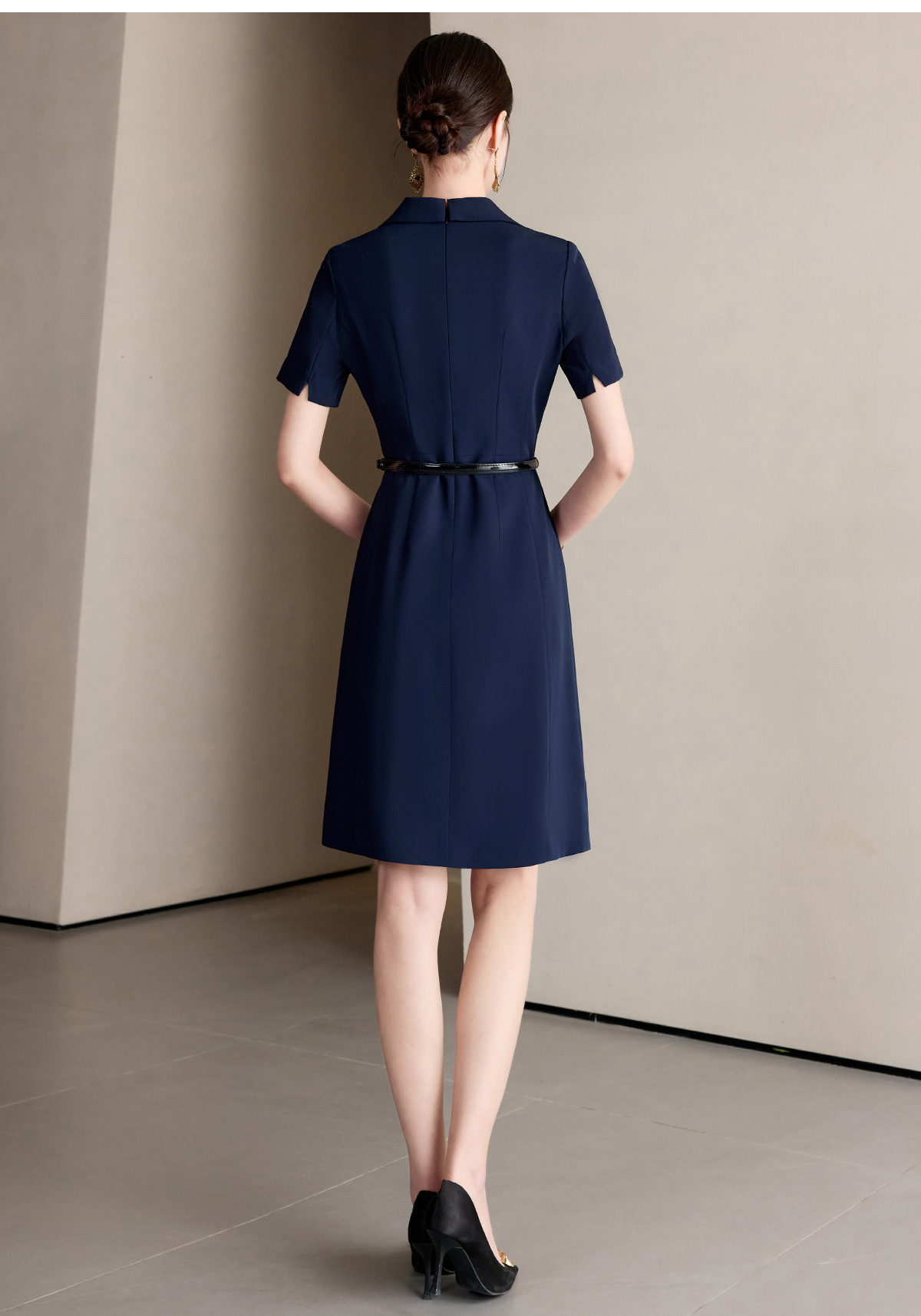 艾尚臣藏青色收腰显瘦连衣裙女2025新款高级感气质A字职业工作服