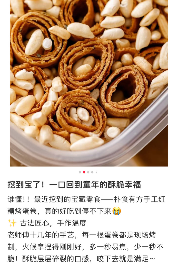 偶尔还会想起,小时候巷口老师傅推着小摊现烤现卖的蛋卷香气,金黄的蛋卷在铁板上慢慢成型,刚卷好的酥脆口感,混着鸡蛋和糖的甜香,是刻在记忆里的小美好!之前其实也上过,后来断货,也是一直有点小怀念呢,所以朴食有方一出,马上要了样品试了试,很不错吃哦!