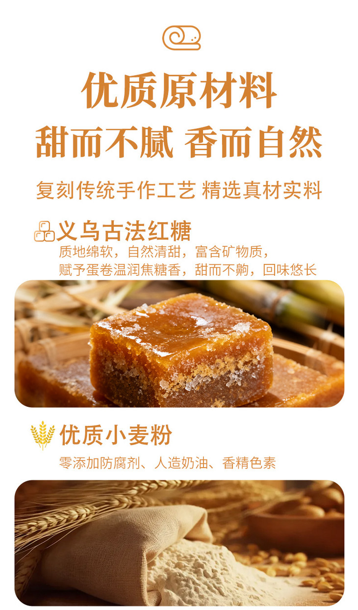 蛋卷没有用普通白糖,而是用了义乌的古法红糖,经过传统工艺慢熬而成,赋予蛋卷温润的焦糖香气,甜而不齁,嚼完后嘴里还留着淡淡的甘醇,没有工业甜味的腻感。而且鸡蛋添加量高达30%,都是农家散养的土鸡蛋——鸡群吃五谷杂粮长大,拒绝激素饲料,蛋香浓,腥味淡,经过烘烤后,蛋卷呈现出诱人的焦黄色,一打开罐子就香气外溢。再加上优质小麦粉、黑芝麻,全程没有添加防腐剂、人造奶油,也没有香精和色素,老人孩子也能吃!