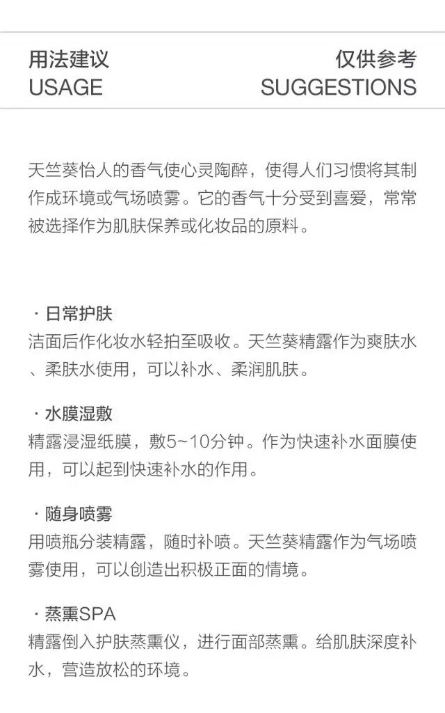 1.精露爽肤水/随身喷雾:洁面后,避开眼睛部位,均匀喷洒于面部,再用精华和面霜,加强吸收。旅行出差随身喷雾,随时补充肌肤水分。