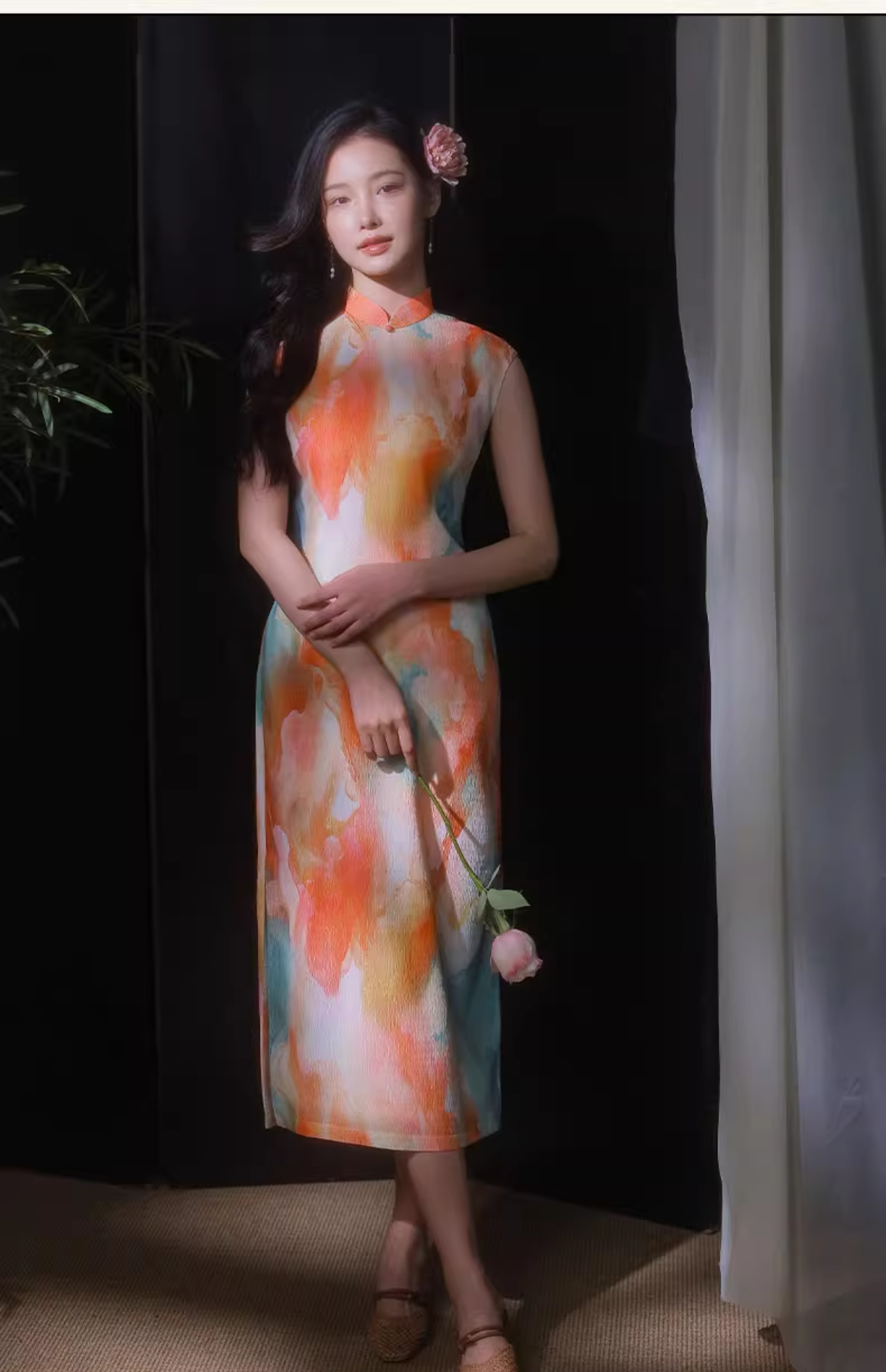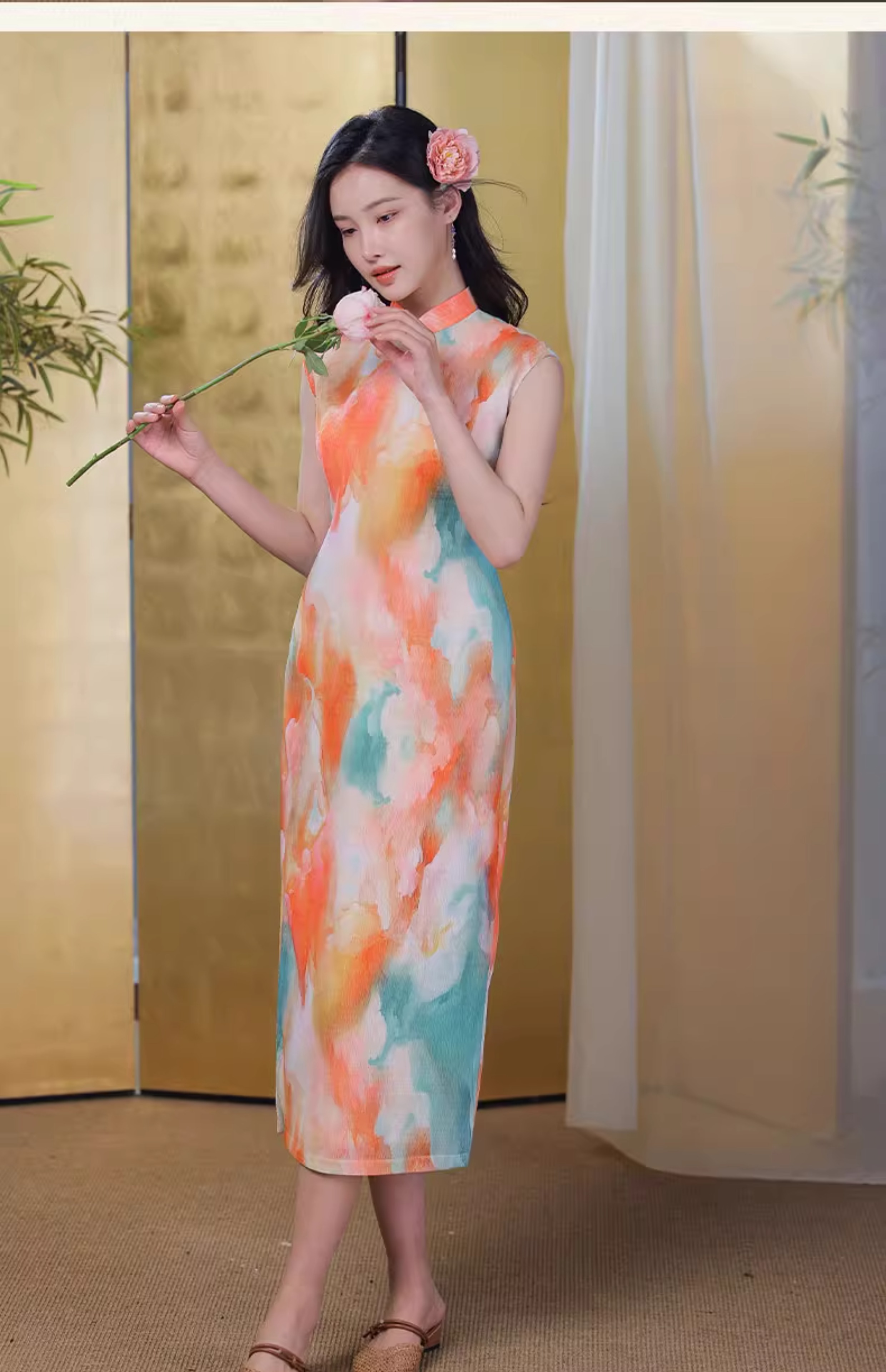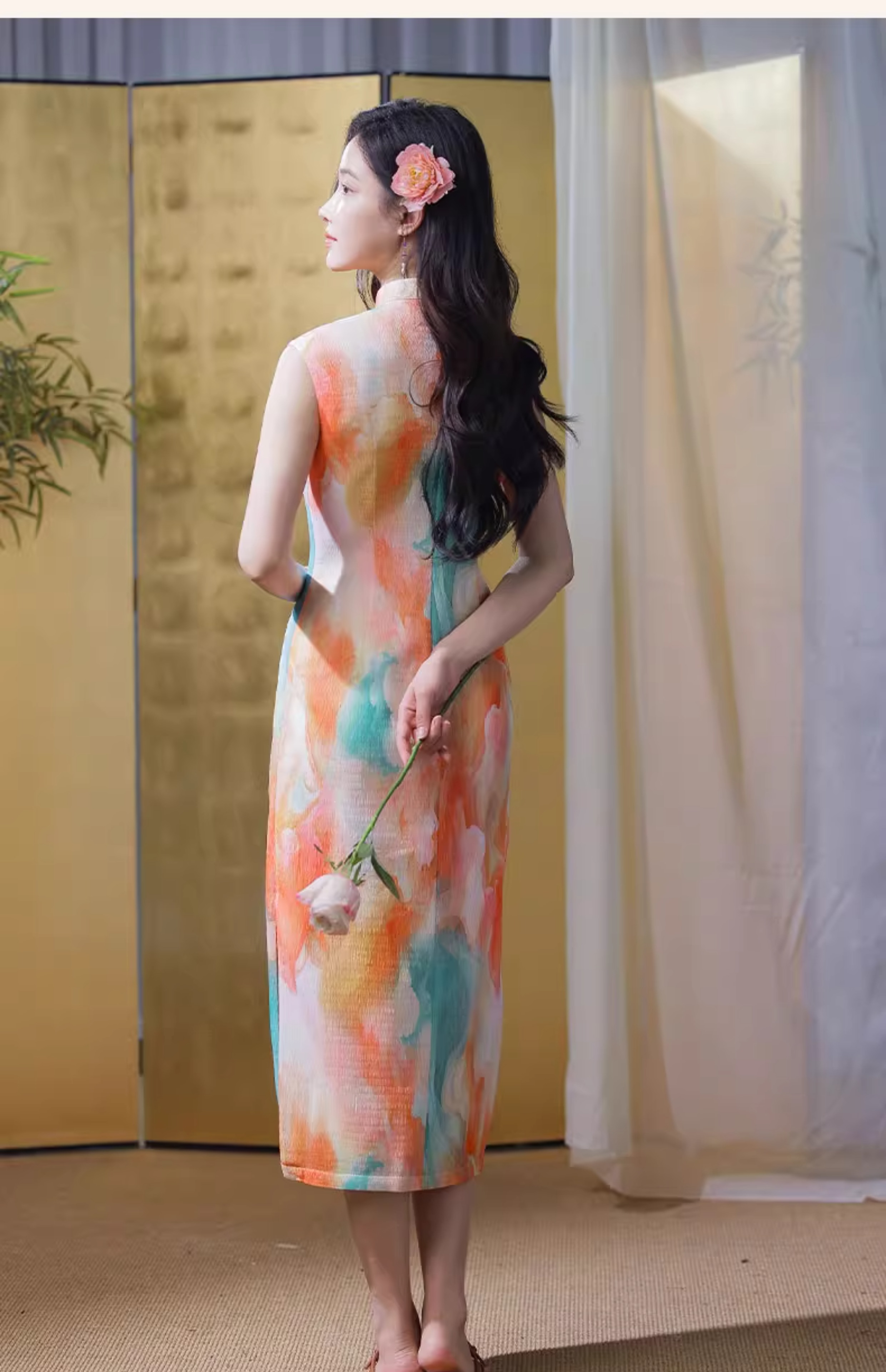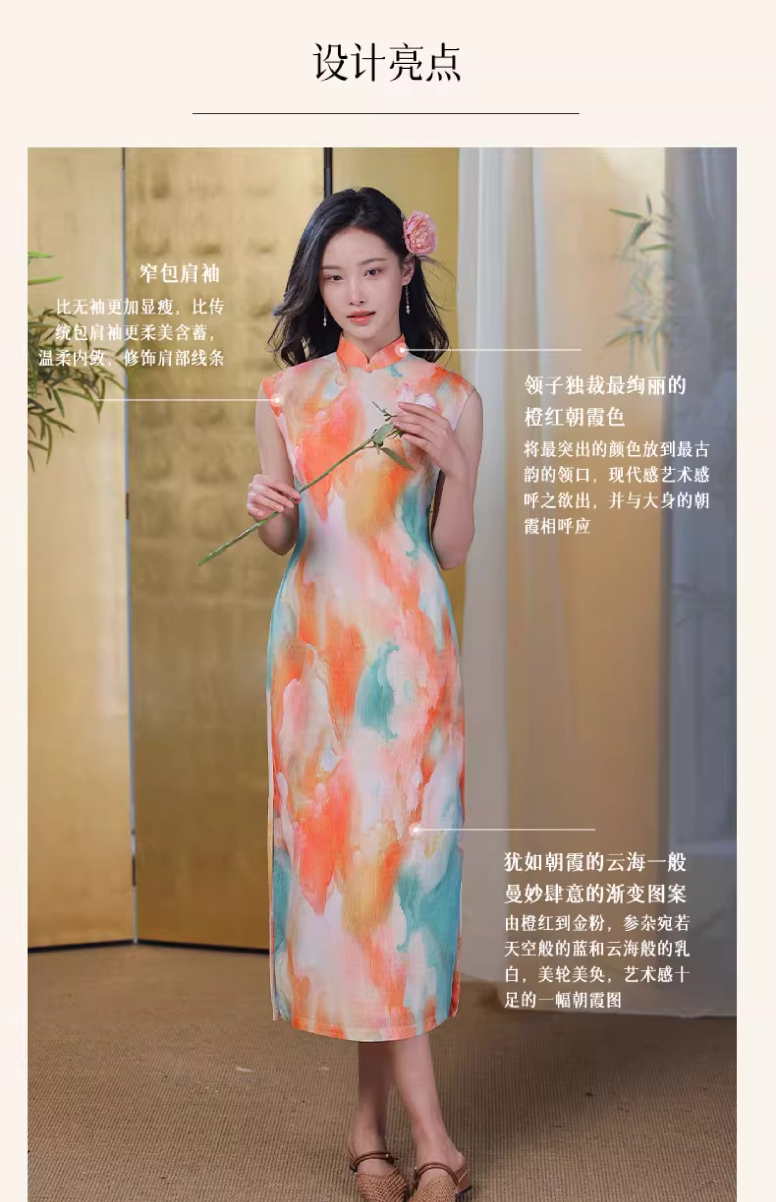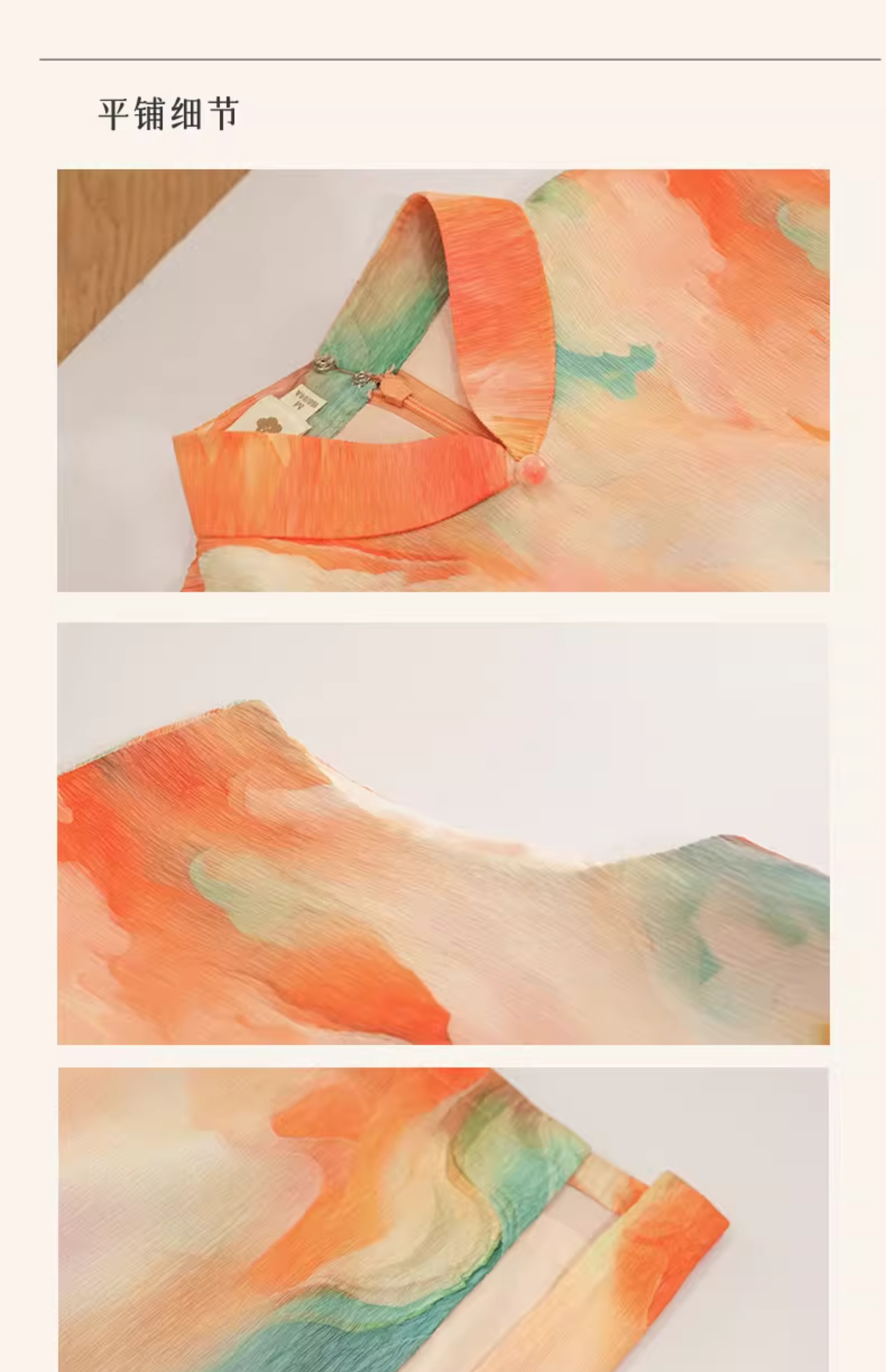 逸红颜婳火2025夏季新款植物染渐变艺术褶皱新中式低领改良旗袍女