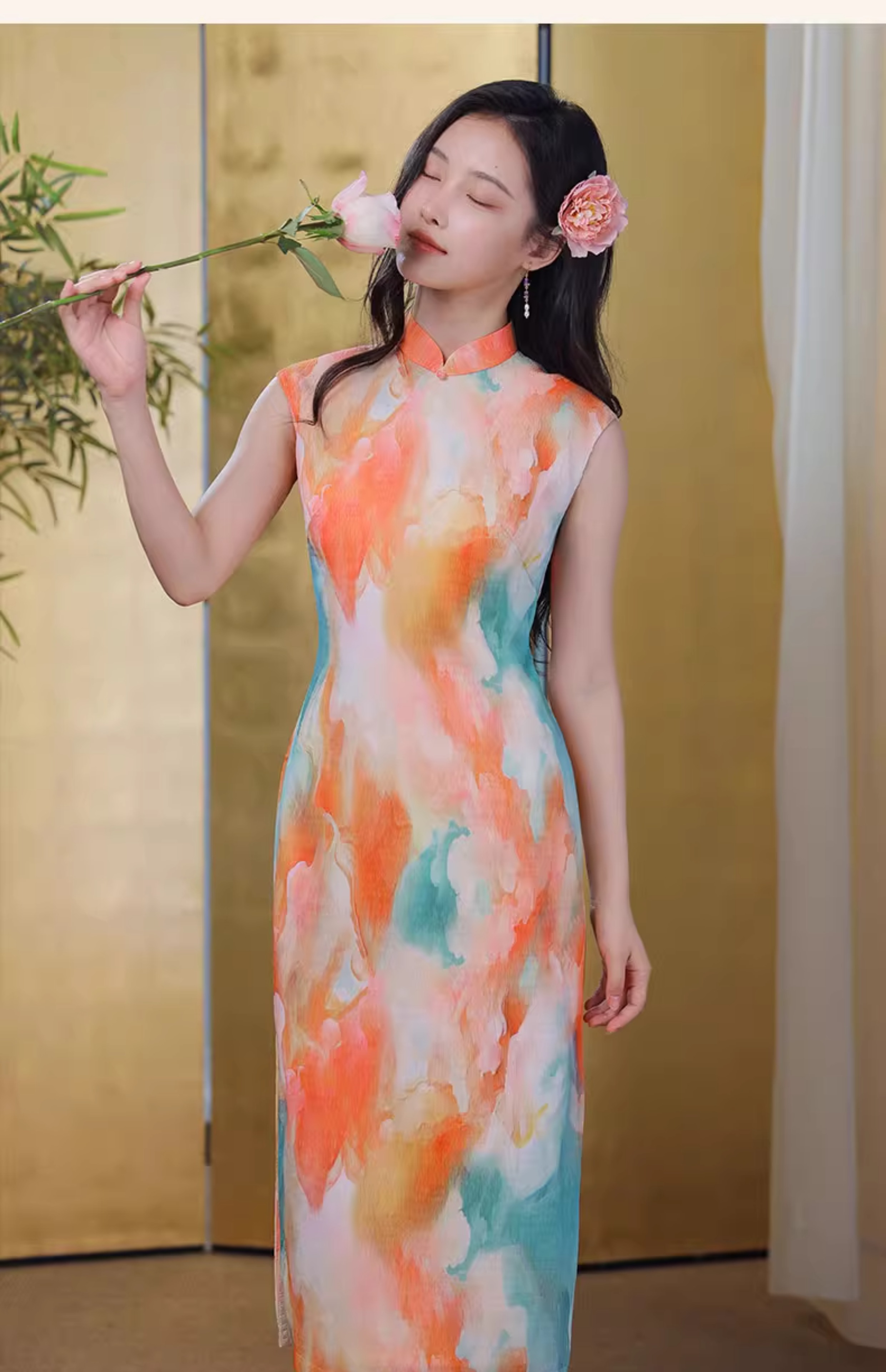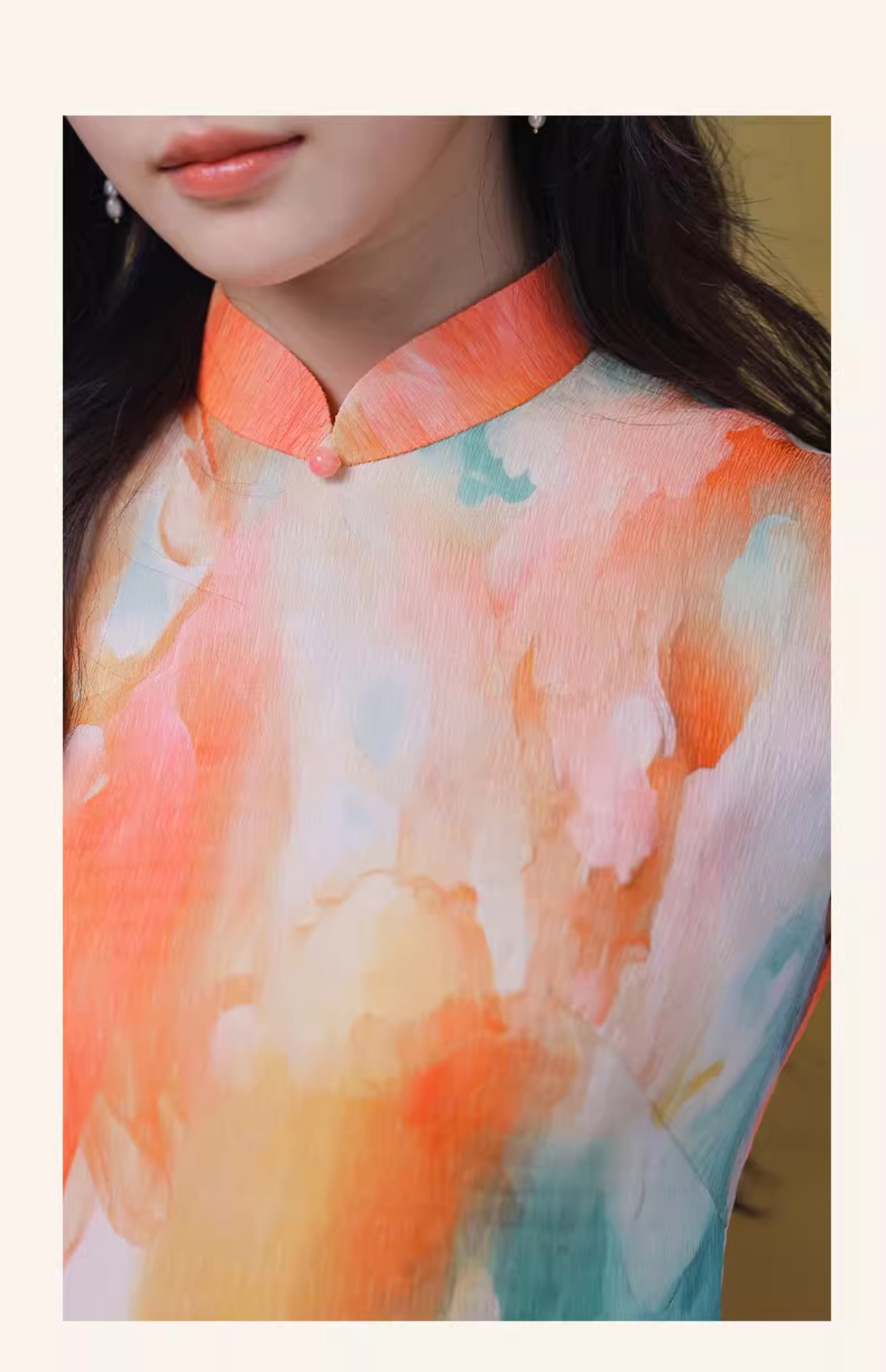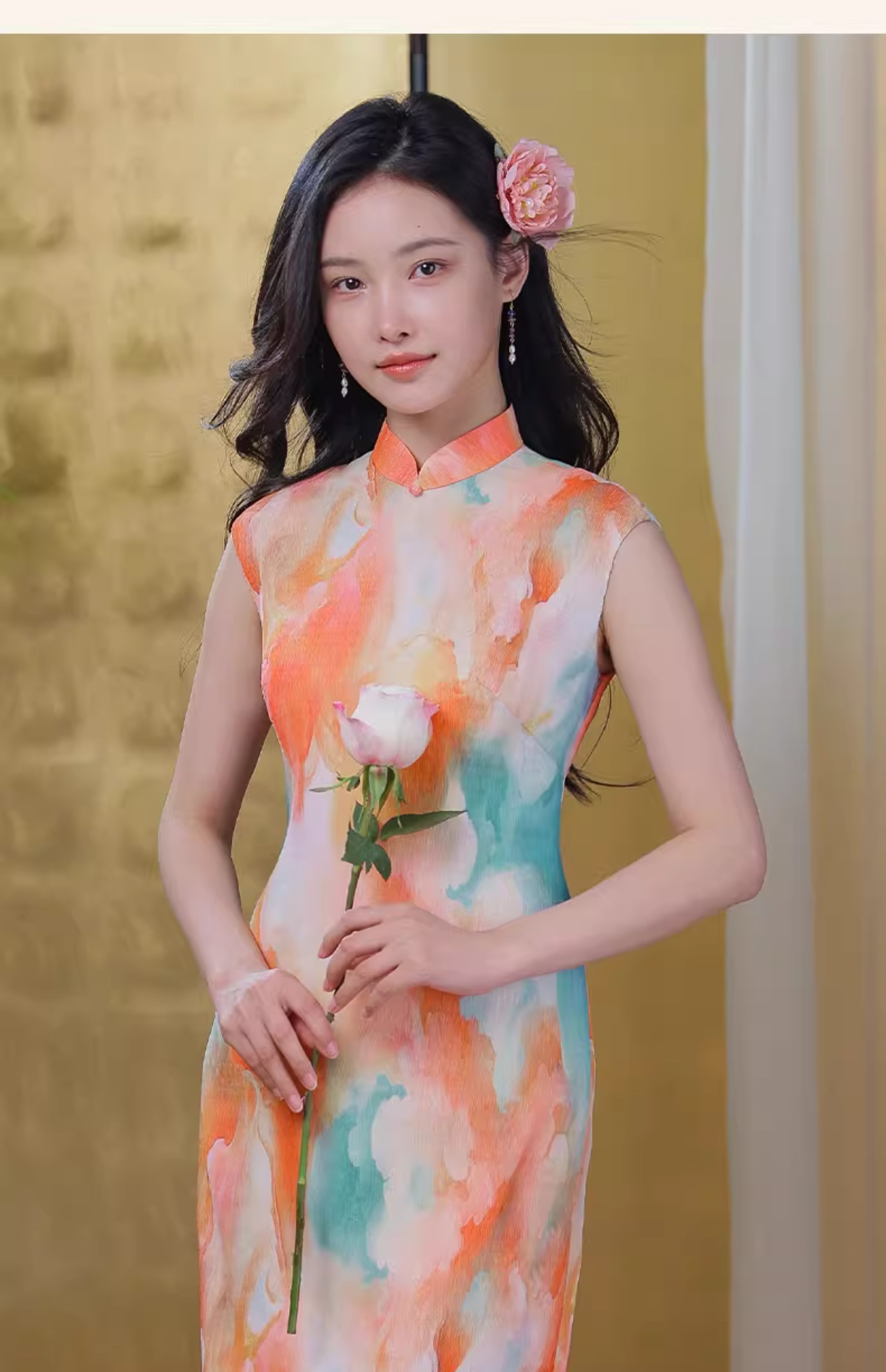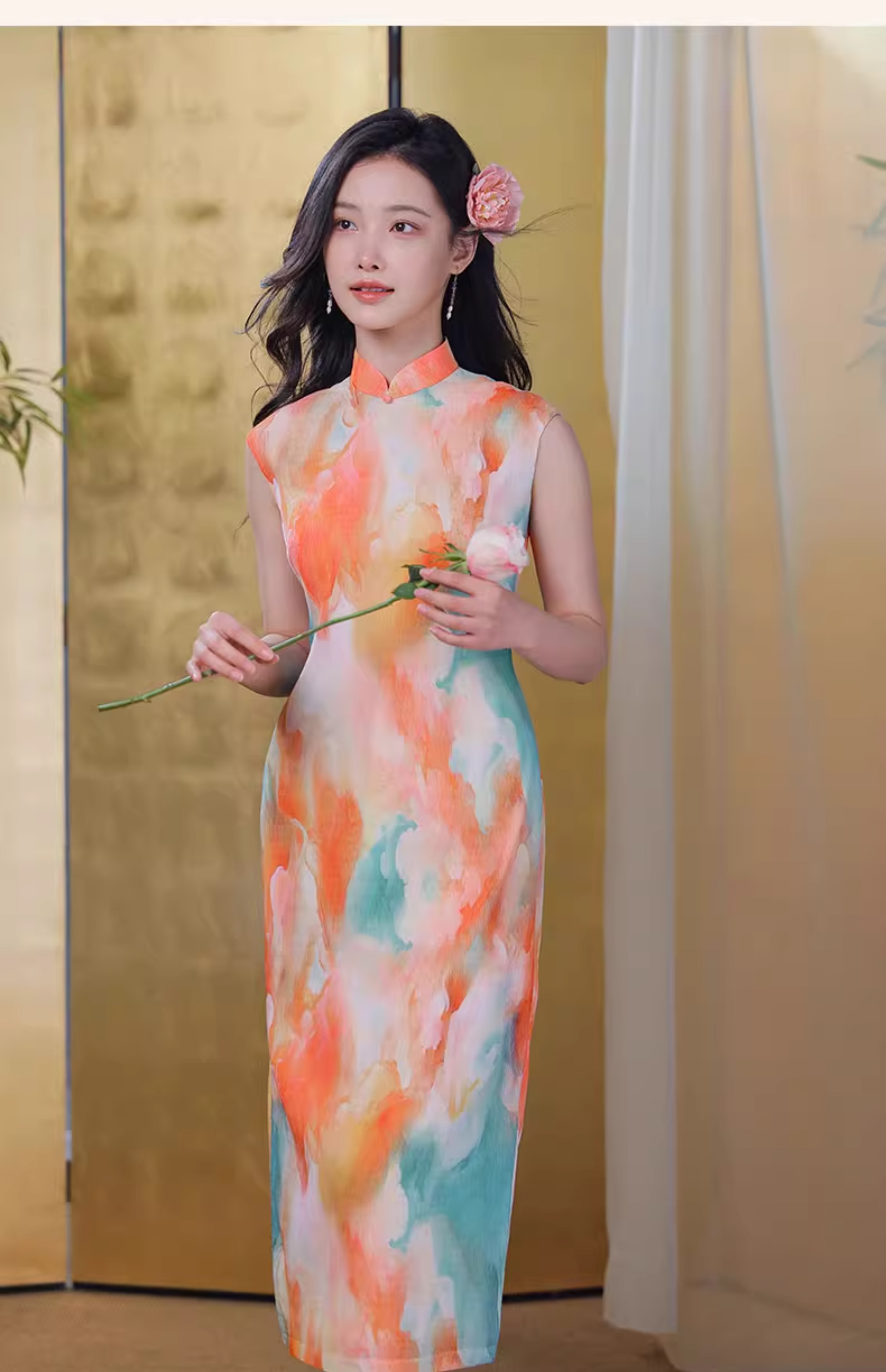 逸红颜婳火2025夏季新款植物染渐变艺术褶皱新中式低领改良旗袍女