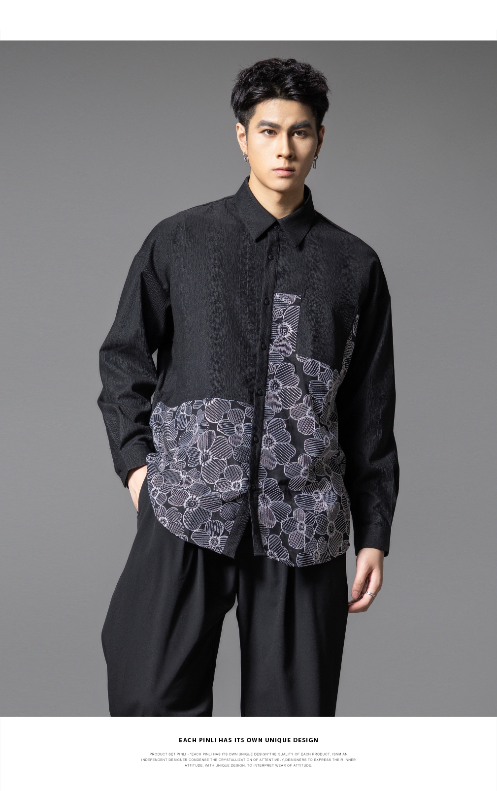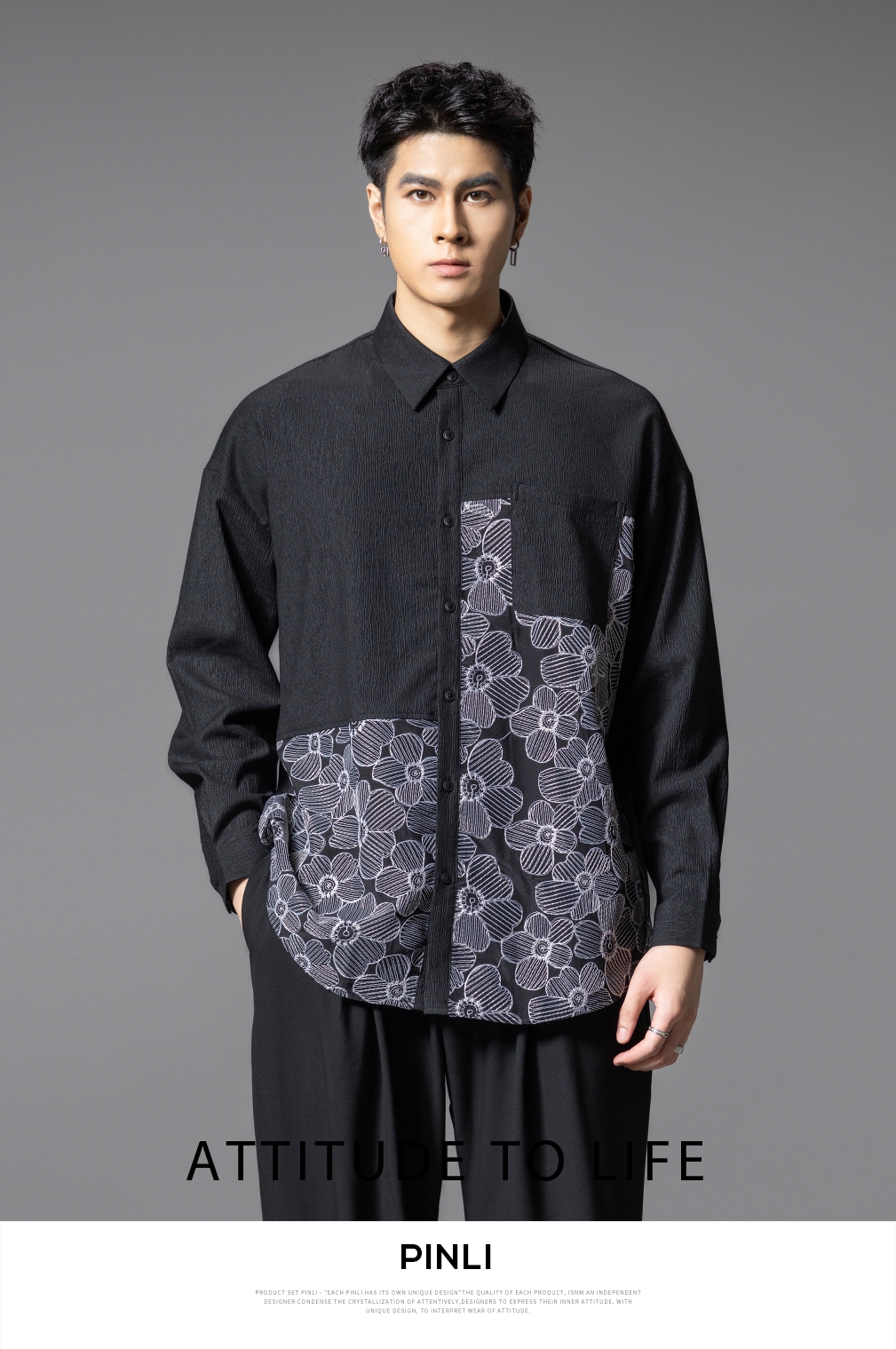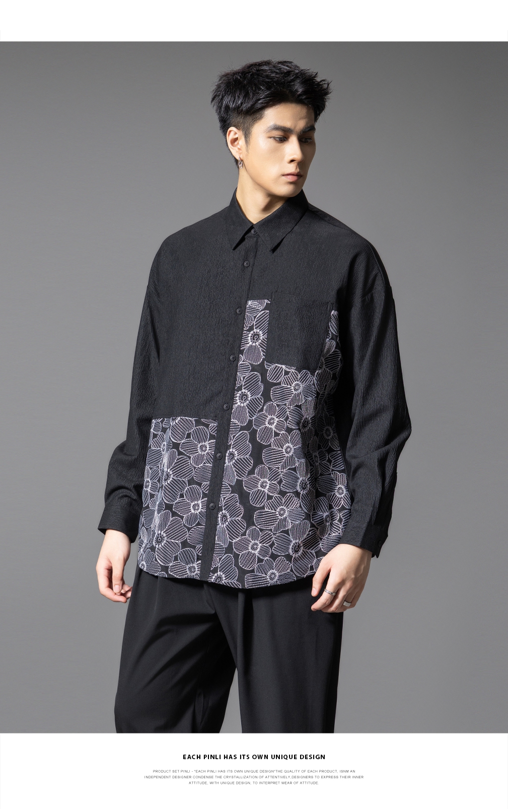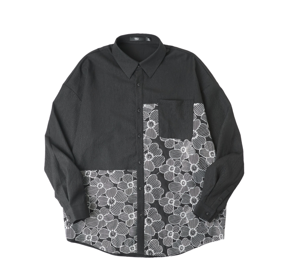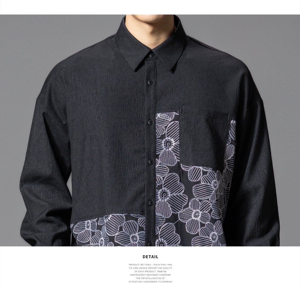 PINLI品立春季新款拼接刺绣长袖衬衫男肌理感休闲宽松衬衣潮B253113003