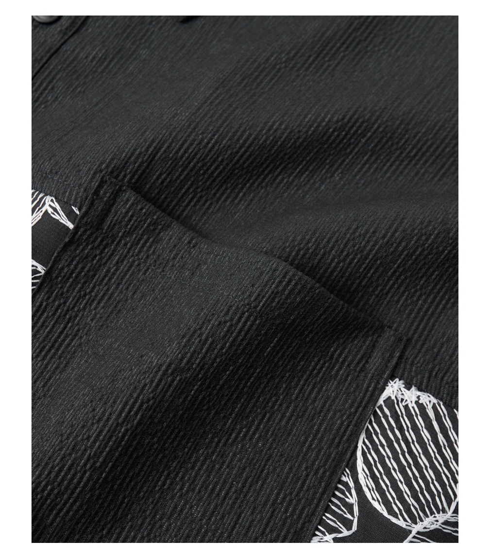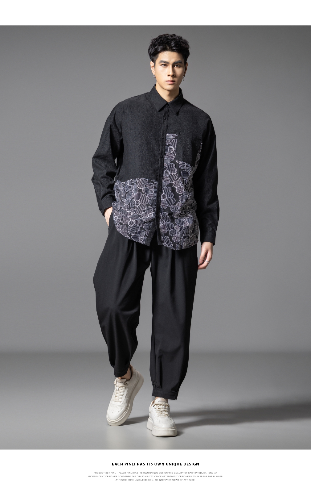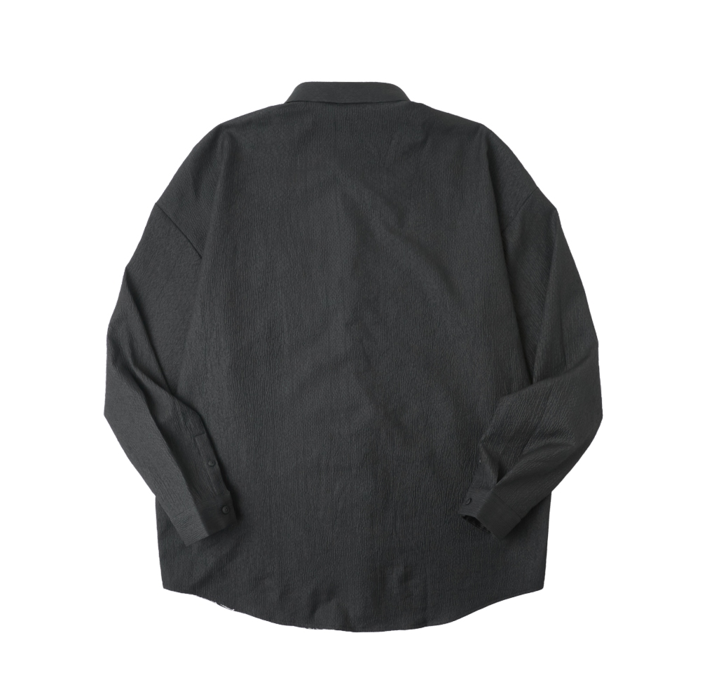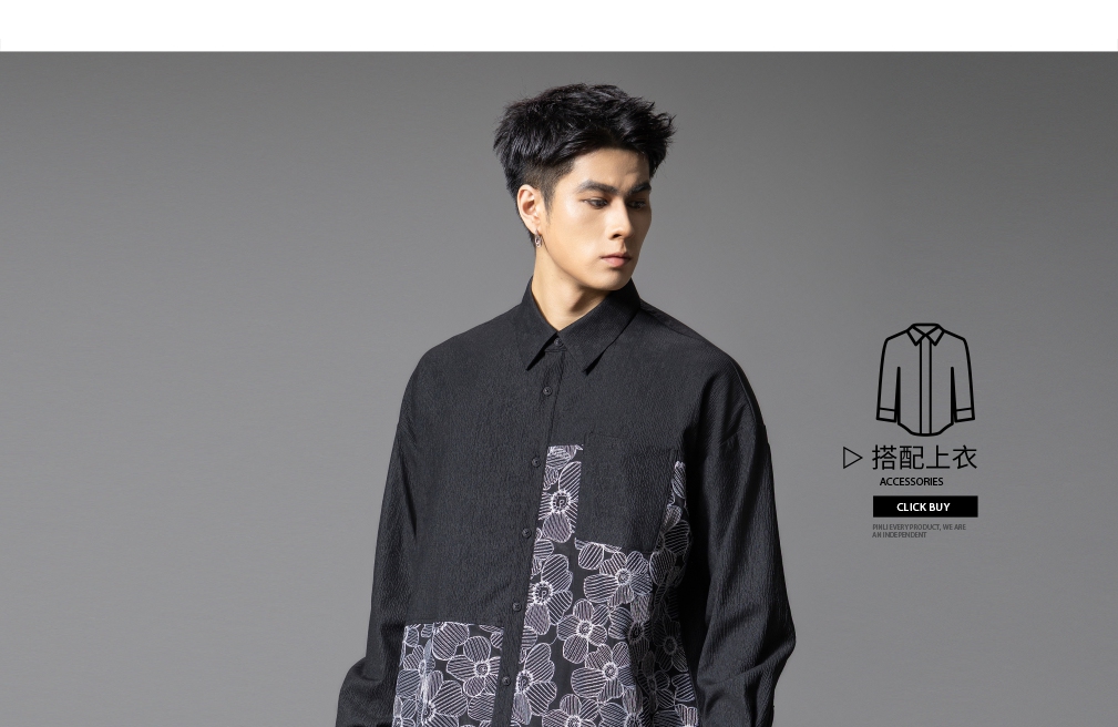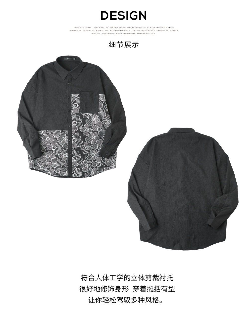 PINLI品立春季新款拼接刺绣长袖衬衫男肌理感休闲宽松衬衣潮B253113003