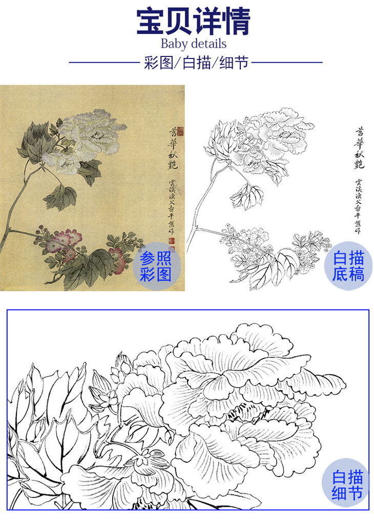 【有步骤、大彩图】李晓明工笔画白描底稿小品《胜葛巾》牡丹花鸟线稿KG20