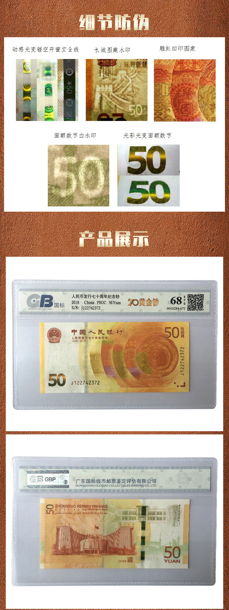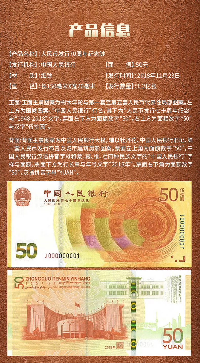 2018年人民币发行70年周年纪念钞 全新品相 无技术改号