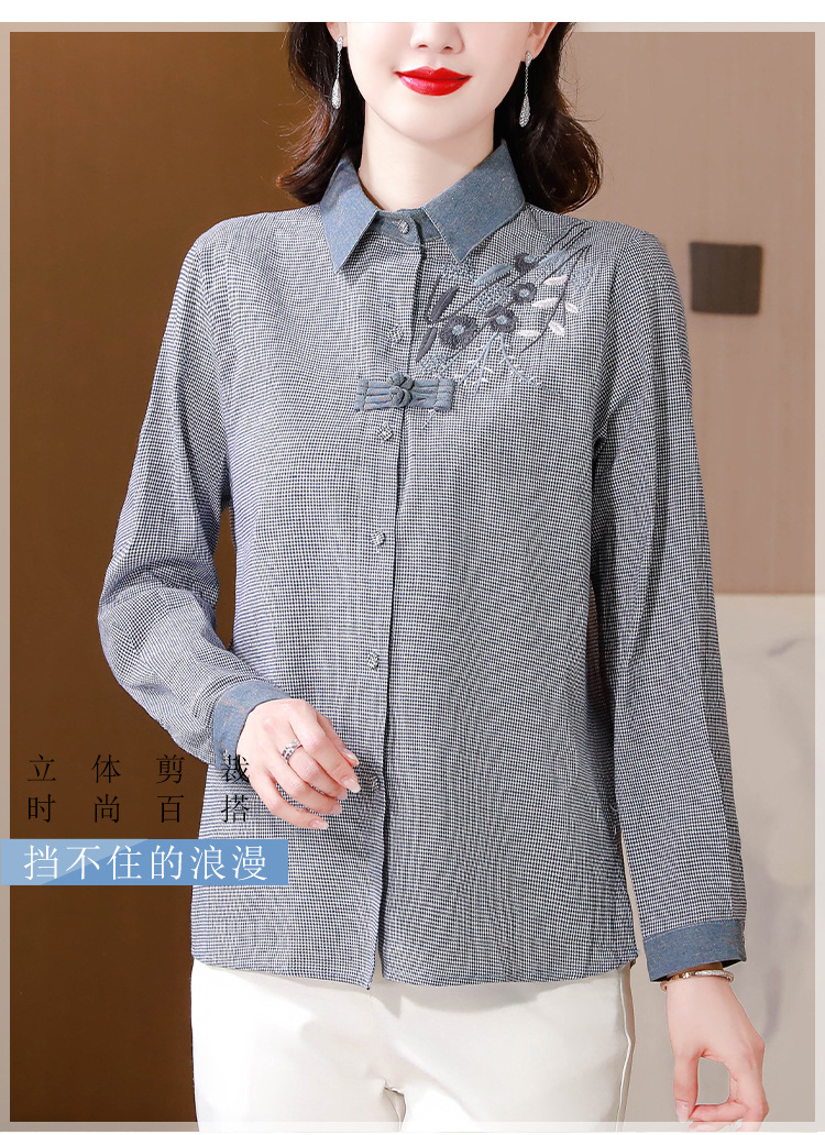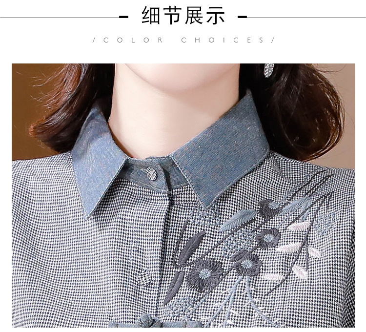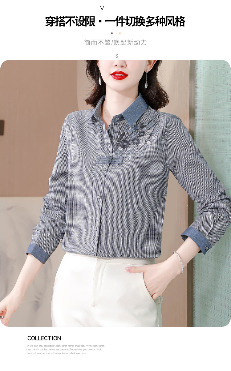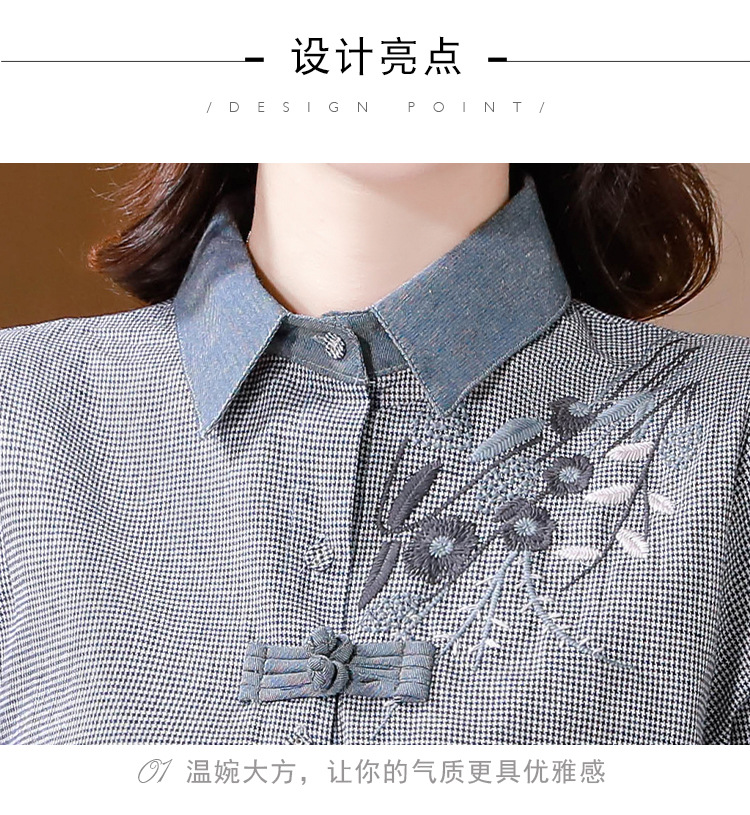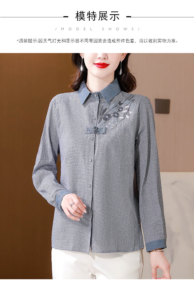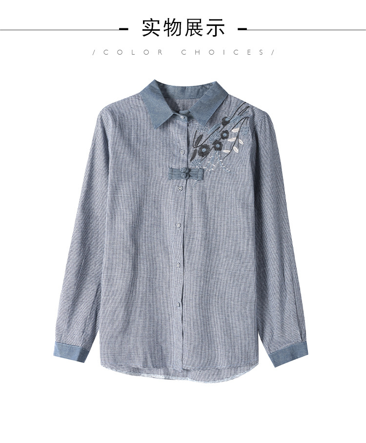 KQLA83N6618 2023年早秋文艺复古细格子衬衫女大码民族风刺绣国风盘扣上衣